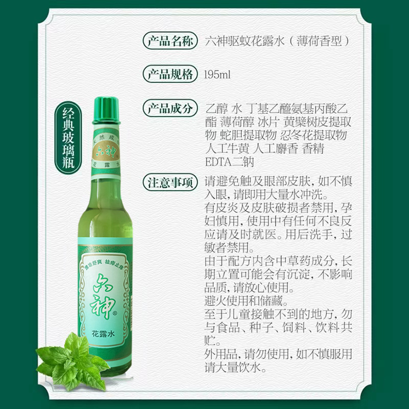 六神花露水经典195ml老款玻璃瓶驱蚊祛痱止痒清凉舒爽 批发 代发