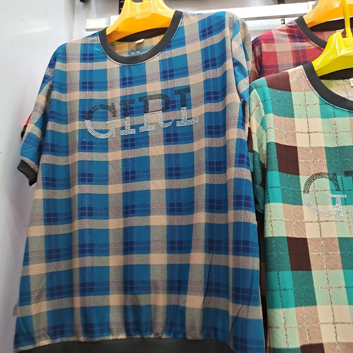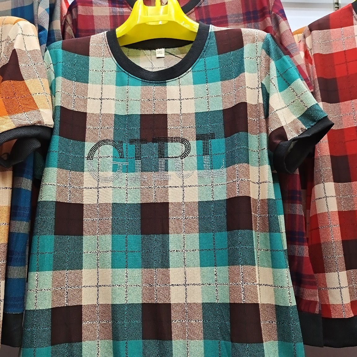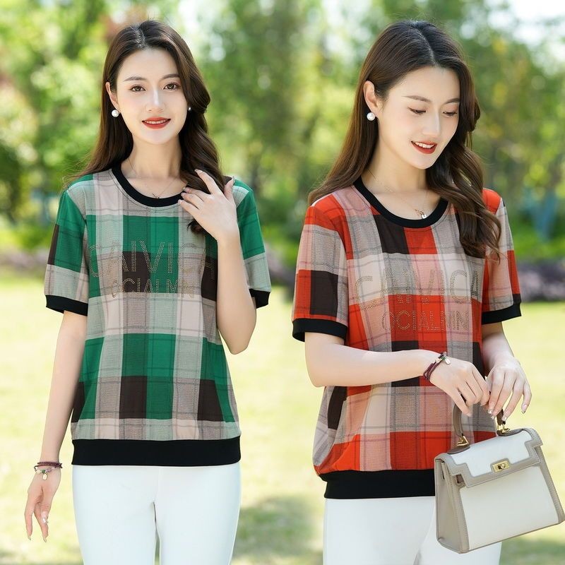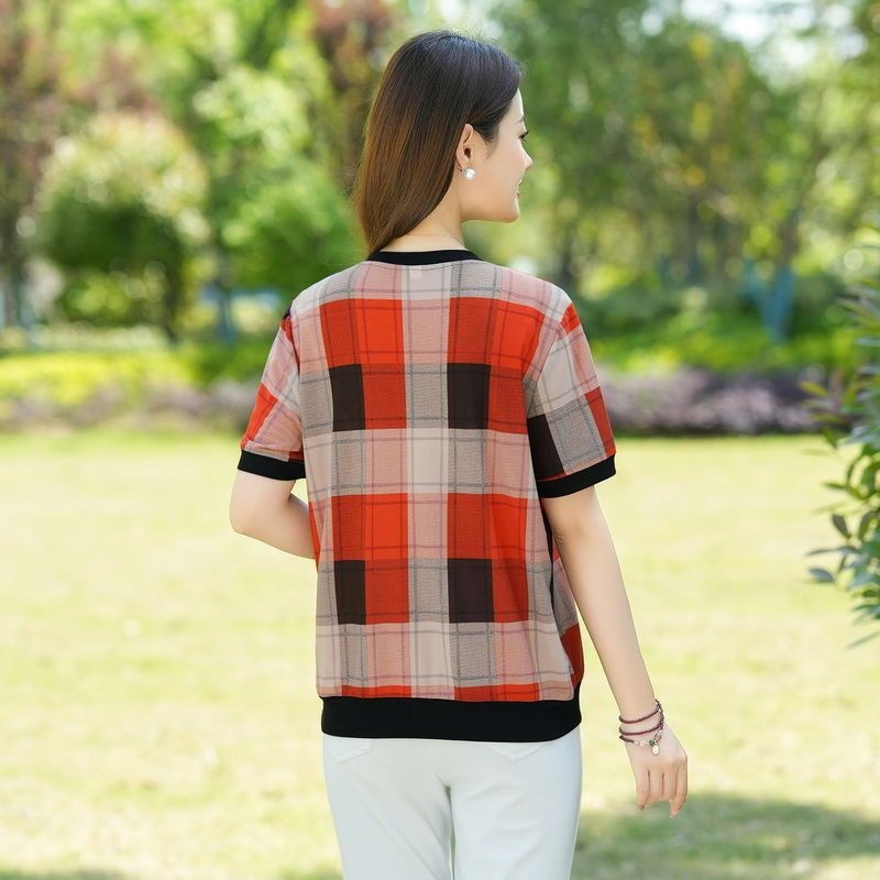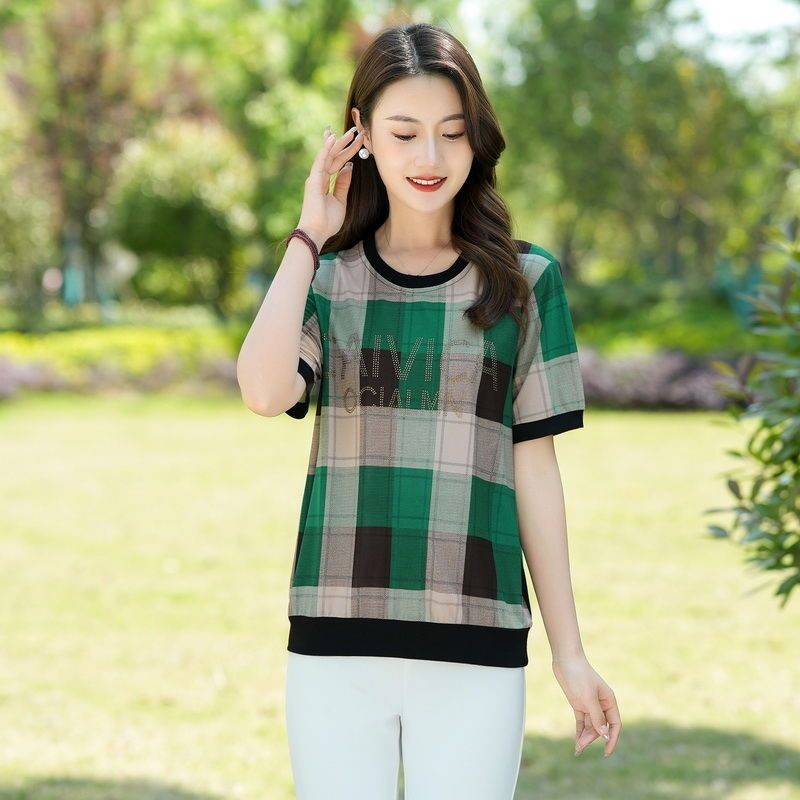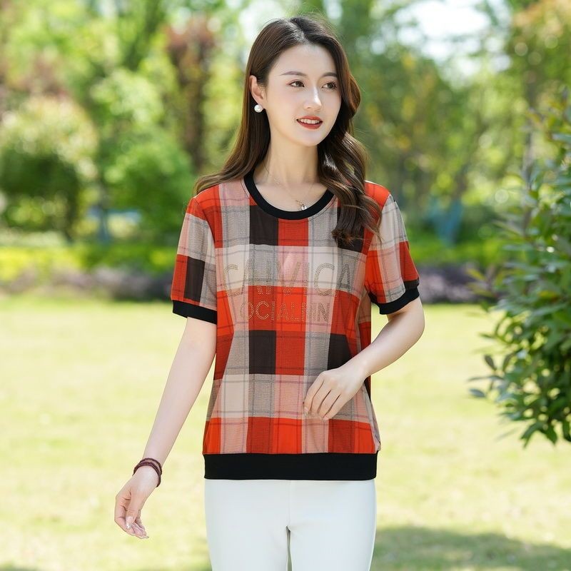 夏新款妈妈装短袖T恤女韩版百搭圆领宽松休闲高档格子上衣圆领衫