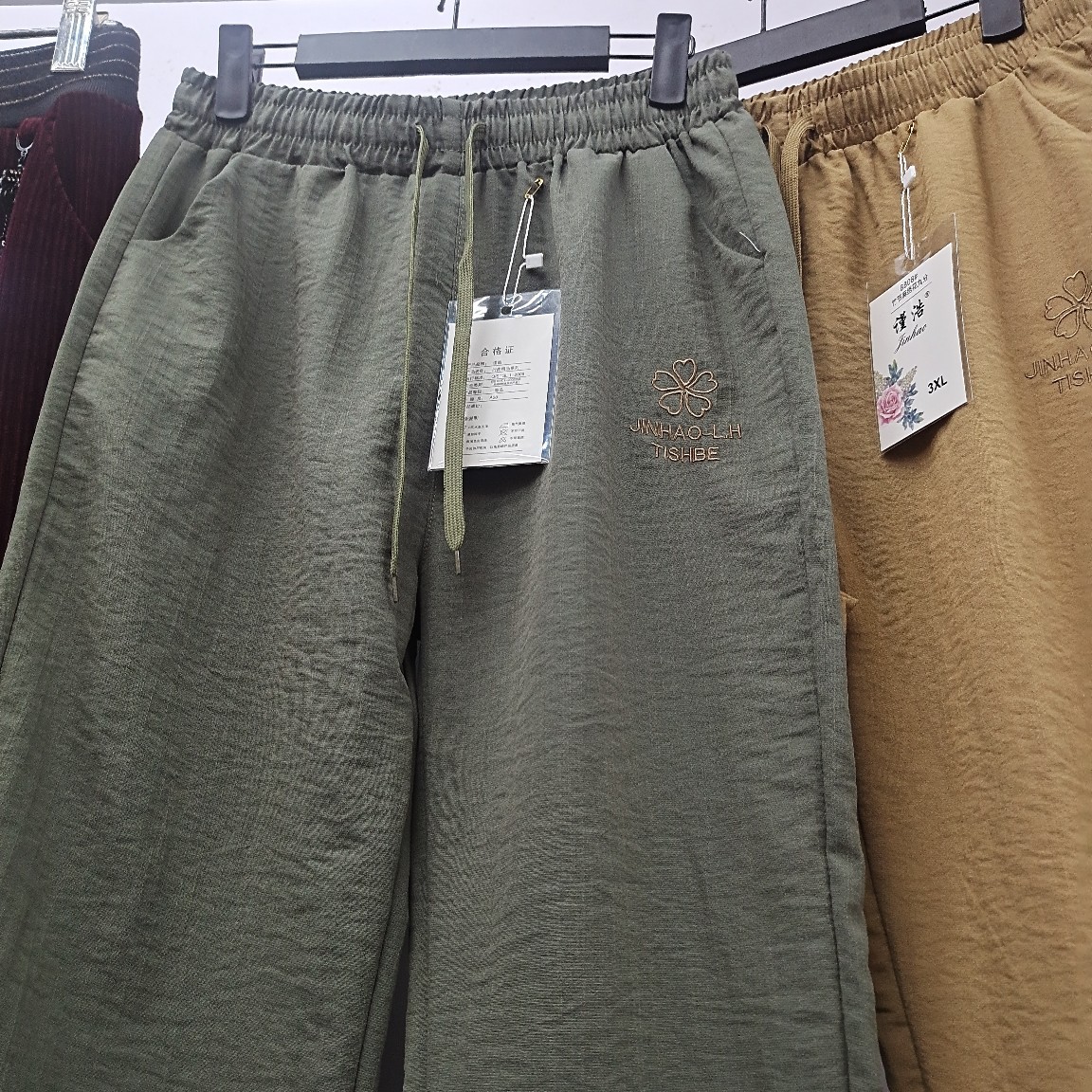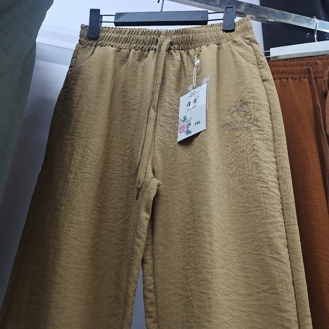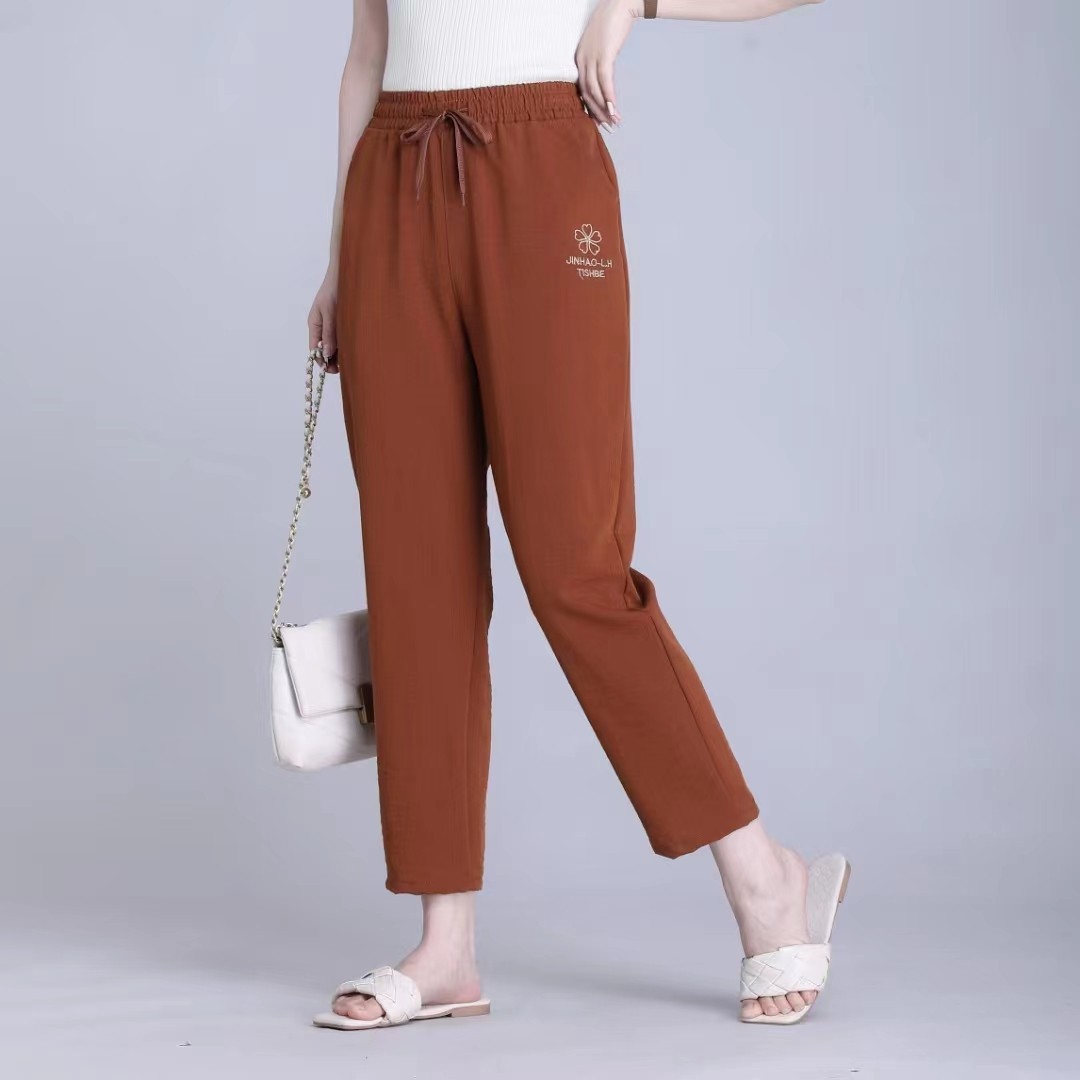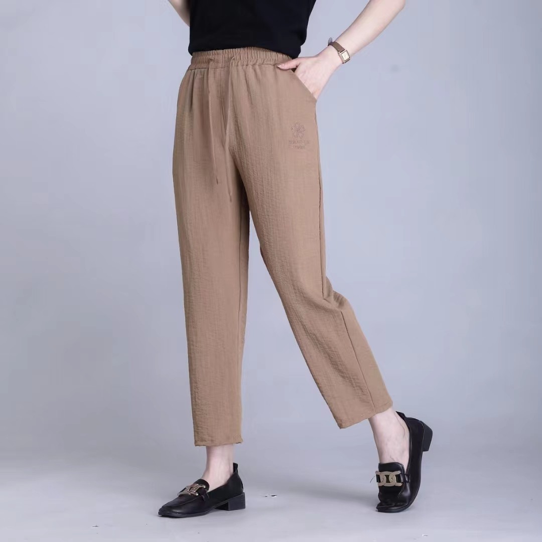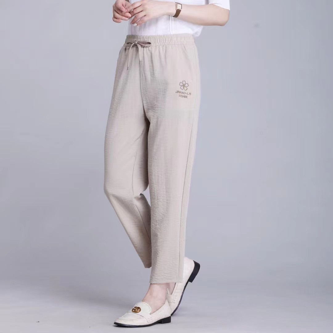 夏季新款妈妈裤竹节麻刺绣裤松紧腰宽松大码纯色休闲裤中老年女裤