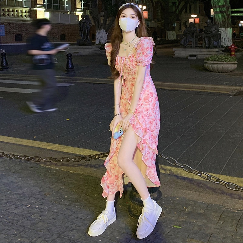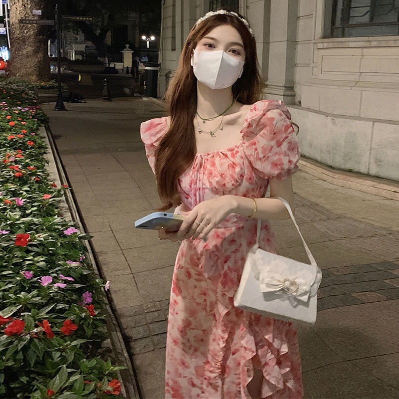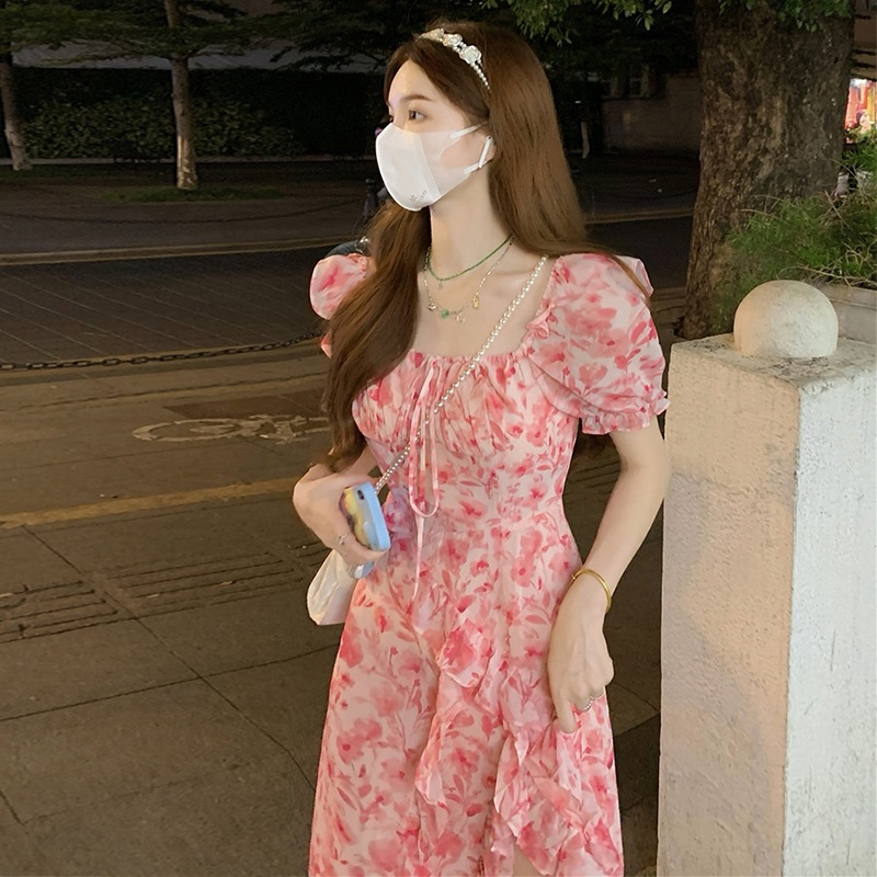 温柔风茶歇法式桔梗荷叶边长裙收腰开叉方领超仙气质碎花连衣裙夏