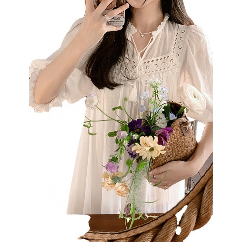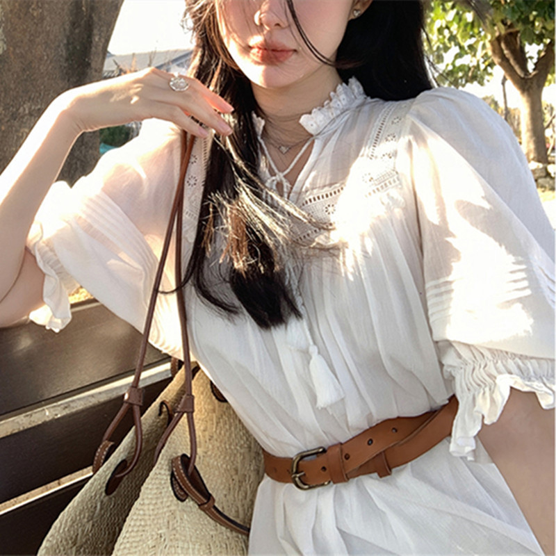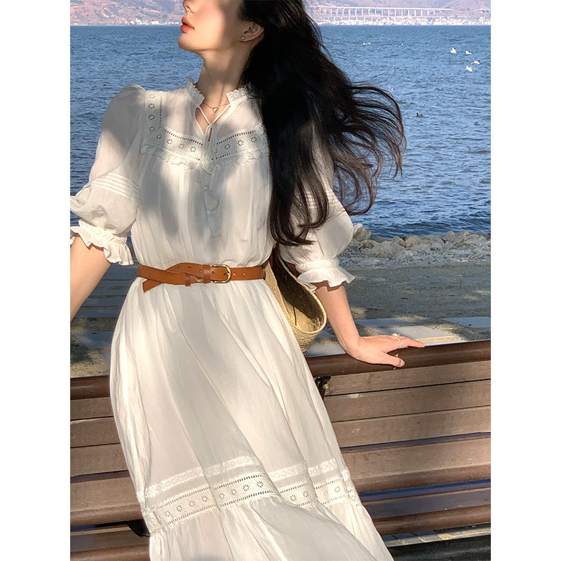 伊莎曼春夏新品2023连衣裙 法式蕾丝镂空泡泡袖气质度假风长裙女
