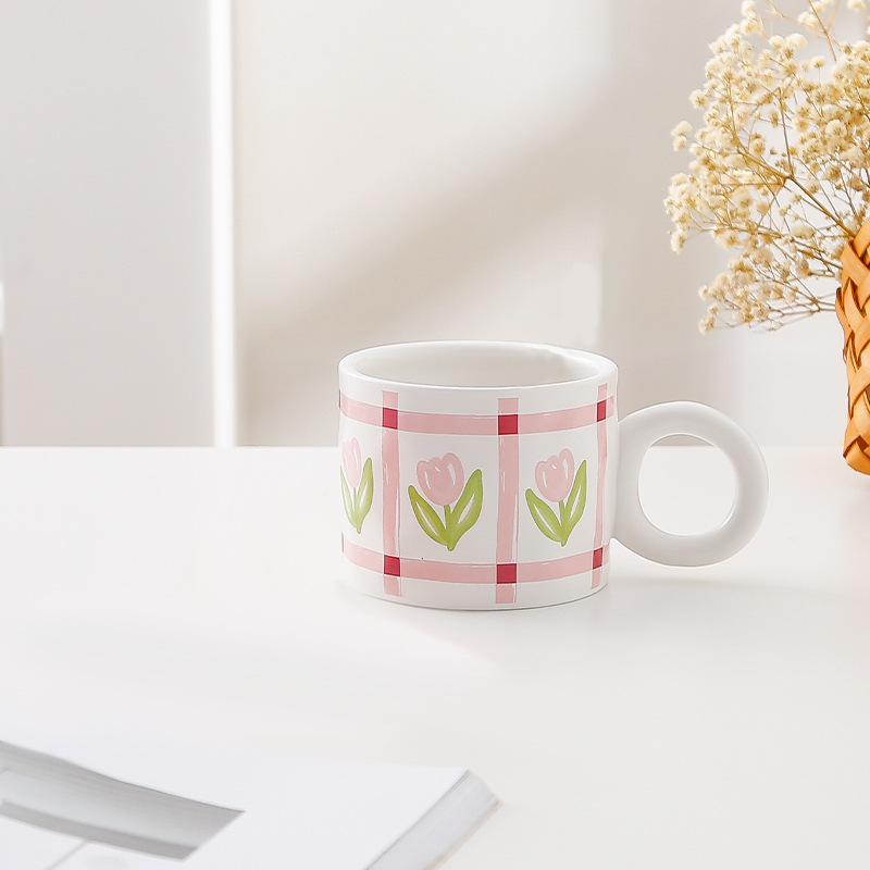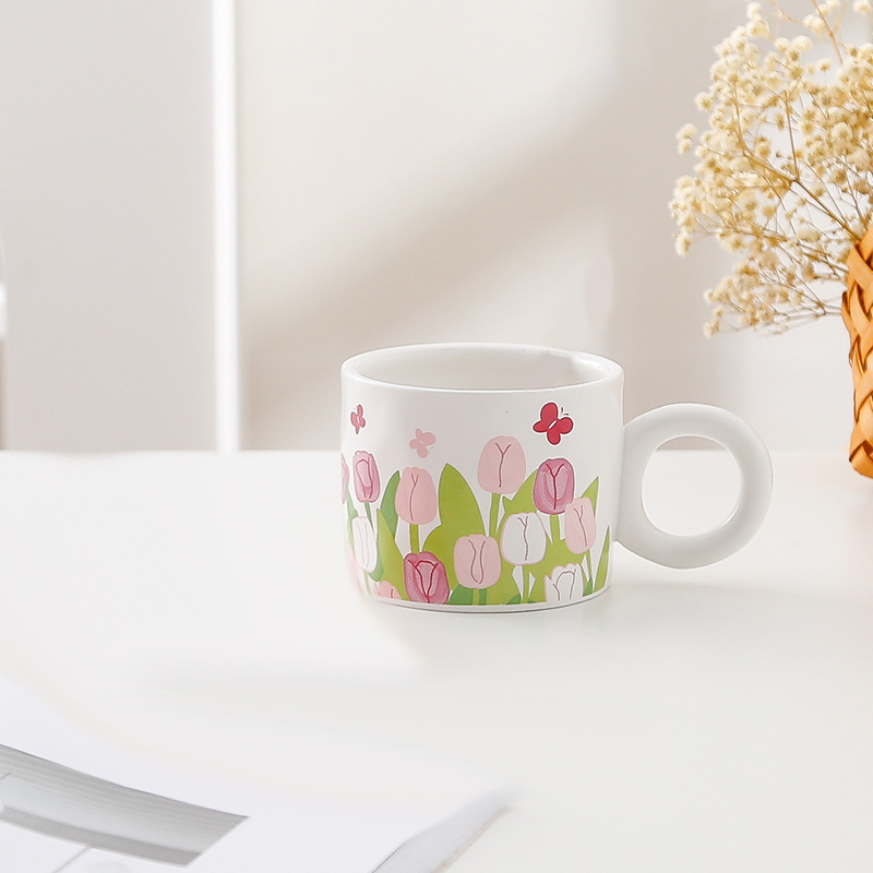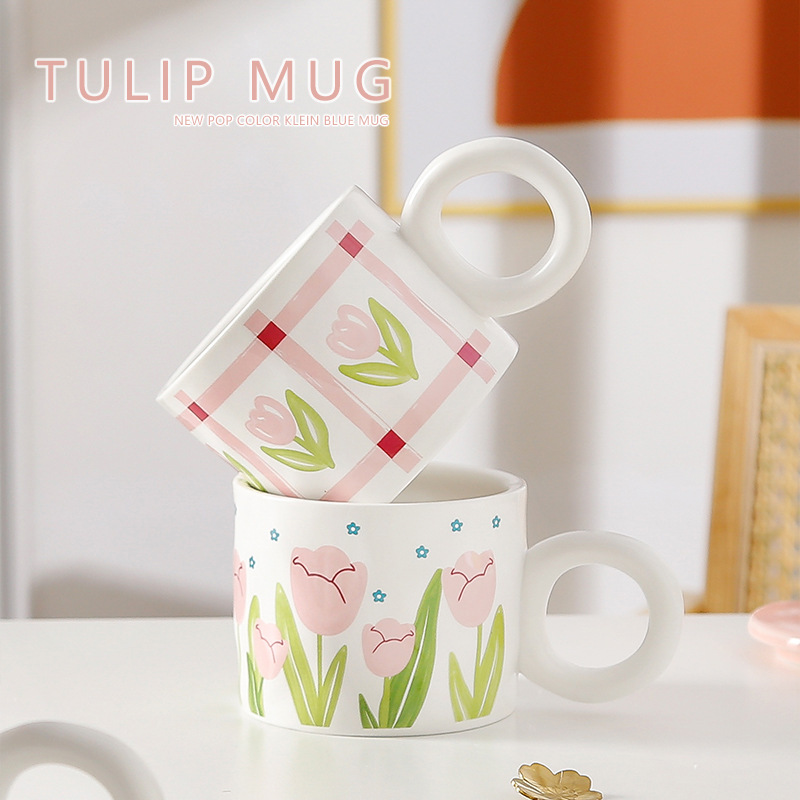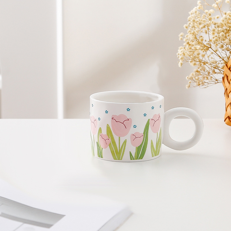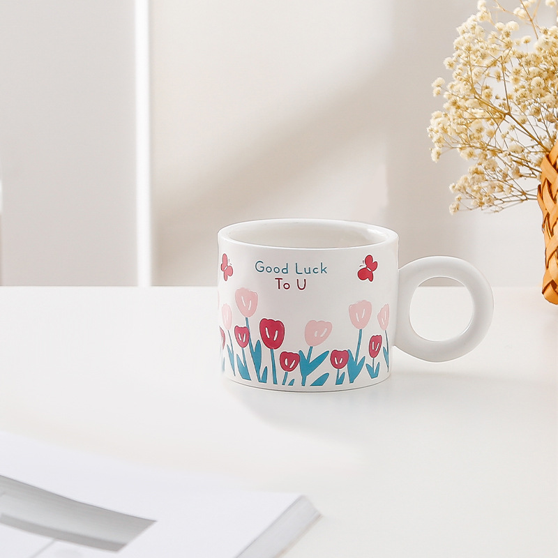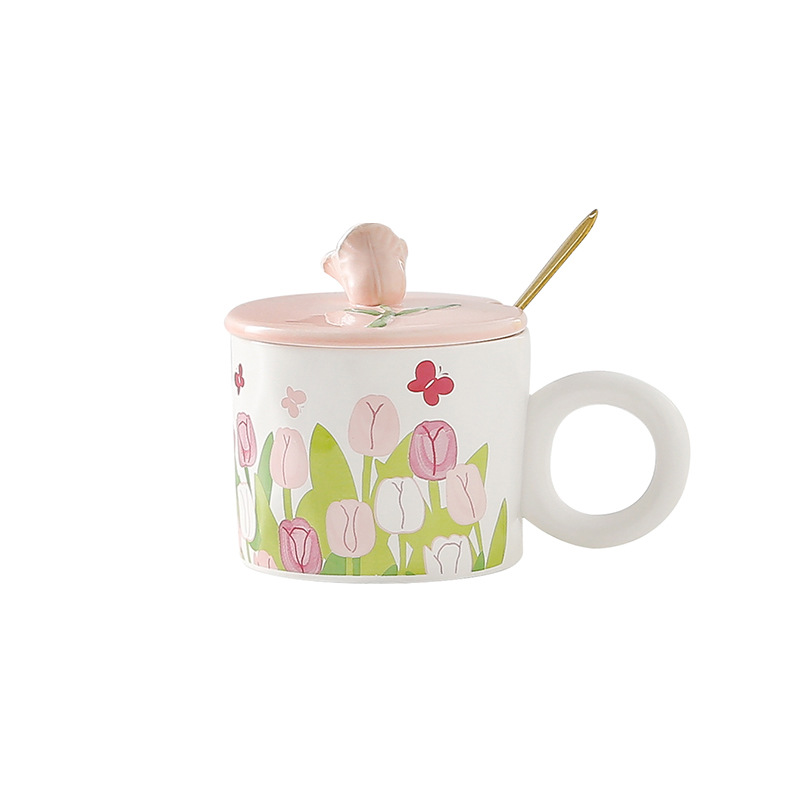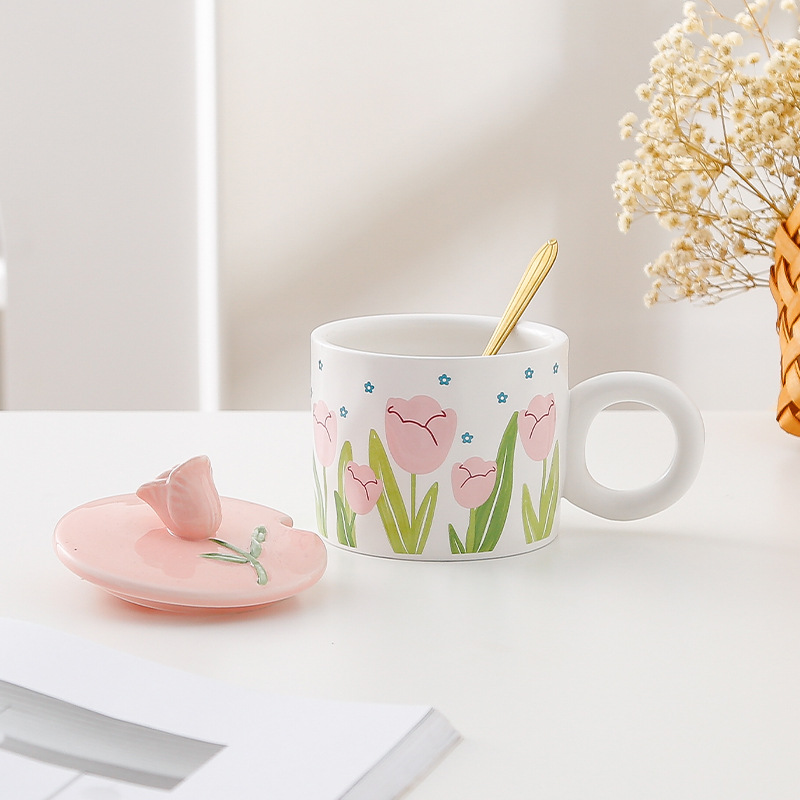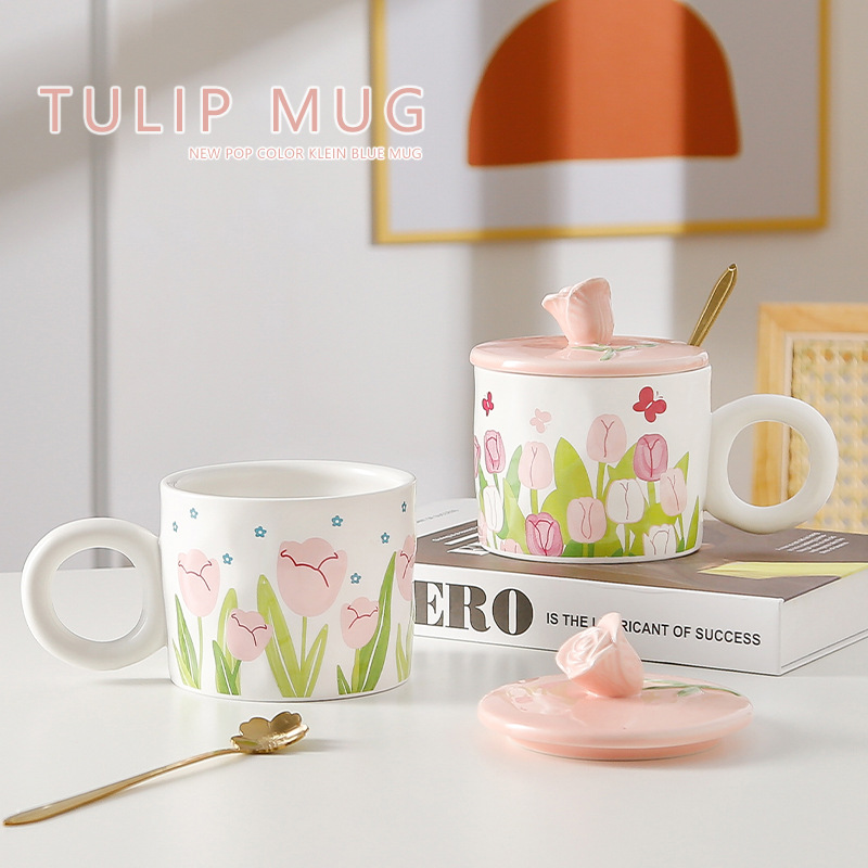 ins小清新郁金香水杯少女心学生带盖勺办公室马克杯家用陶瓷水杯