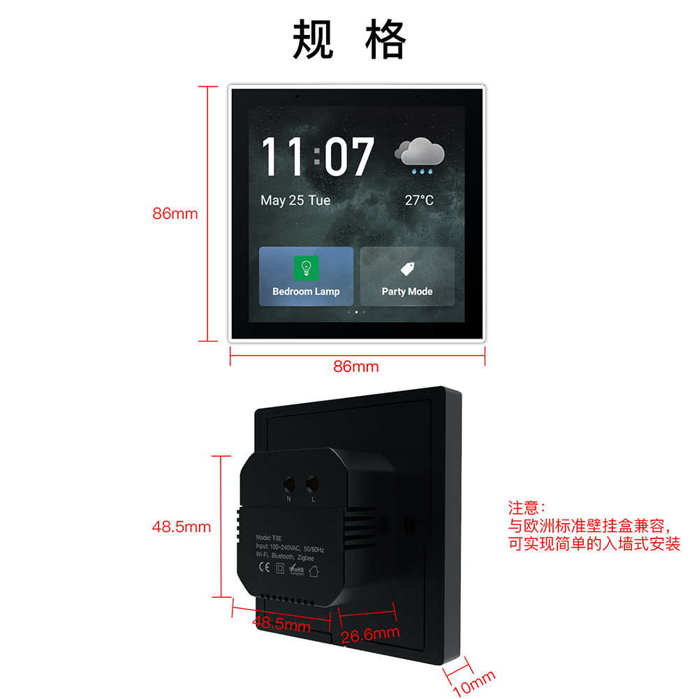 3.4 英寸高清 LCD,IPS,多点触摸屏设计,配合自动光传感器,非常适合现代智能生活方式,入墙式设计兼容欧洲标准壁箱,几秒钟内即可轻松安装。