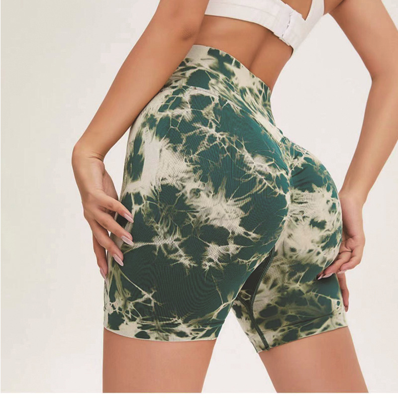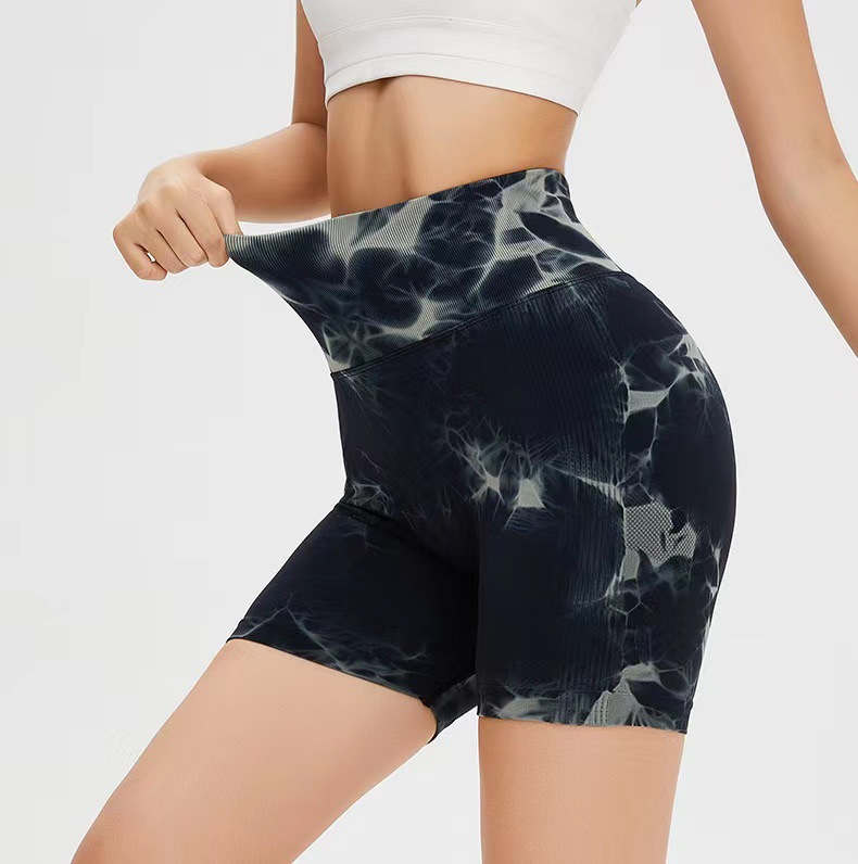 跨境热销蜜桃臀收腹扎染短裤女夏高腰弹力运动紧身无缝针织健身裤