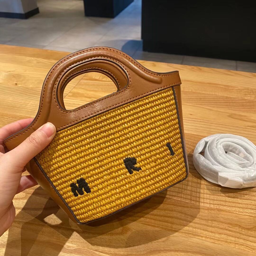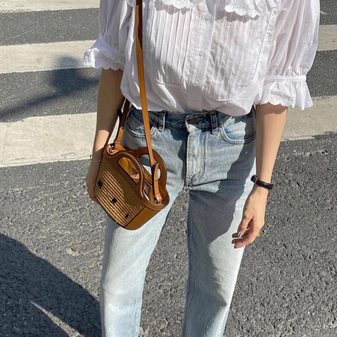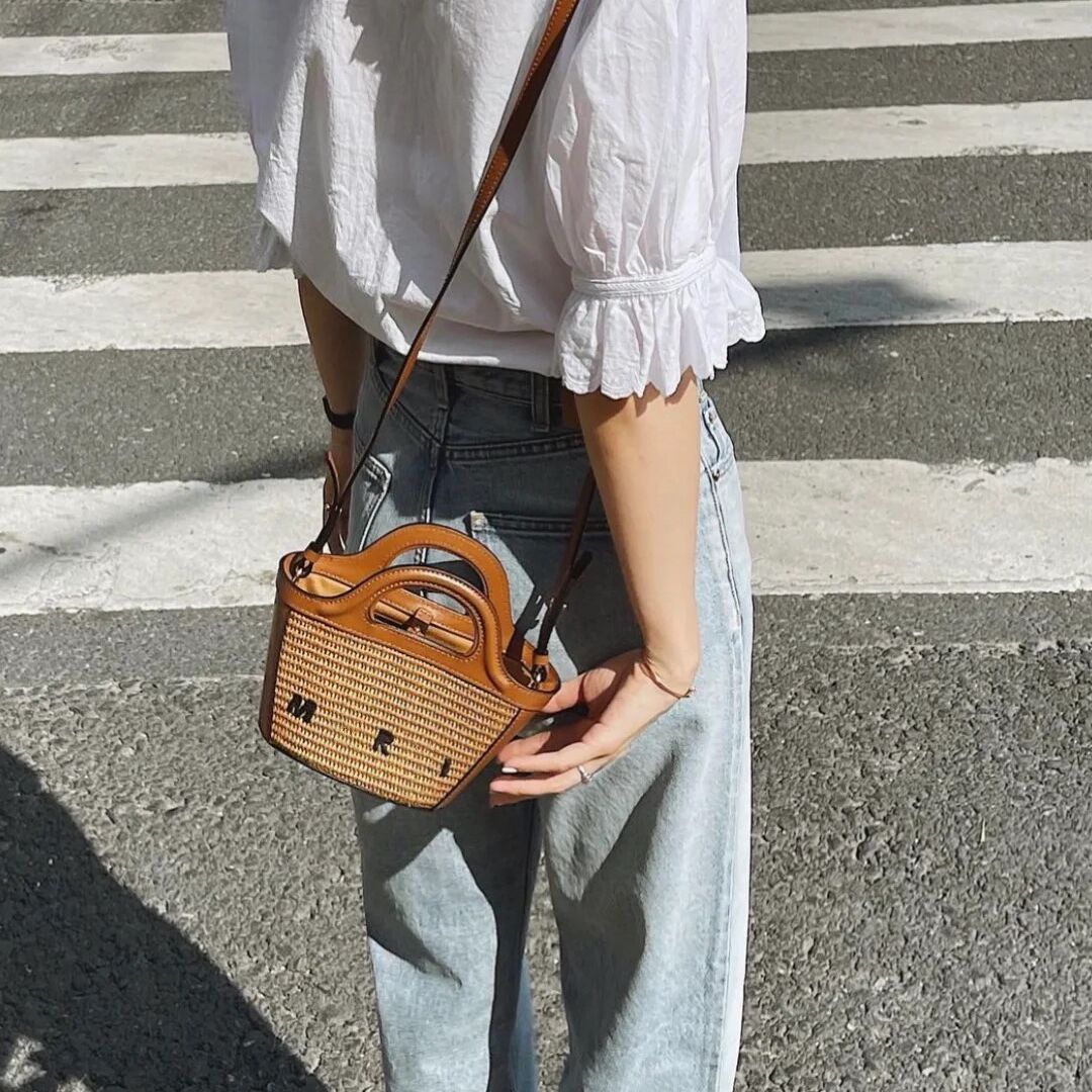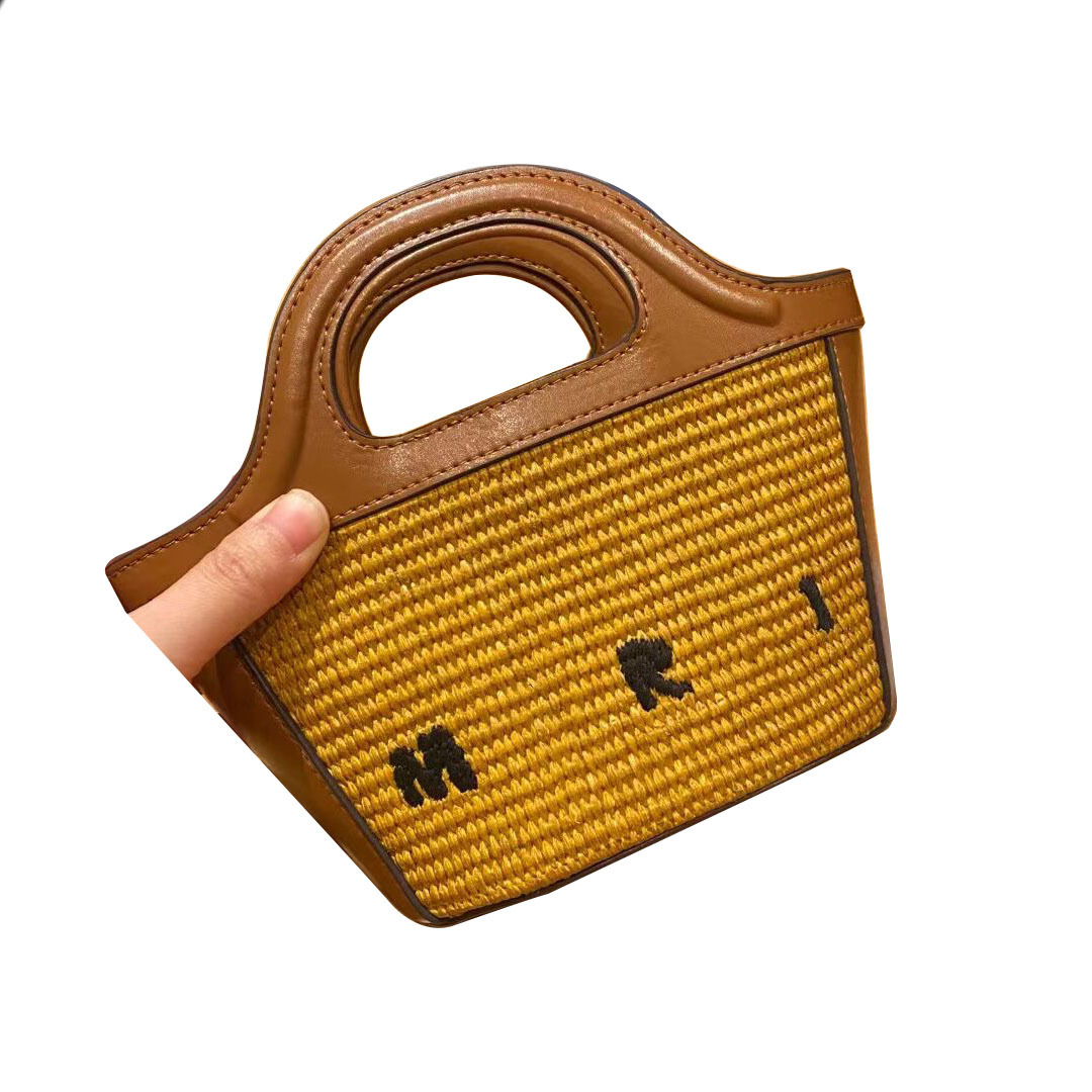 2023夏新款玛尼编织包草编菜篮子沙滩包百搭手提斜挎女包拼接牛皮