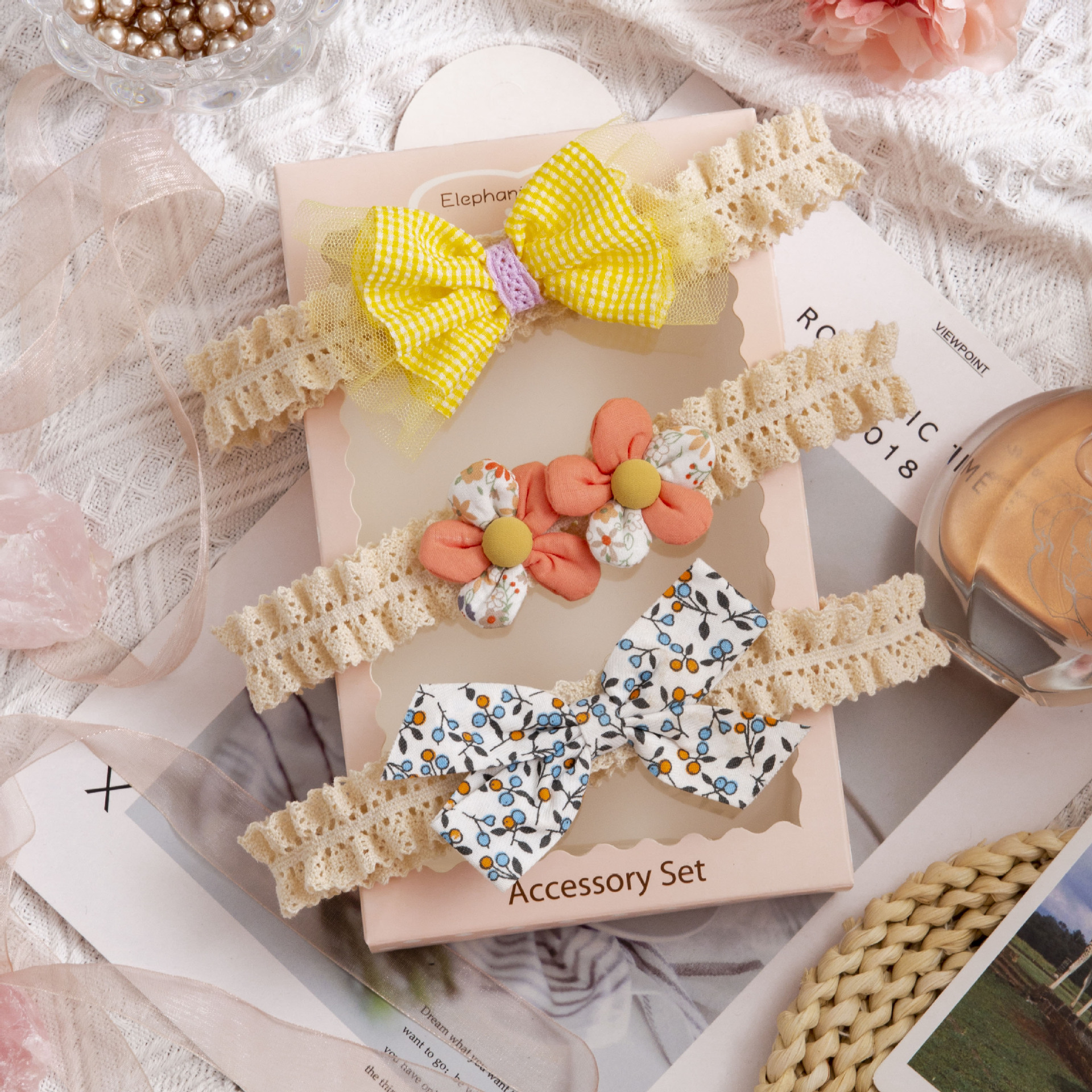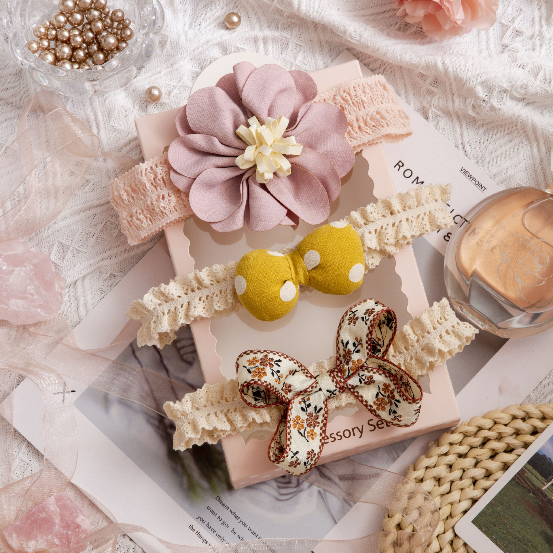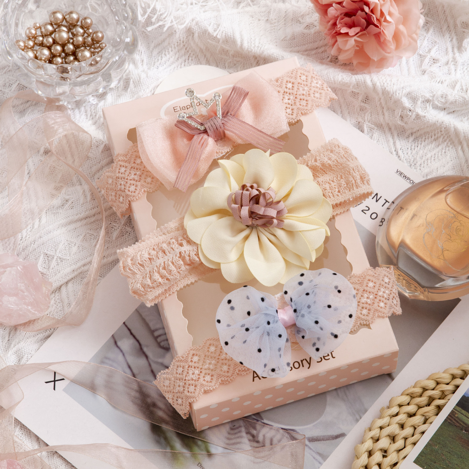 欧美蝴蝶结花朵头带儿童蕾丝头花发饰婴儿满月百天三件套宝宝发带
