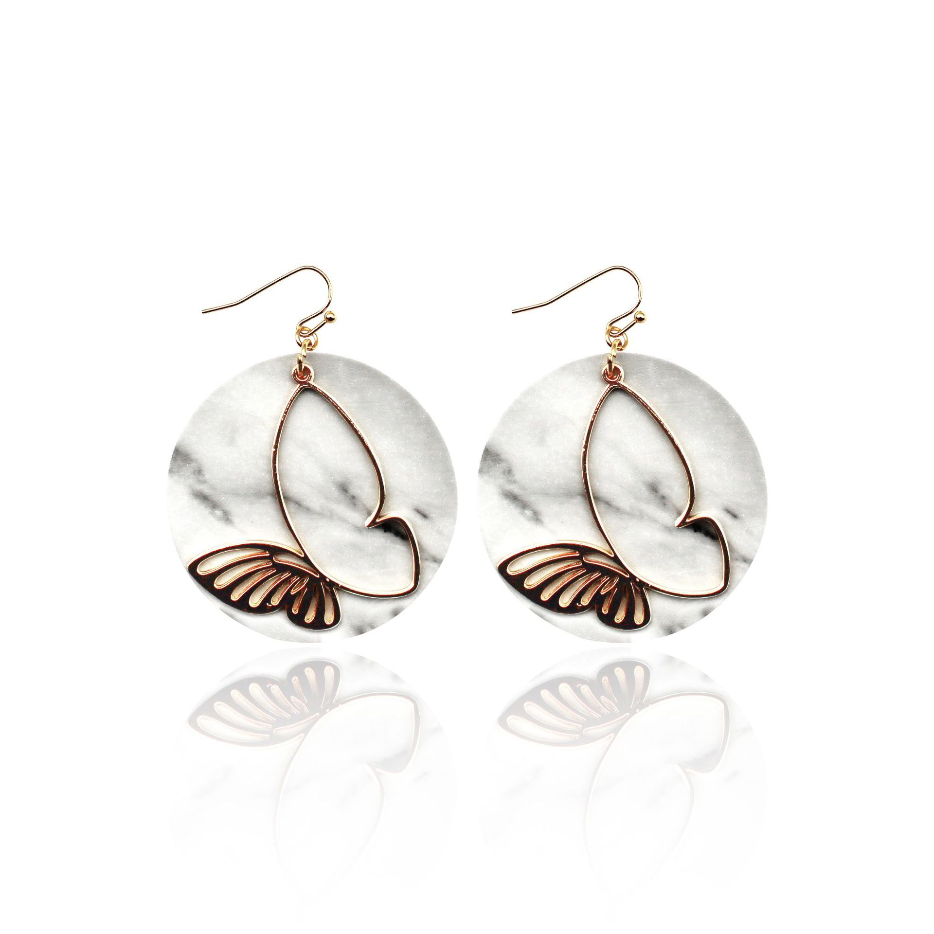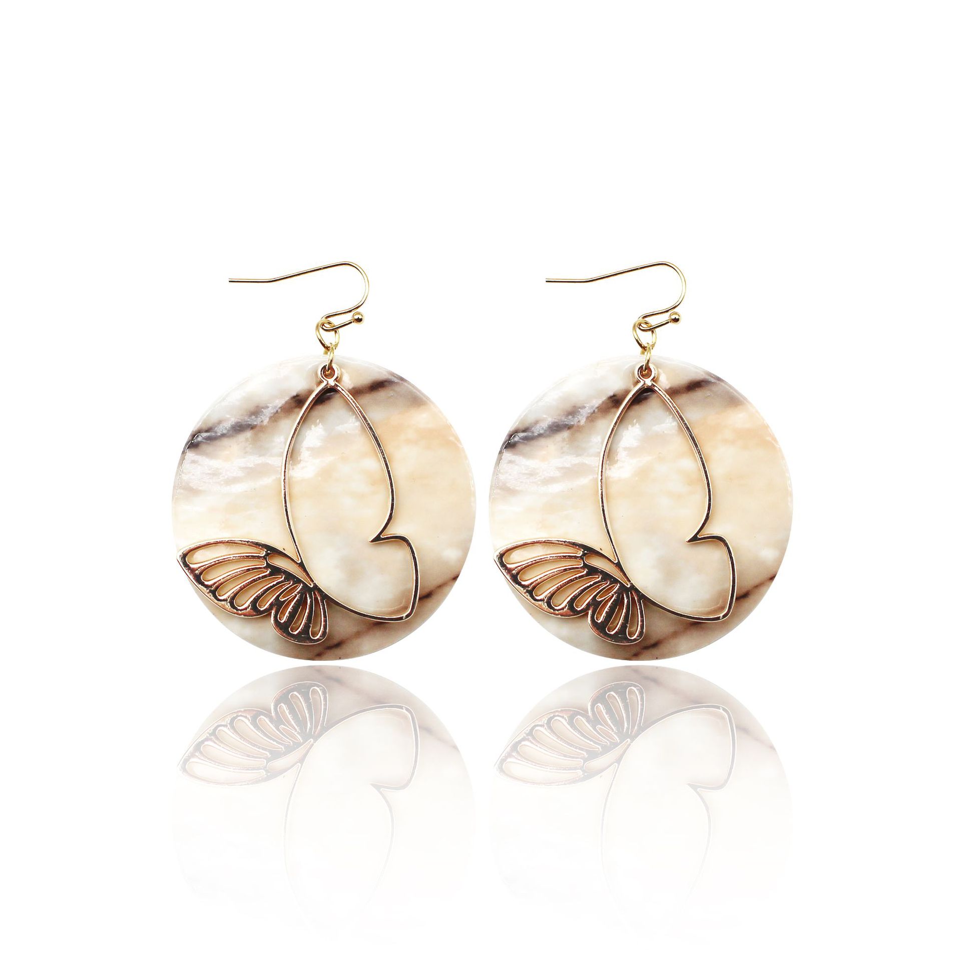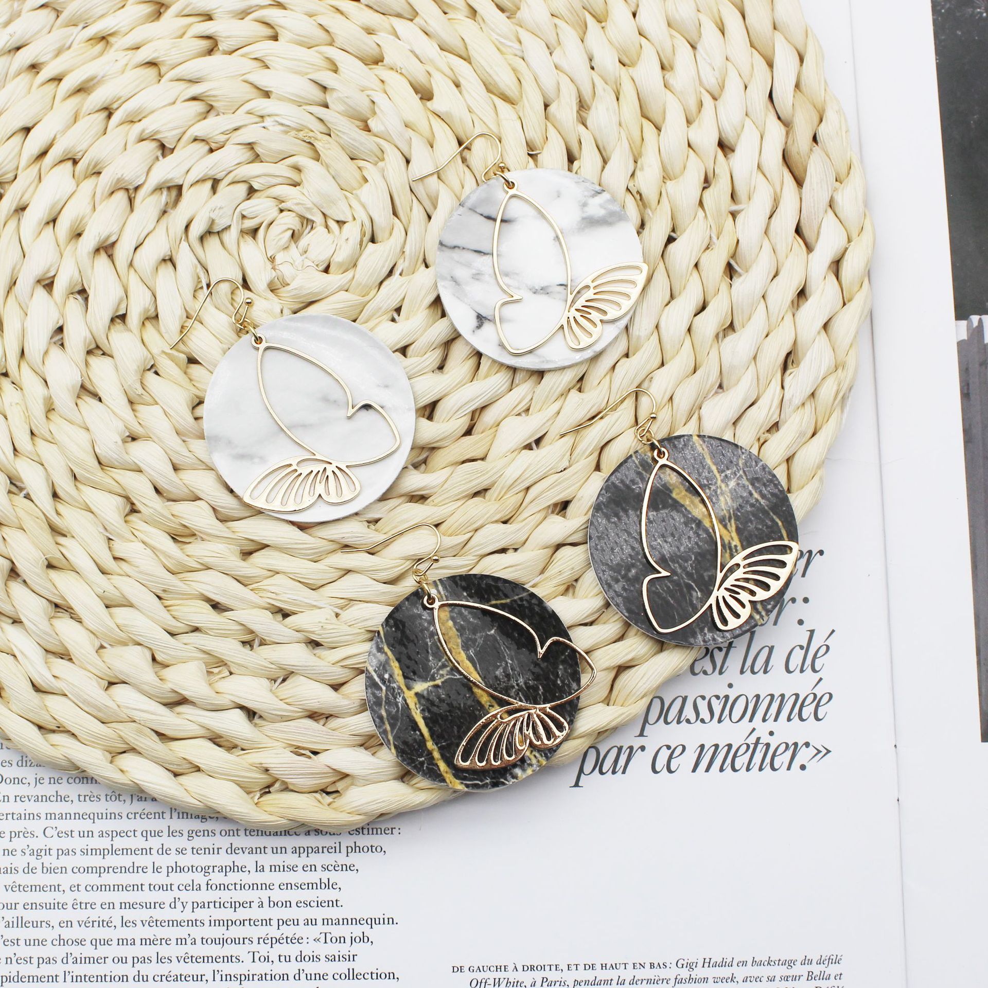 自然大理石纹路皮革PU耳环合金蝴蝶圆形跨境欧美亚马逊