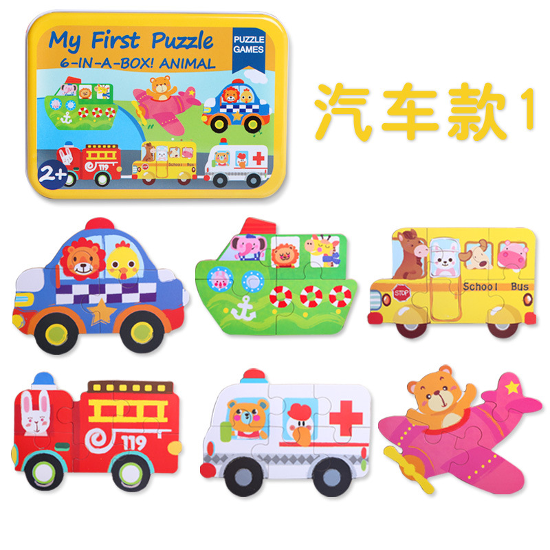 儿童六合一动物交通工具人物铁盒装拼图早教玩具木制拼板益智拼图
