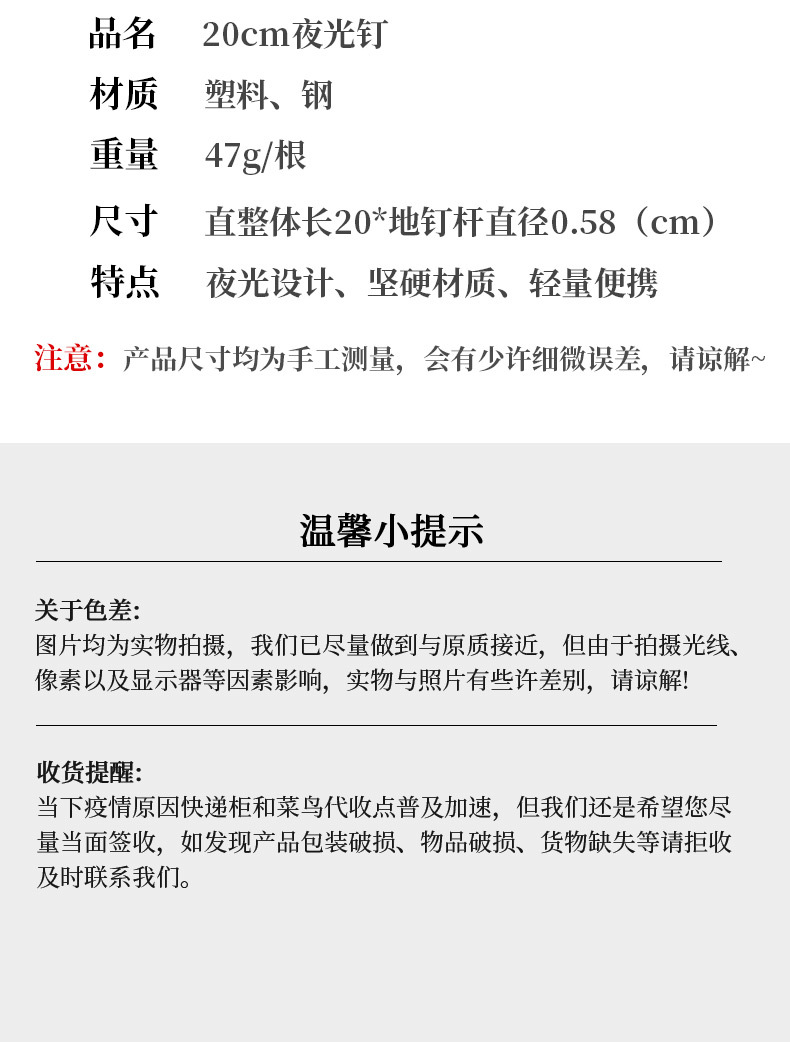 户外帐篷天幕地钉野营露营夜光钉20cm加强帐篷防风钉荧光固定钢钉