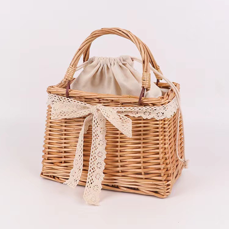 厂家批发珍珠手提伴手礼藤编篮结婚伴娘方形柳编礼品篮户外礼物