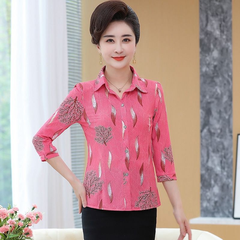 夏季薄款冰丝衬衫女长袖4050妈妈春秋装衬衣中老年人女装弹力上衣
