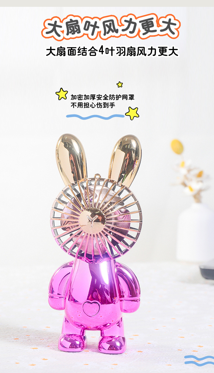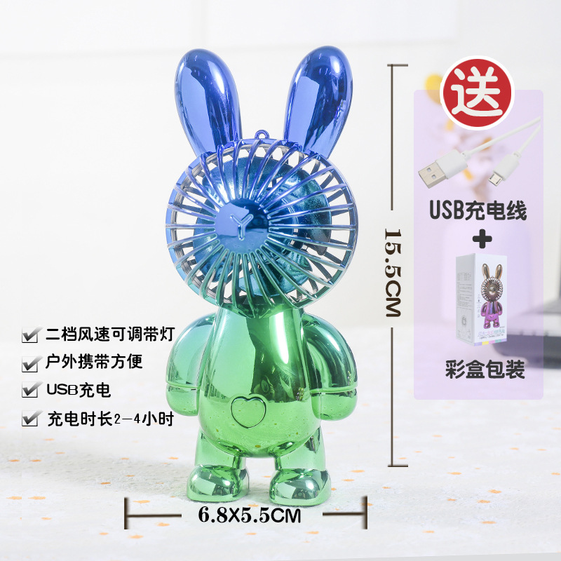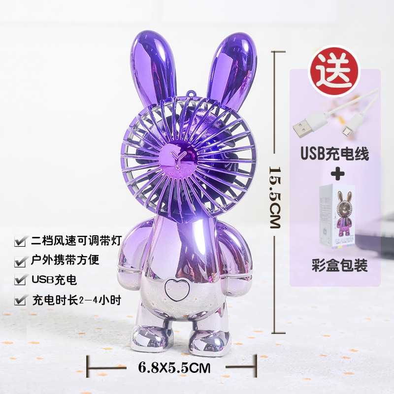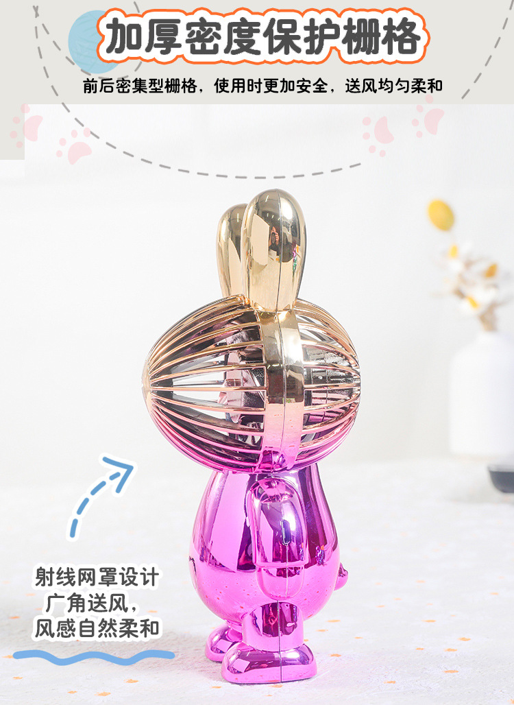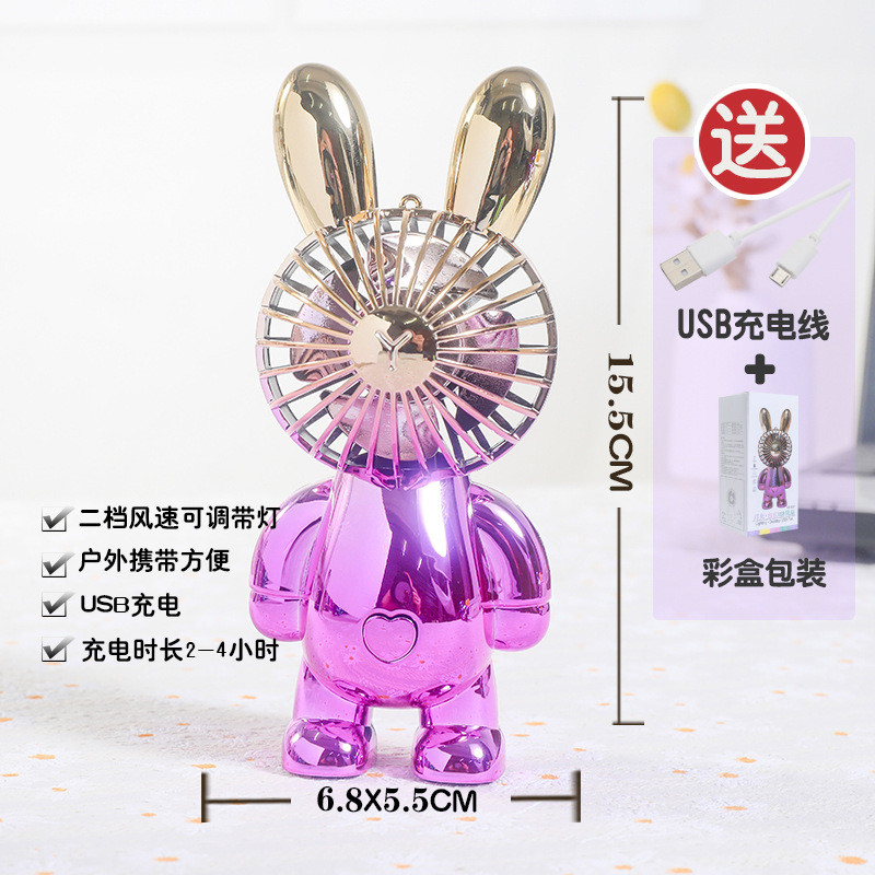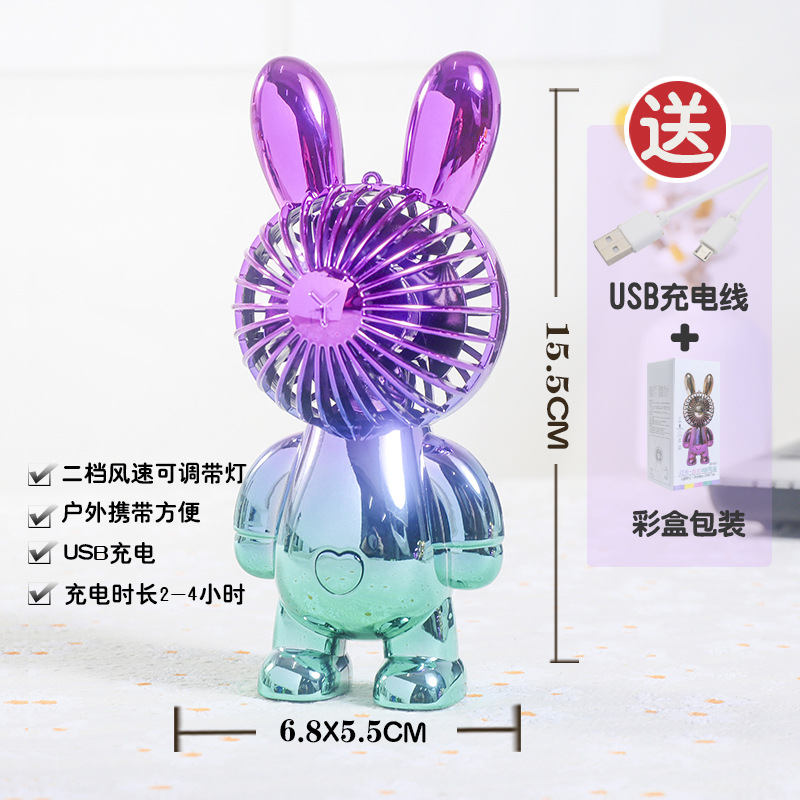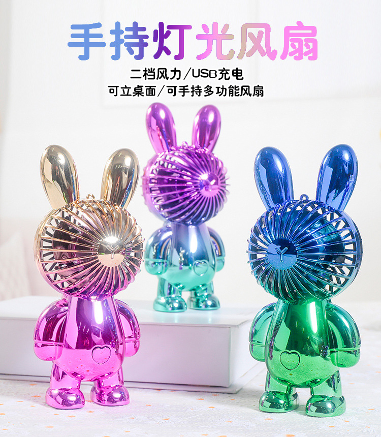 网红卡通小兔子渐变色电镀手持灯光usb充电风扇 户外可爱口袋风扇