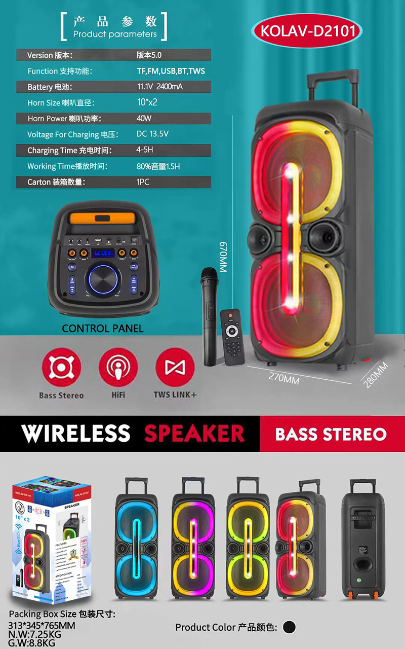 KOLAV-D2101唱歌音响一体10寸插卡户外无线蓝牙音箱高音质低音炮