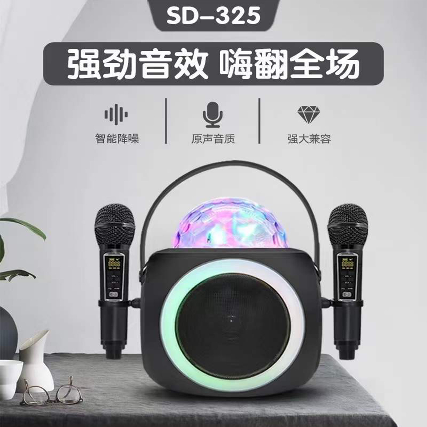 SD325家庭无线蓝牙音箱套装音响麦克风一体机LED灯光效果唱歌音响