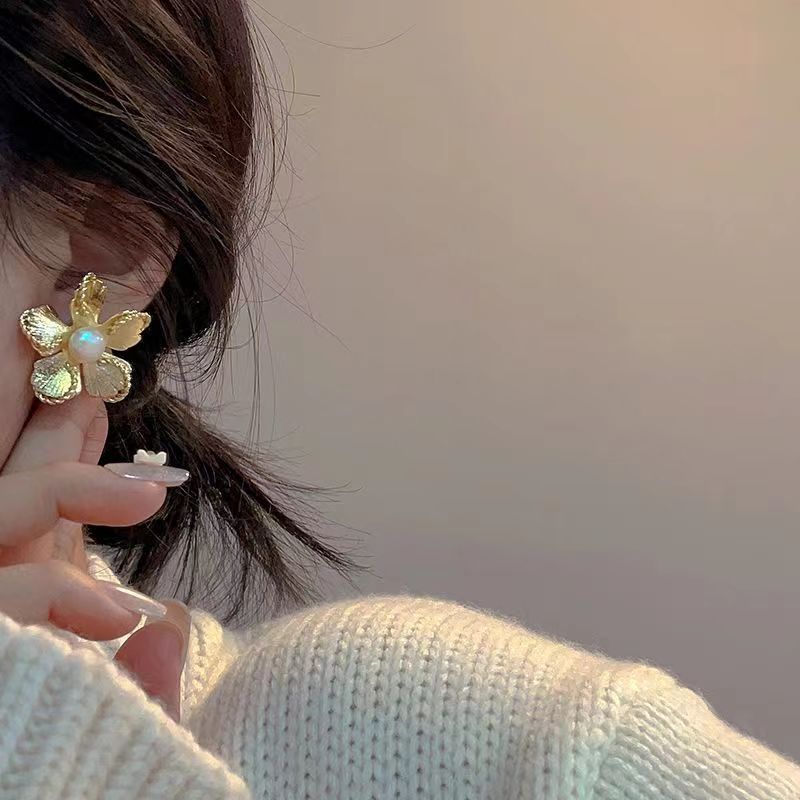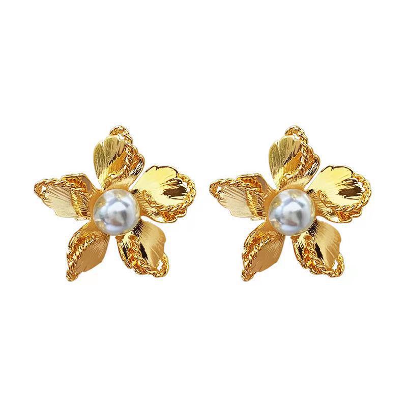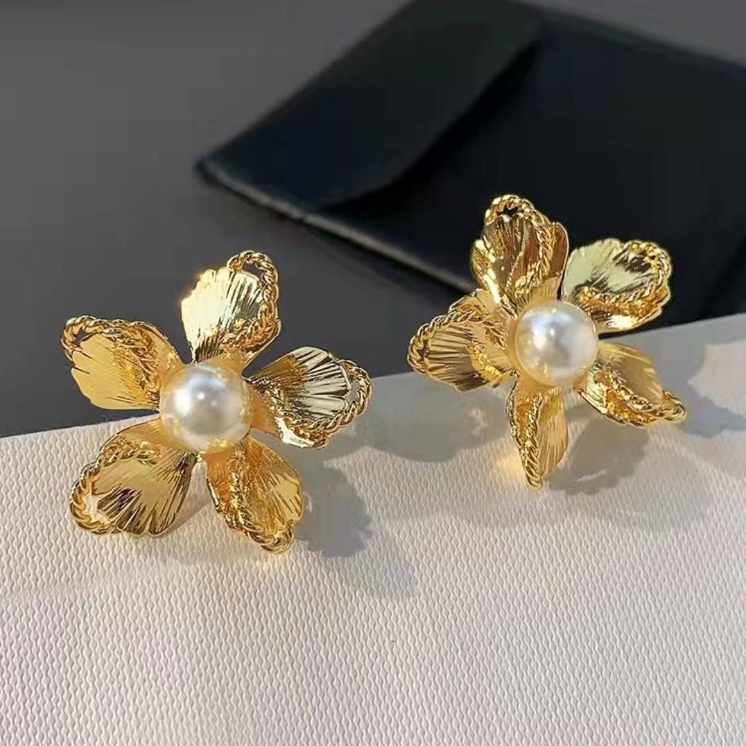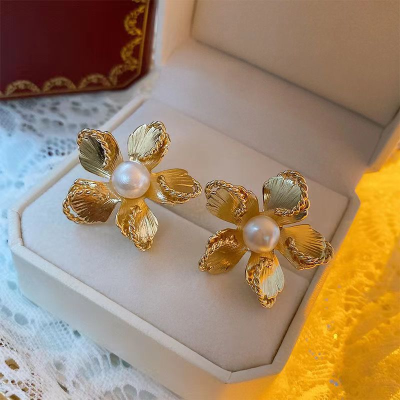 法式珍珠耳环女复古欧美夸张金色花朵耳钉小众设计高级感气质耳环