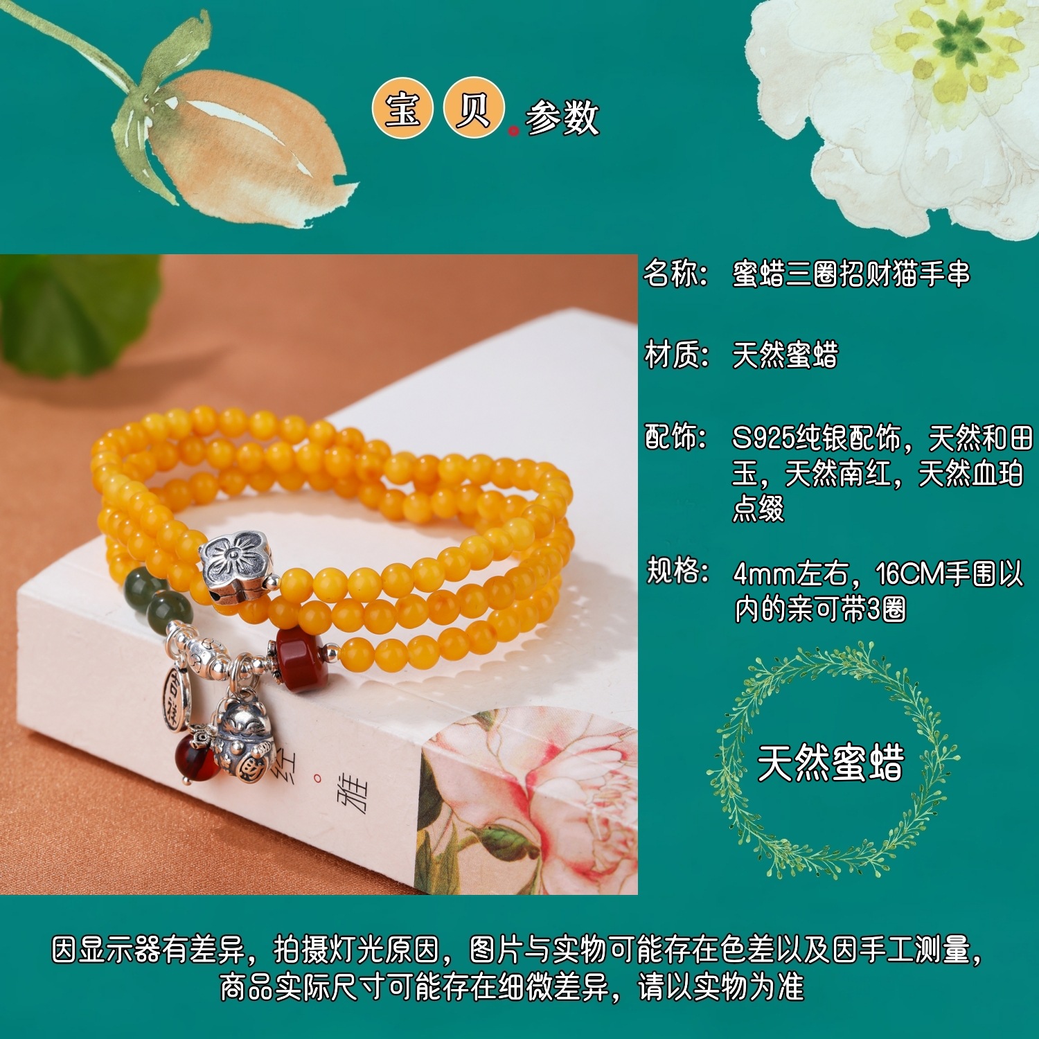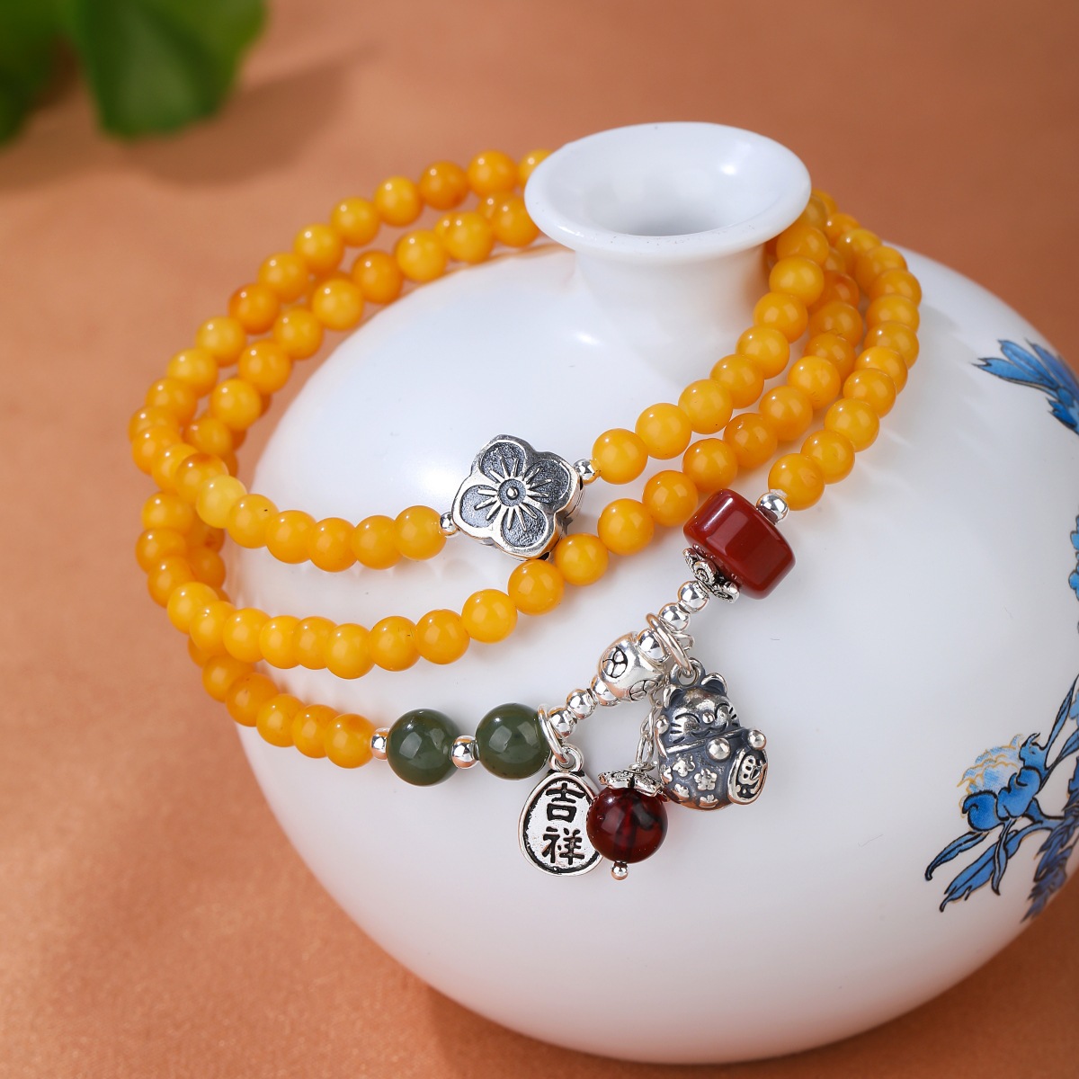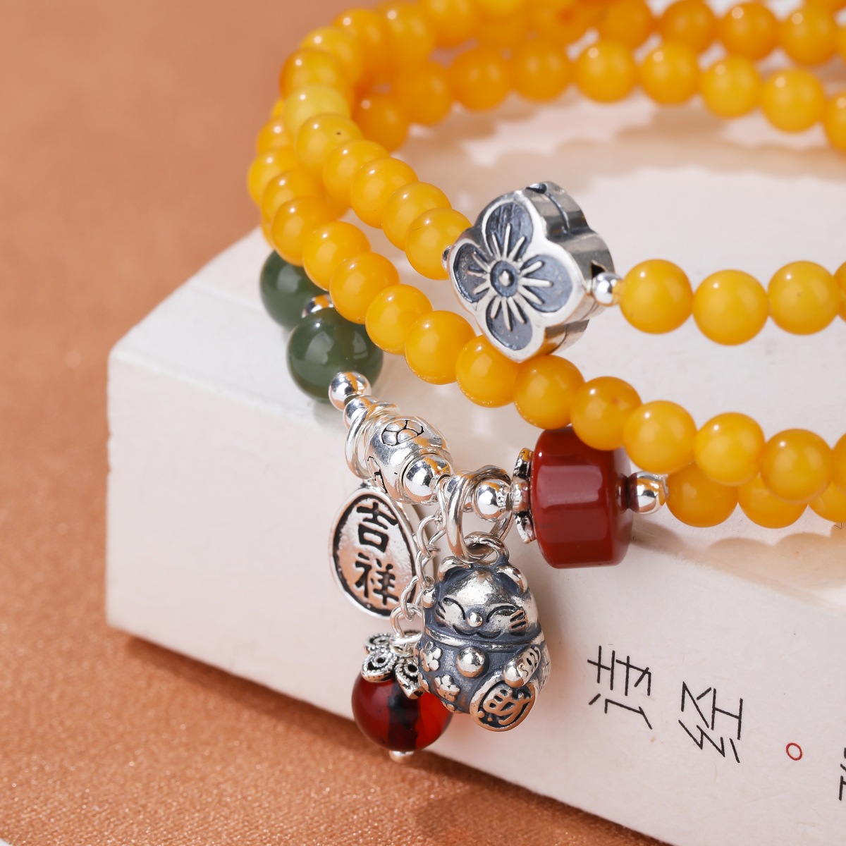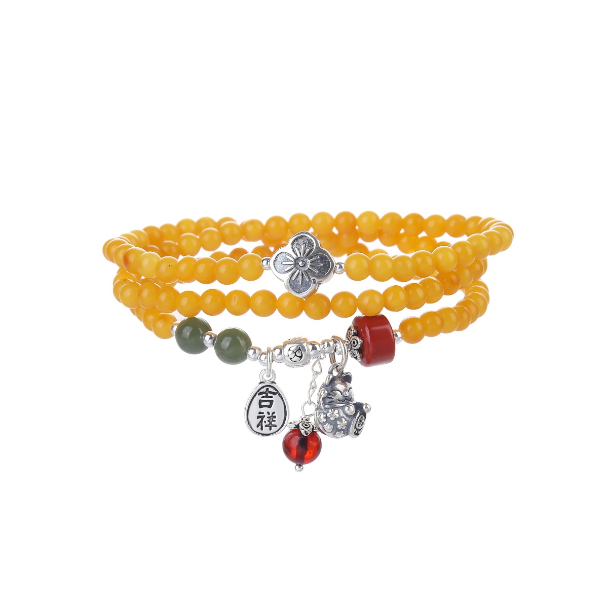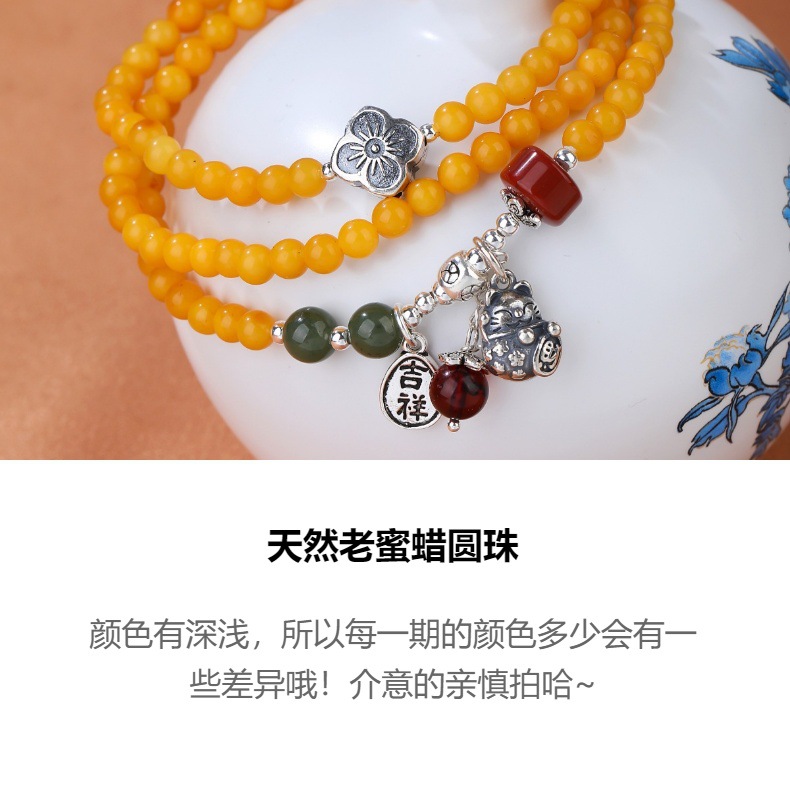 天然老蜜蜡三圈手链女s925银配饰多圈手串吉祥猫复古银配饰