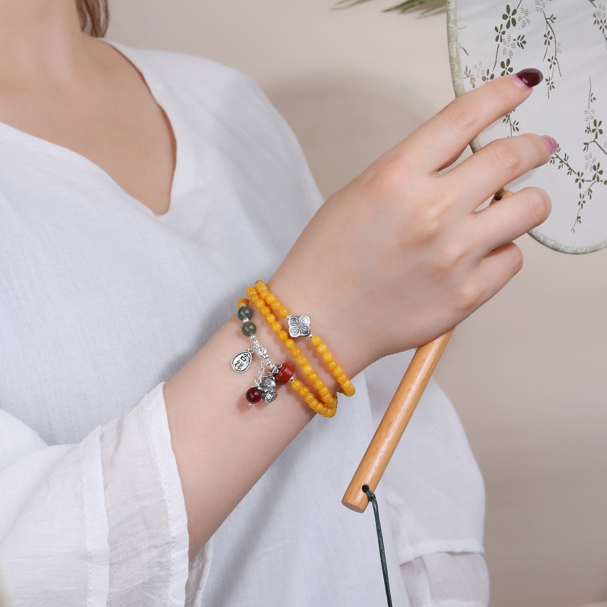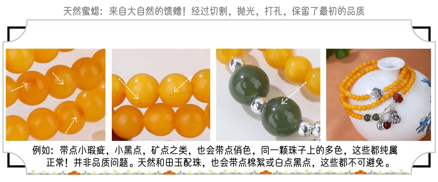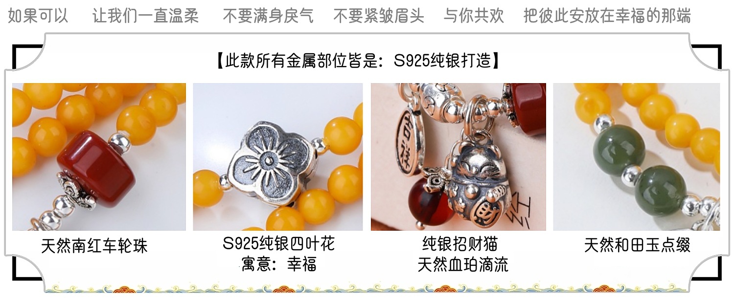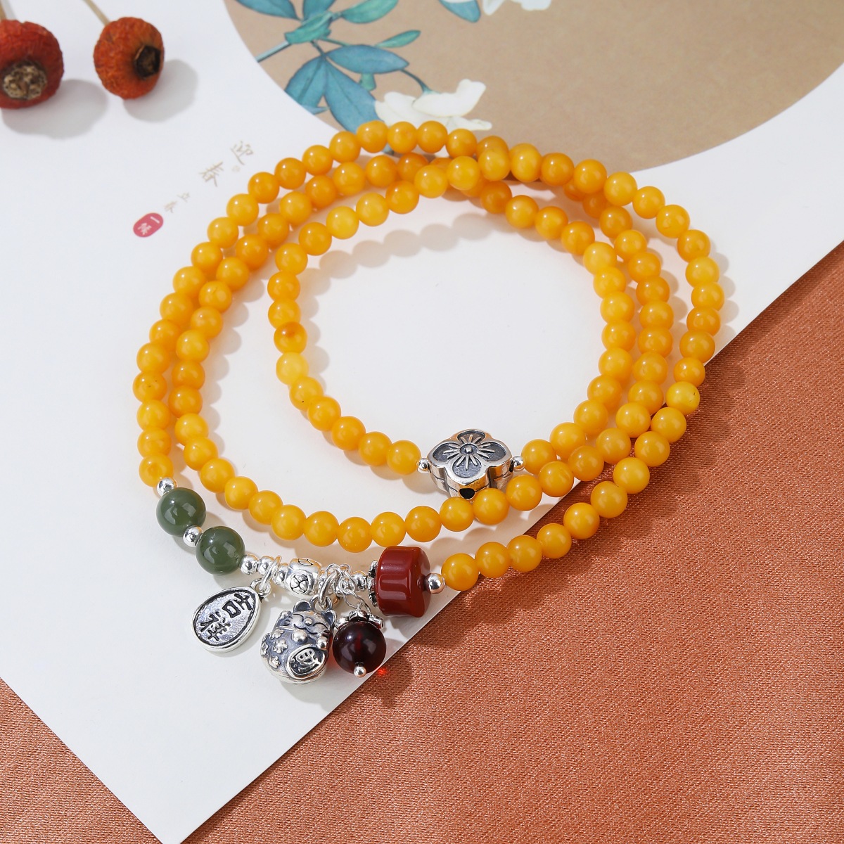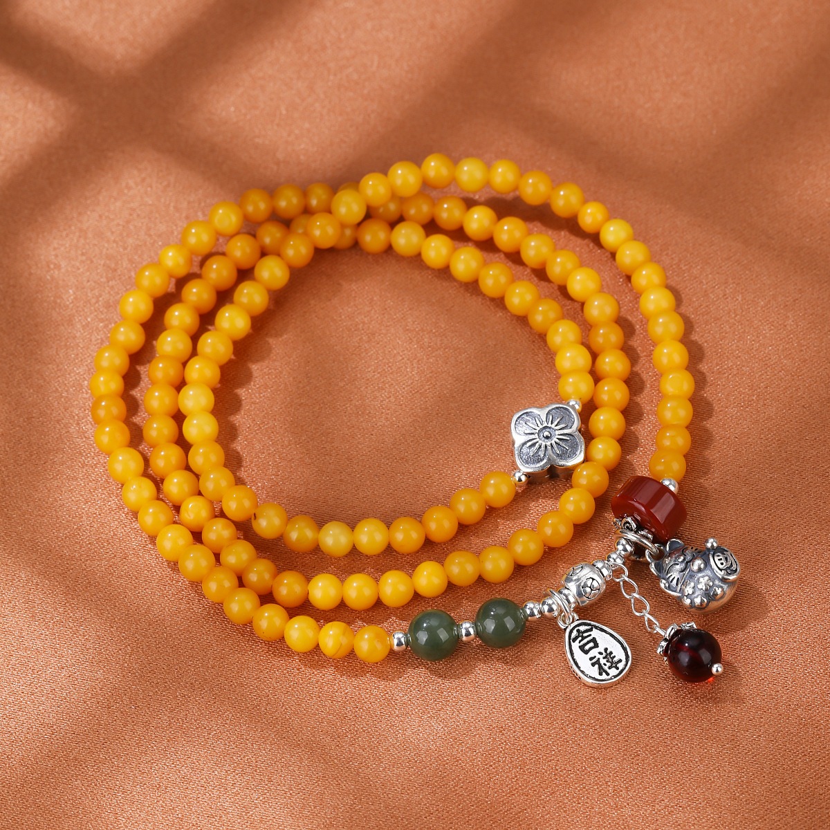 天然老蜜蜡三圈手链女s925银配饰多圈手串吉祥猫复古银配饰