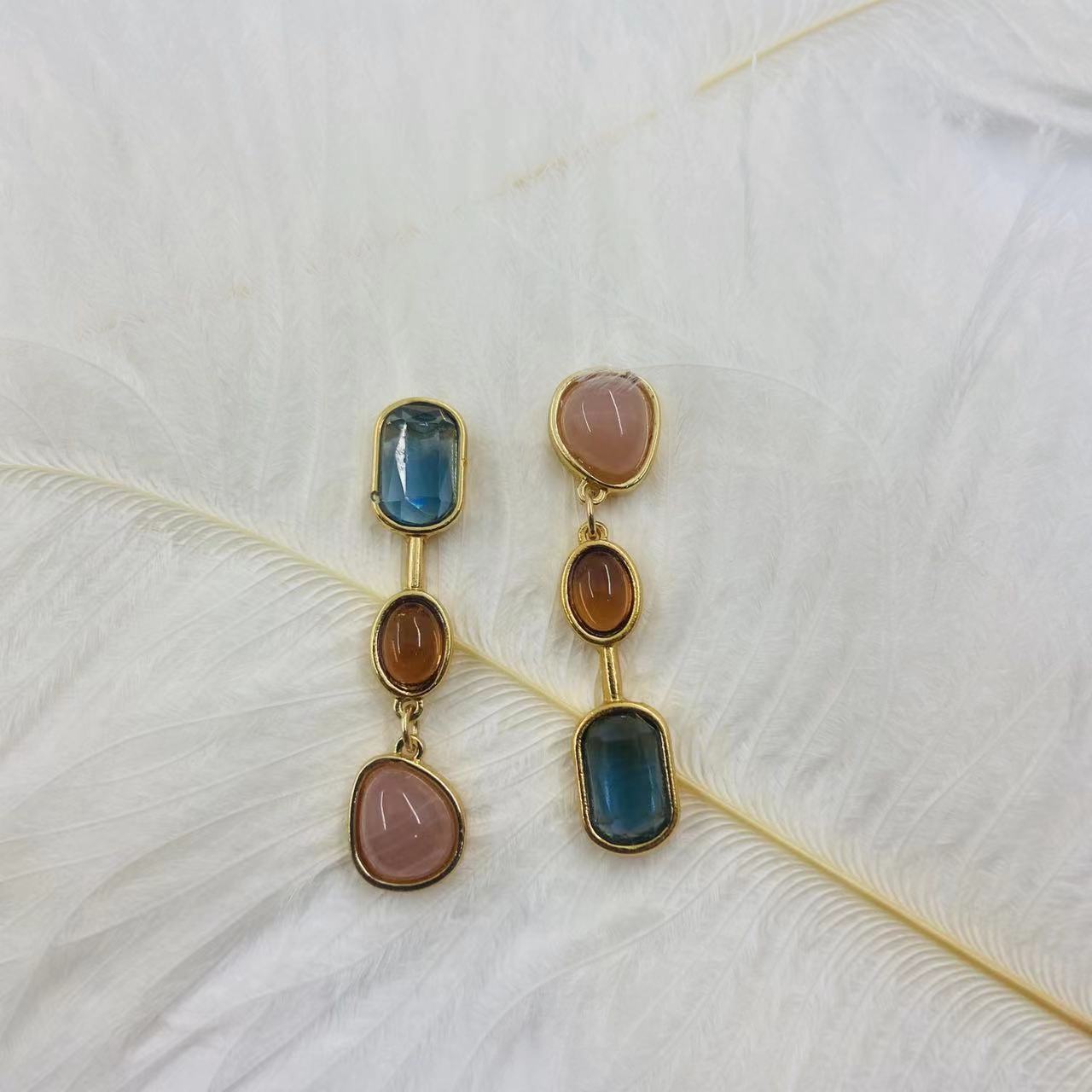 小众设计感 高级气质耳饰 不对称彩色宝石耳坠中古撞色