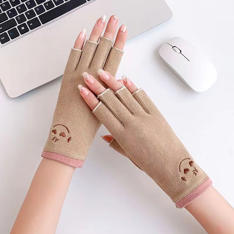 厂家批发兔绒德绒韩版可爱笑秋脸半指防寒秋冬季弹力女士手套