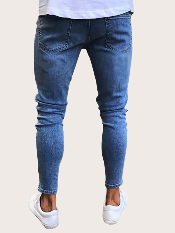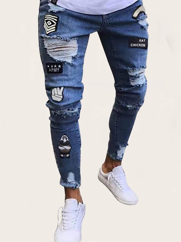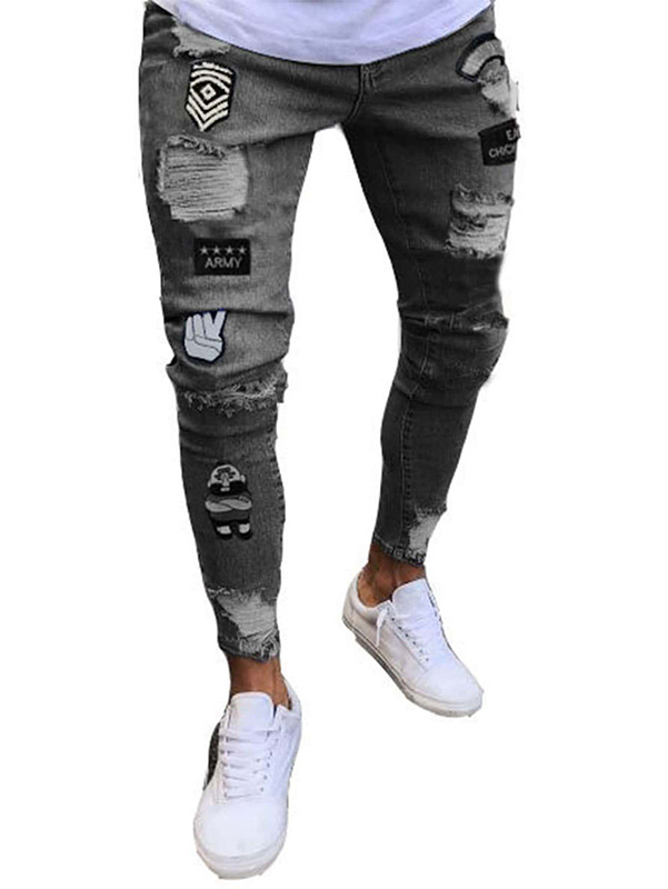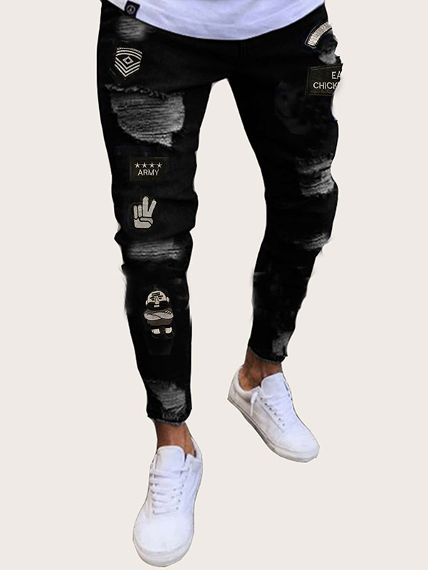 欧美小脚徽章牛仔裤男士潮流膝盖破洞拉链小脚破洞新款牛仔长裤