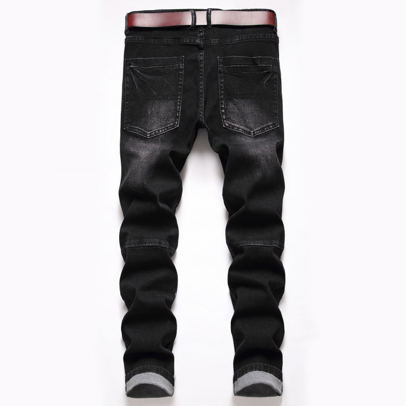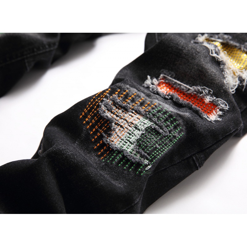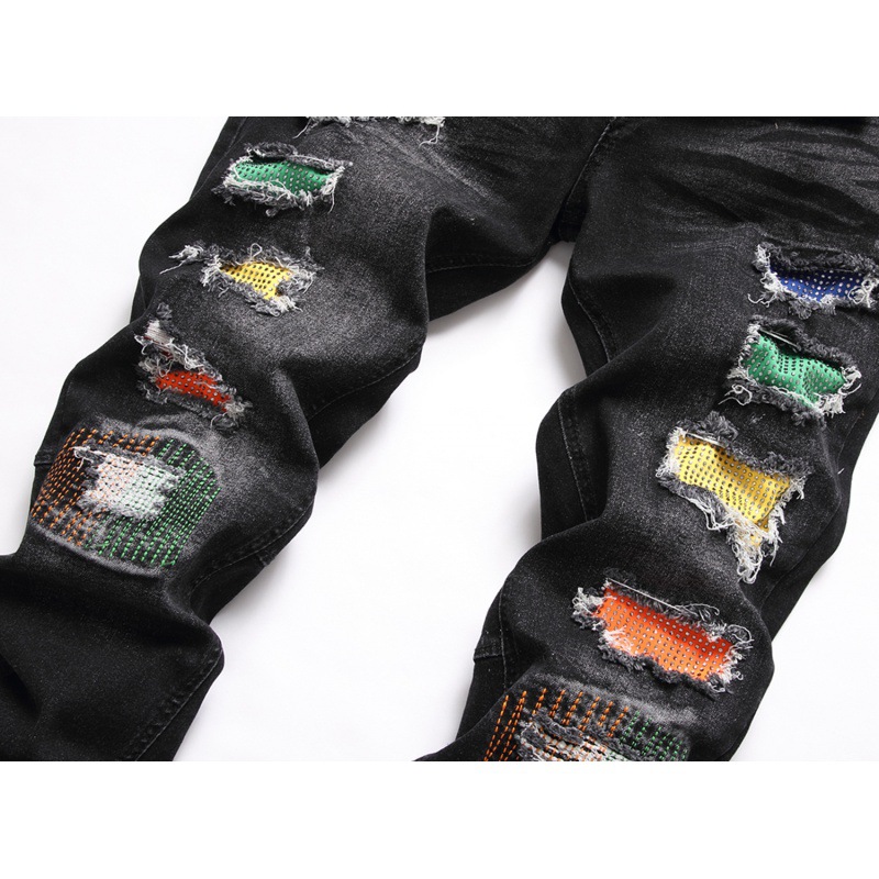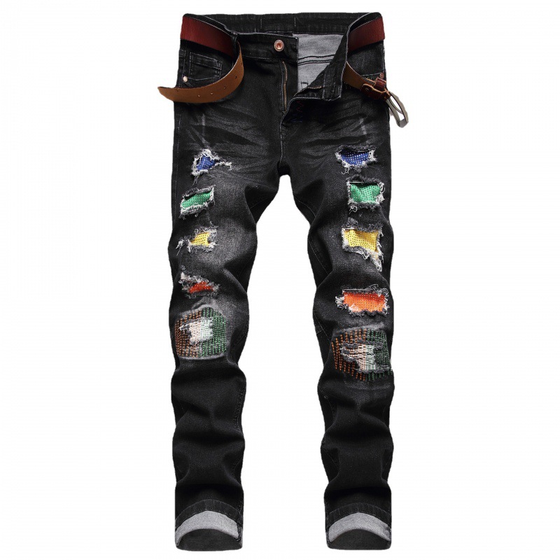 欧美外贸男士牛仔裤修身直筒水洗破洞彩色拼接拼布贴钻牛仔长裤