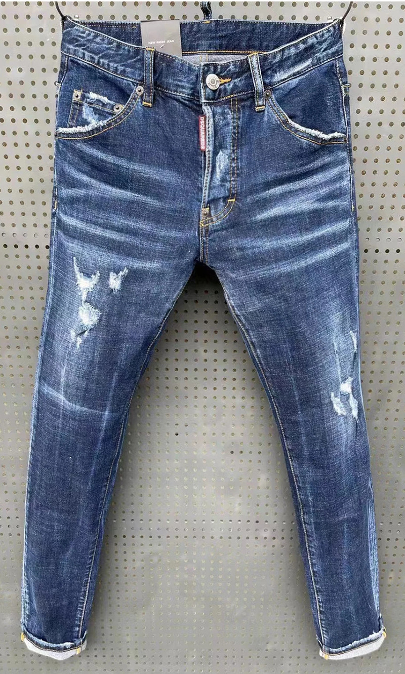 跨境外贸新款磨烂泼漆男士修身贴布弹力牛仔裤蓝色紧身乞丐裤D066