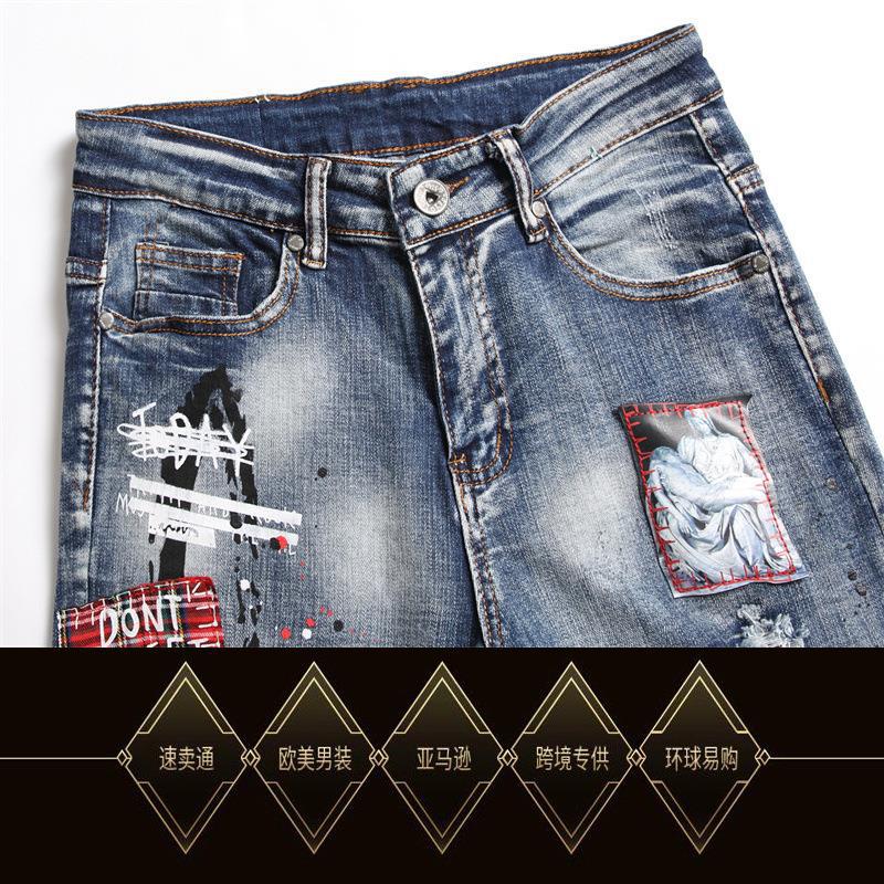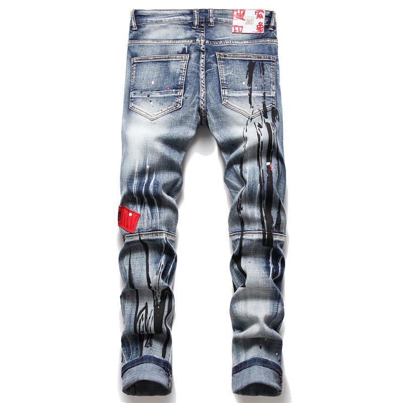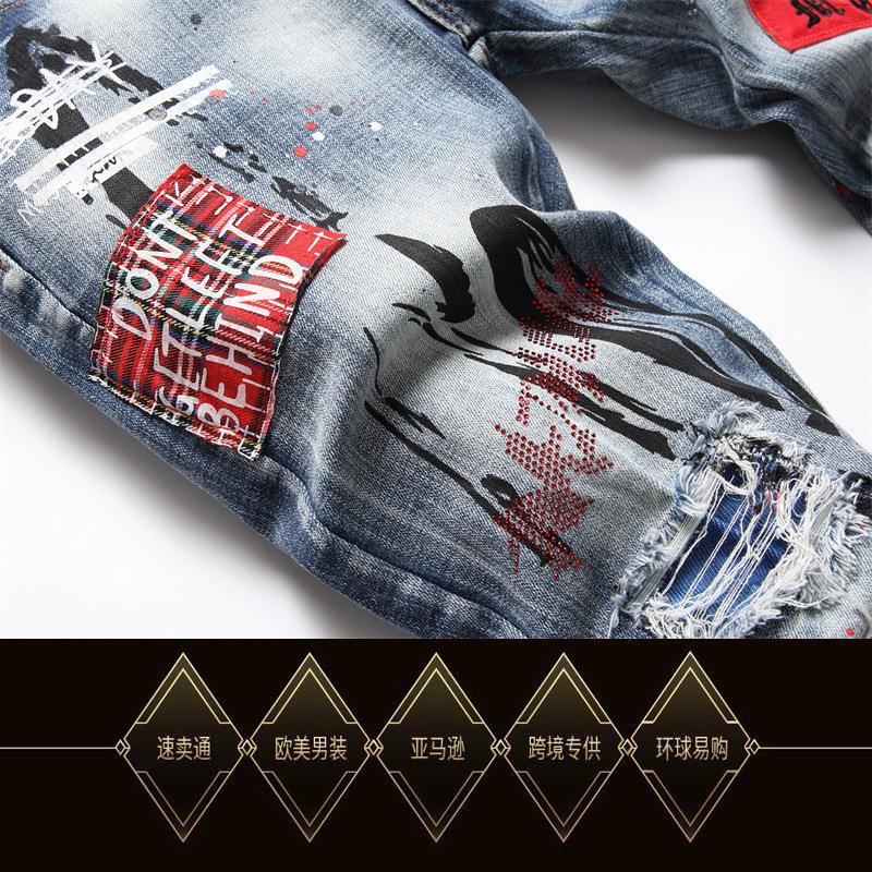欧美重工破洞红色贴布磨白男士修身弹力牛仔裤甩油漆烫钻时尚长裤
