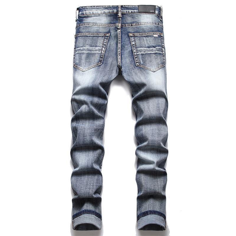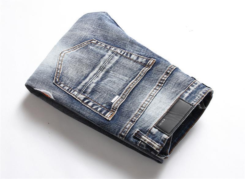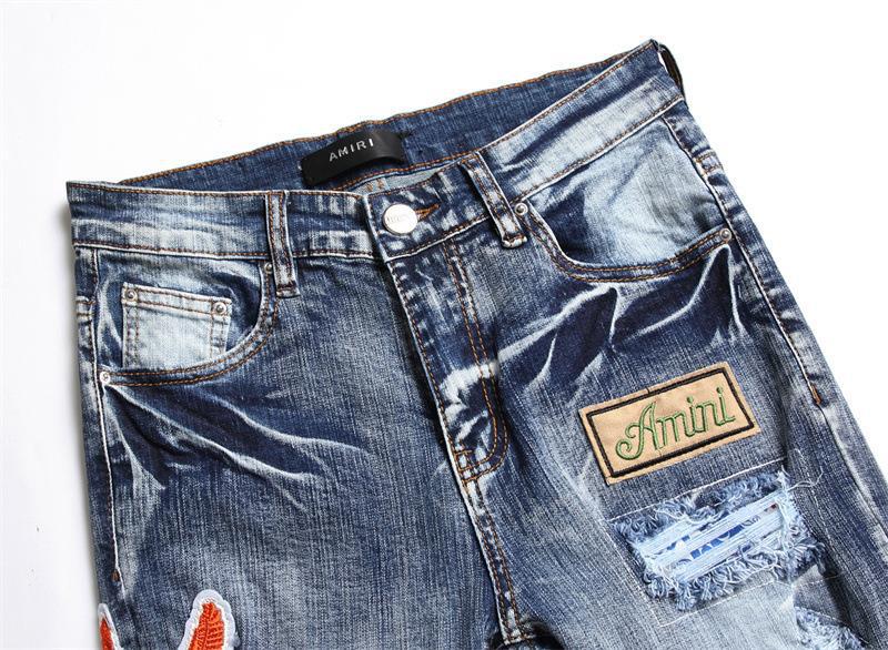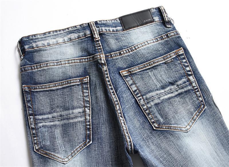 AM欧货男士牛仔裤破洞刺绣潮流弹力修身小脚裤百搭男裤3169