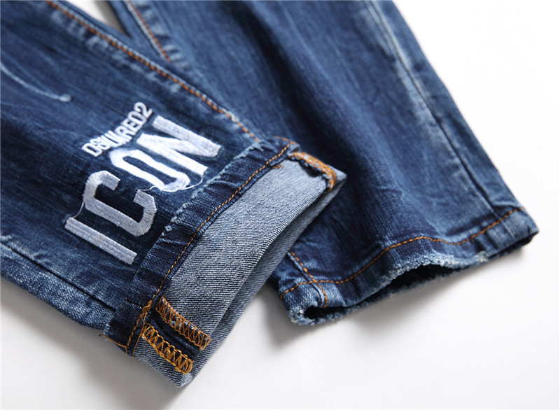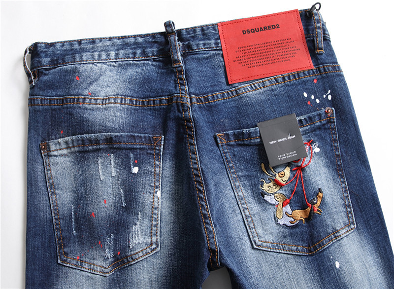 外贸DSQ靛蓝色多位破洞帖布重工艺磨破手绘刷白甩漆ICON货源