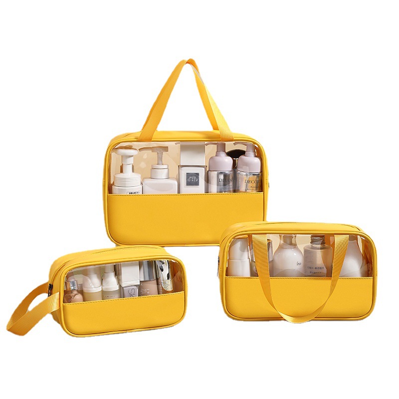 新款透明化妆洗漱包大容量防水游泳洗浴袋简约pvc手提袋pu拼接包