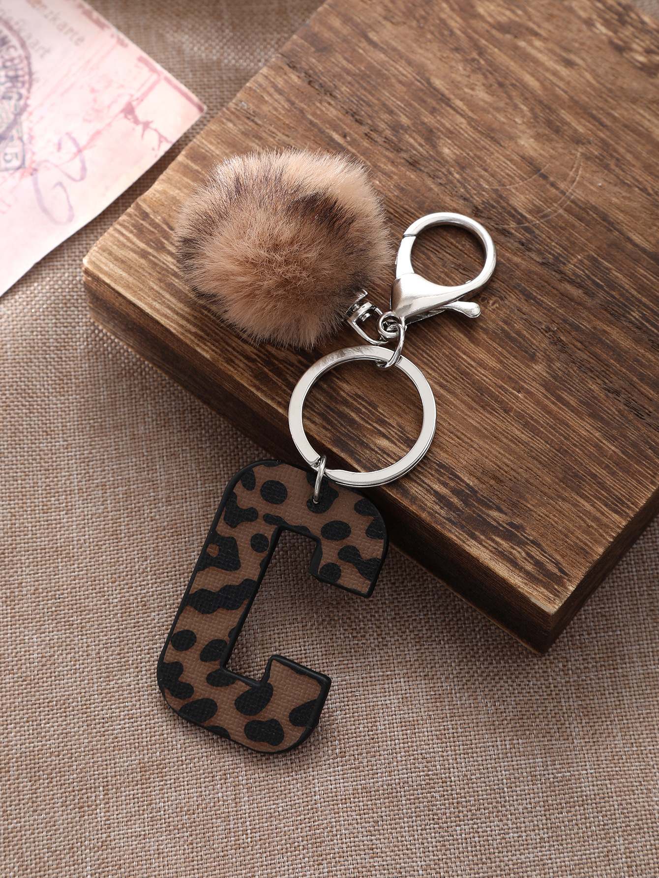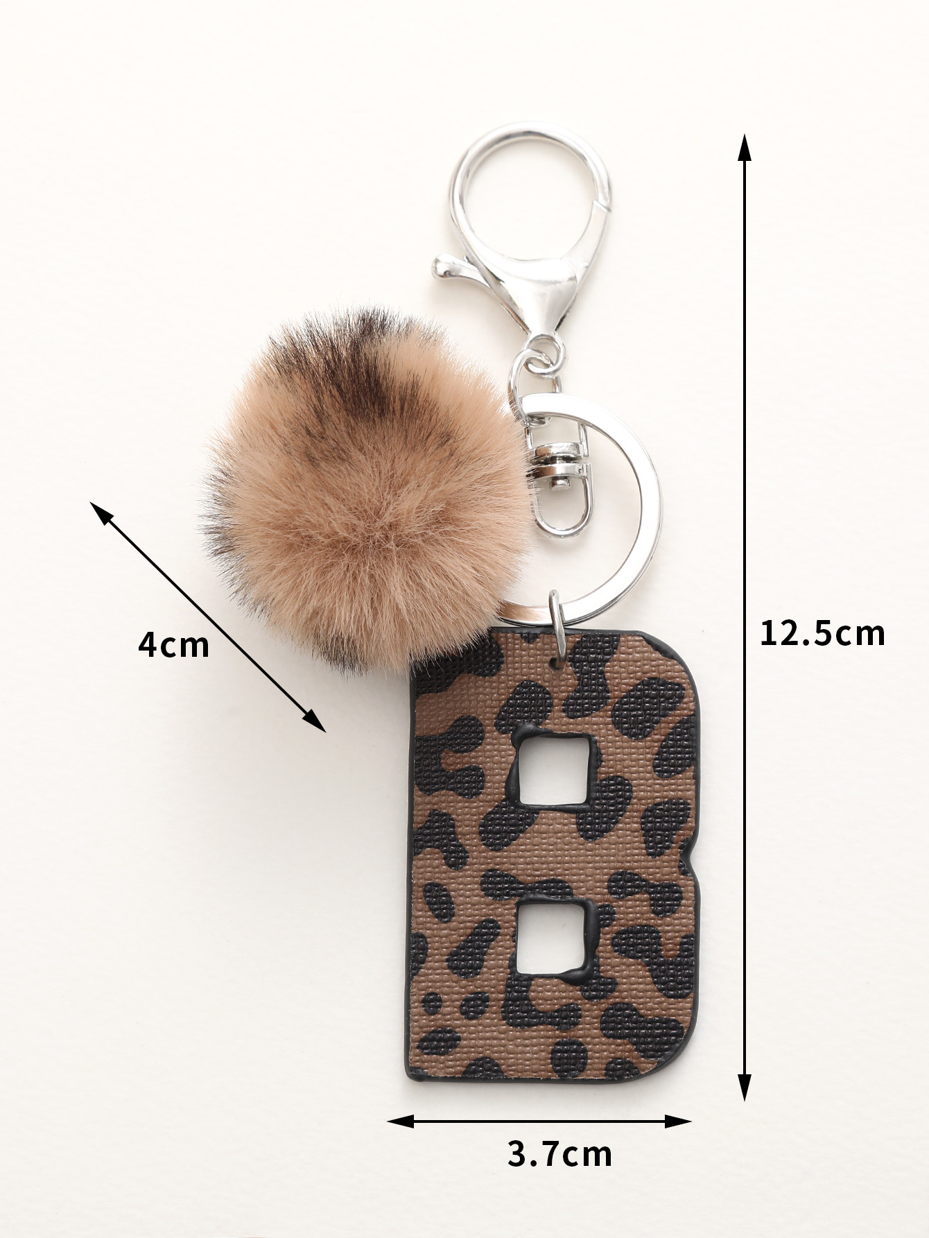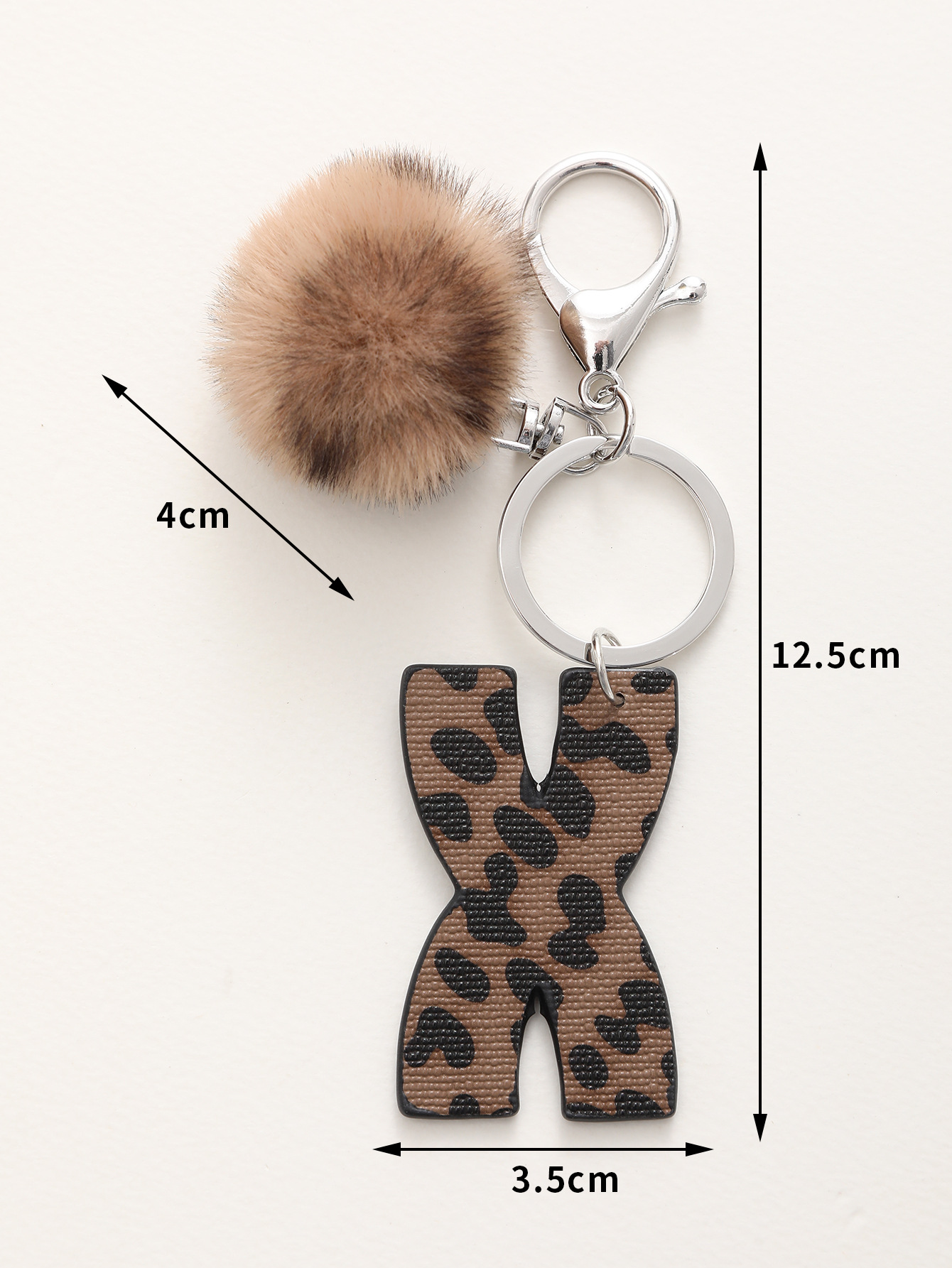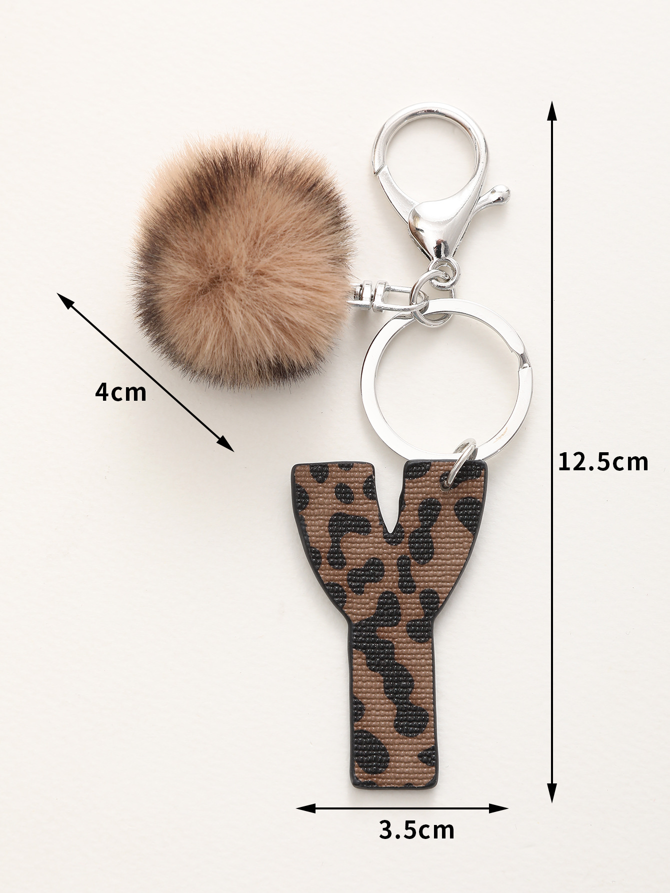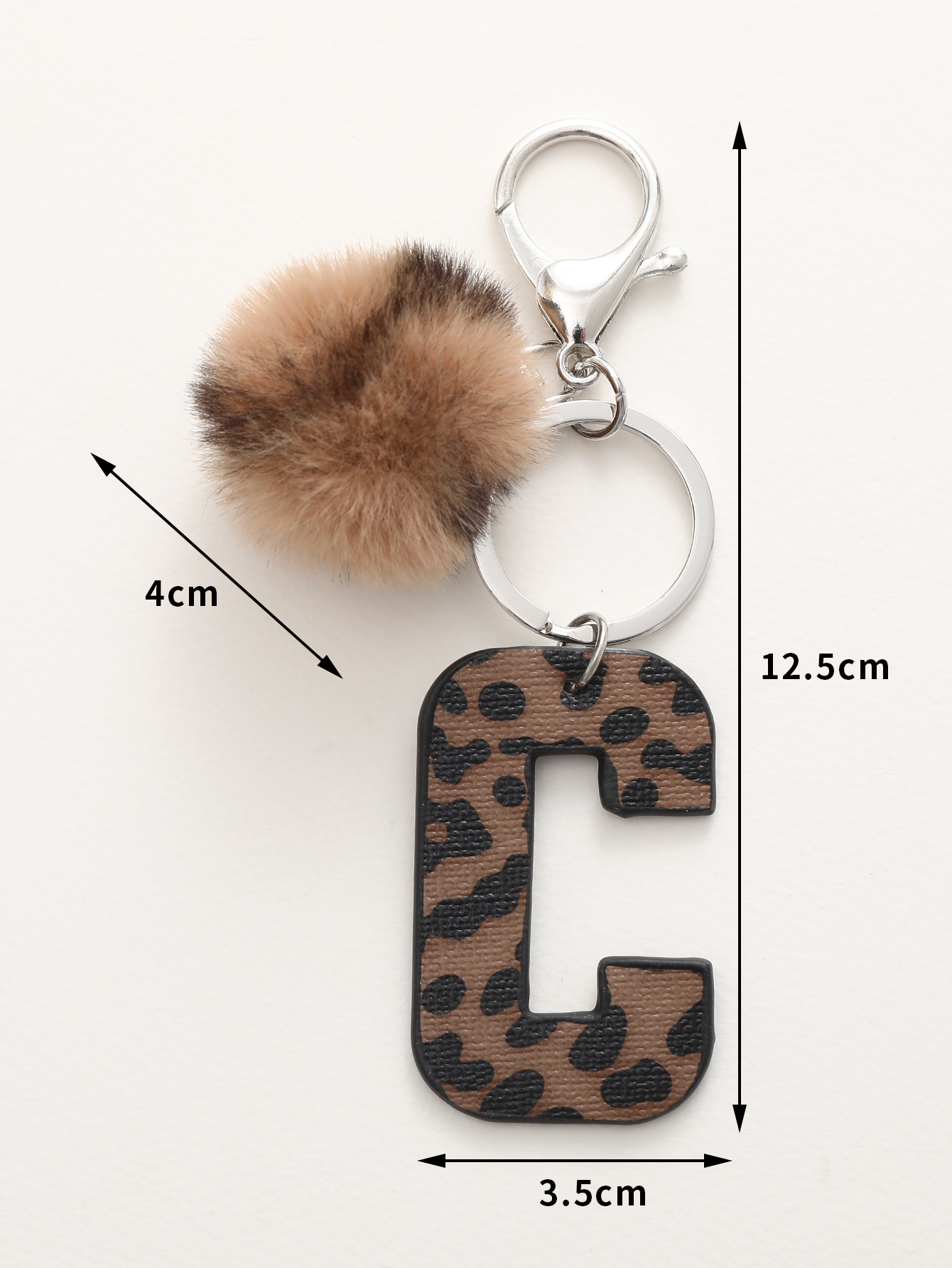 西部牛仔风豹纹油边字母皮革钥匙扣汽车挂件毛绒球配件跨境亚马