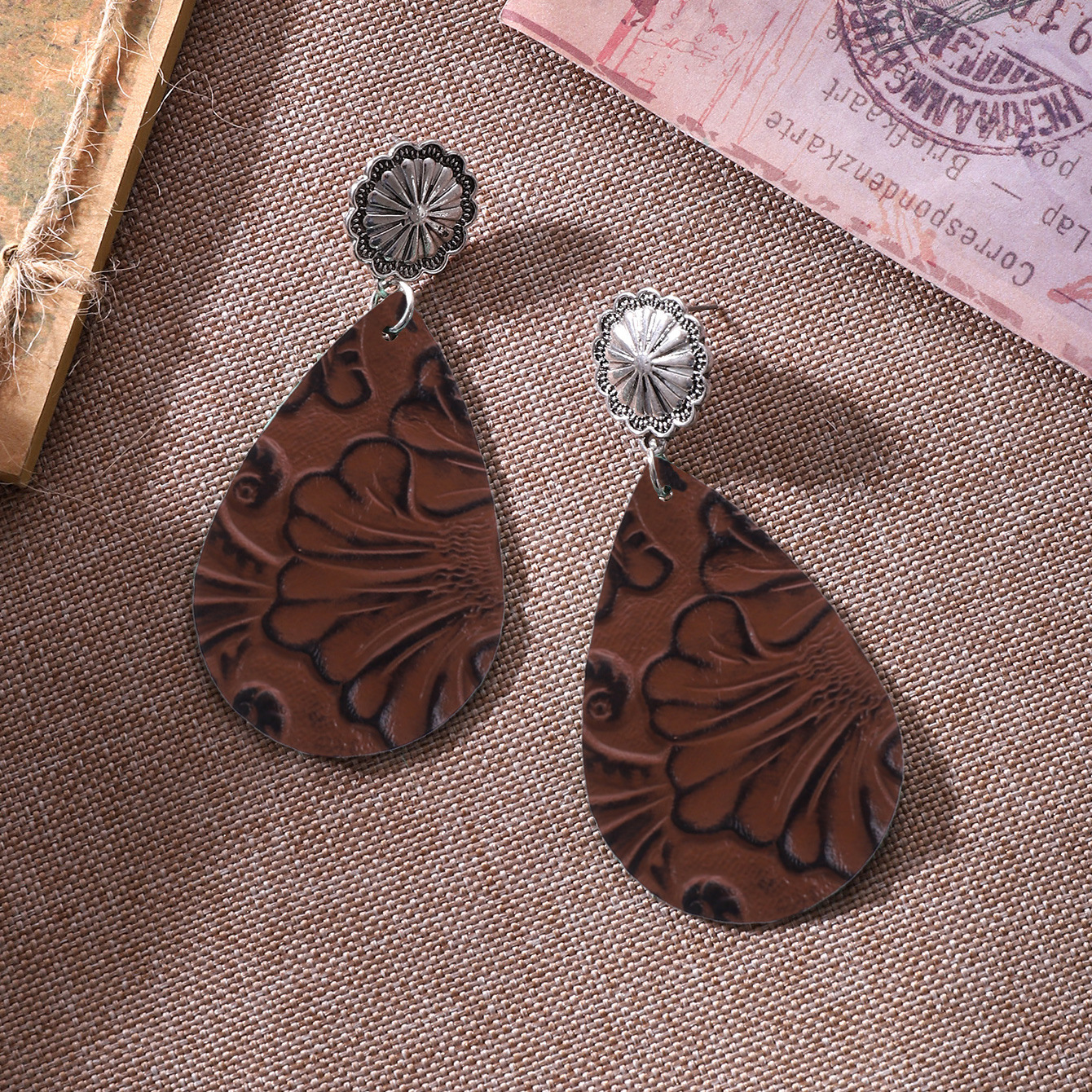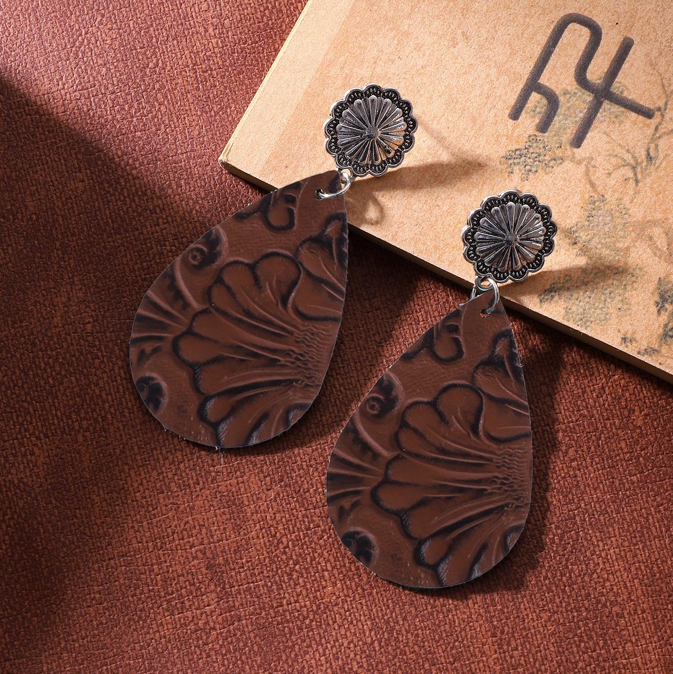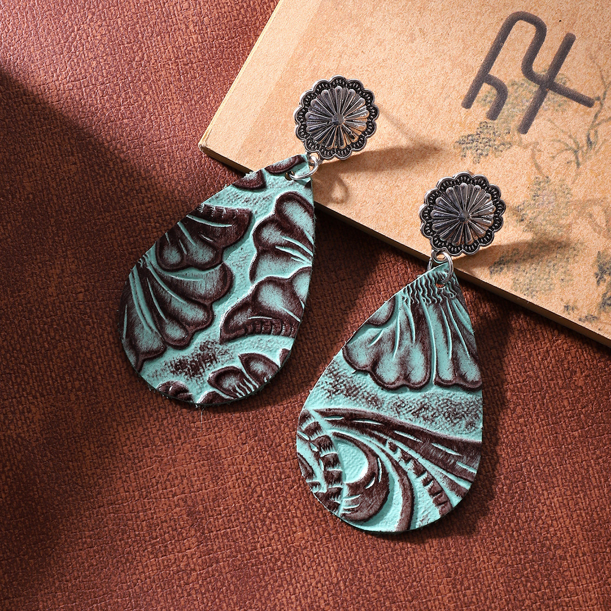 复古雕花印花牛皮绿色棕色西部牛仔风向日葵耳钉耳环欧美跨境