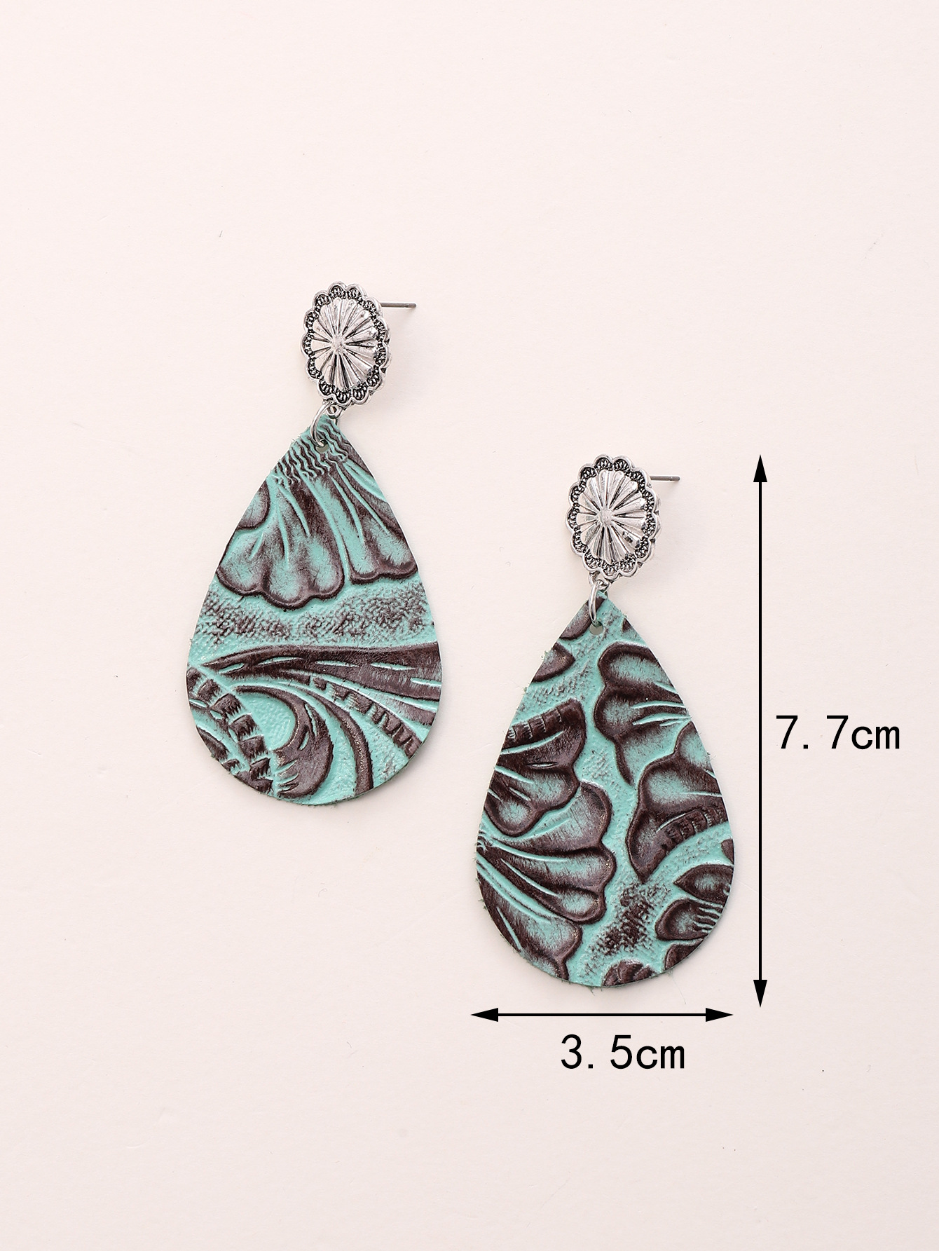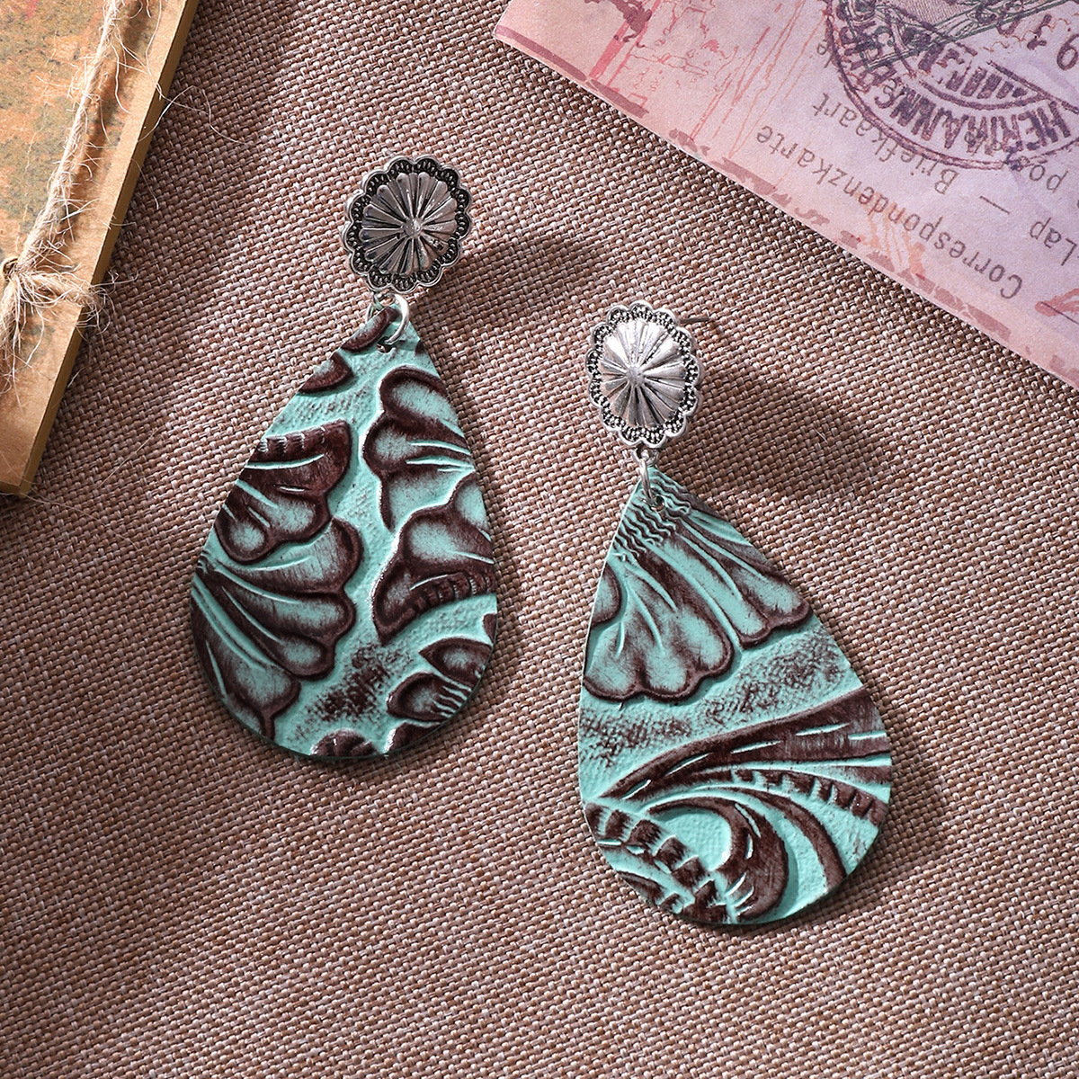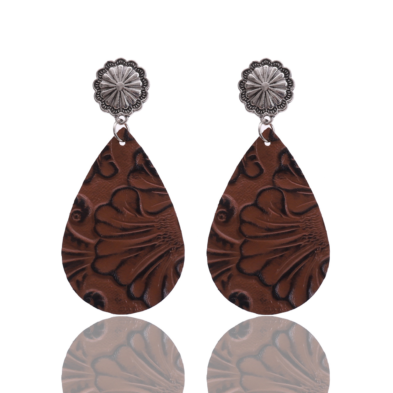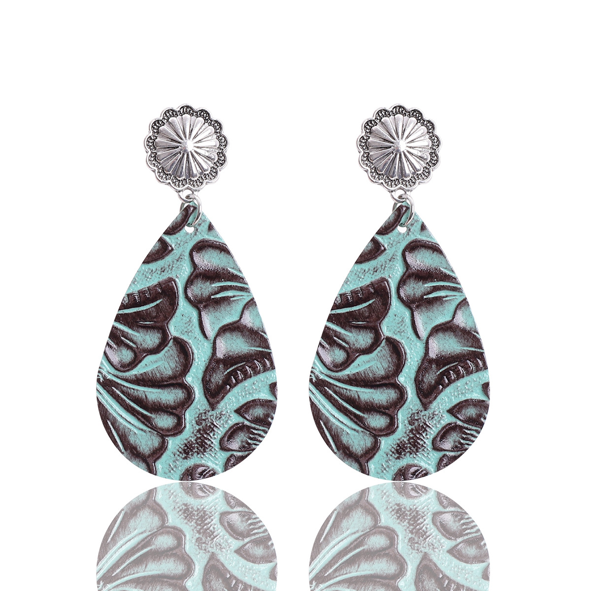 复古雕花印花牛皮绿色棕色西部牛仔风向日葵耳钉耳环欧美跨境