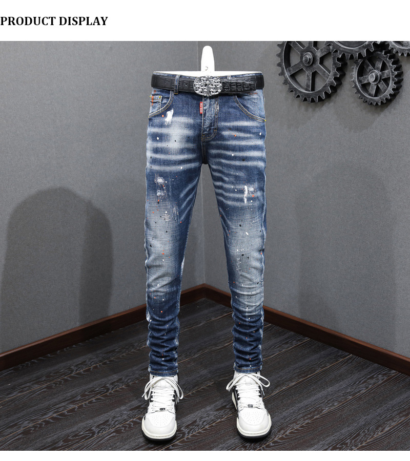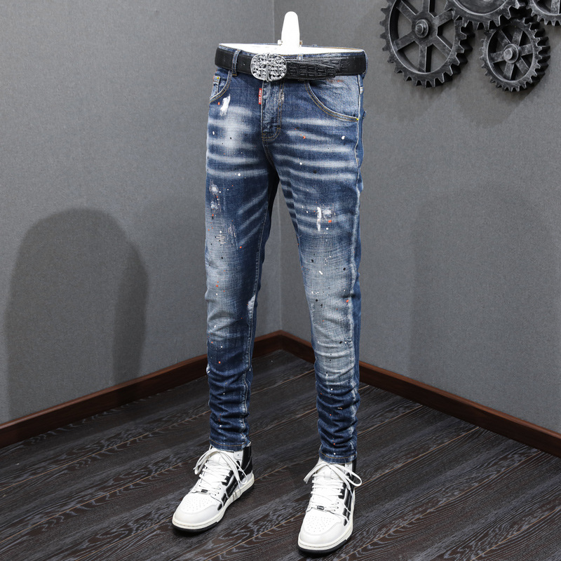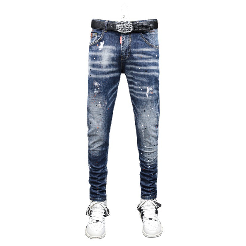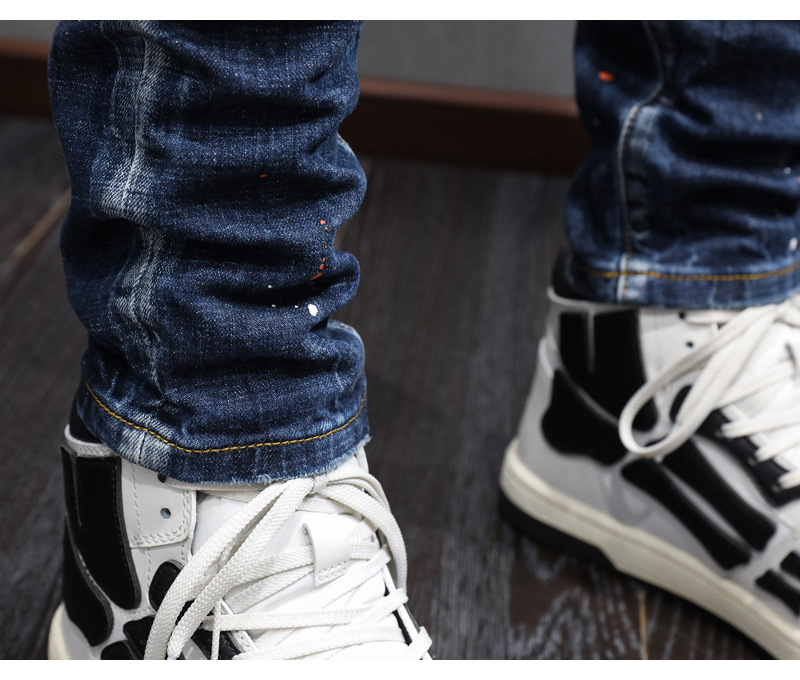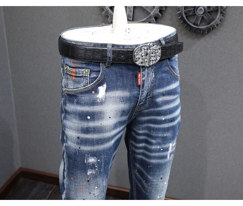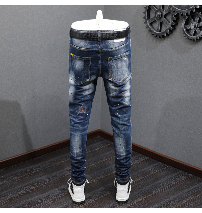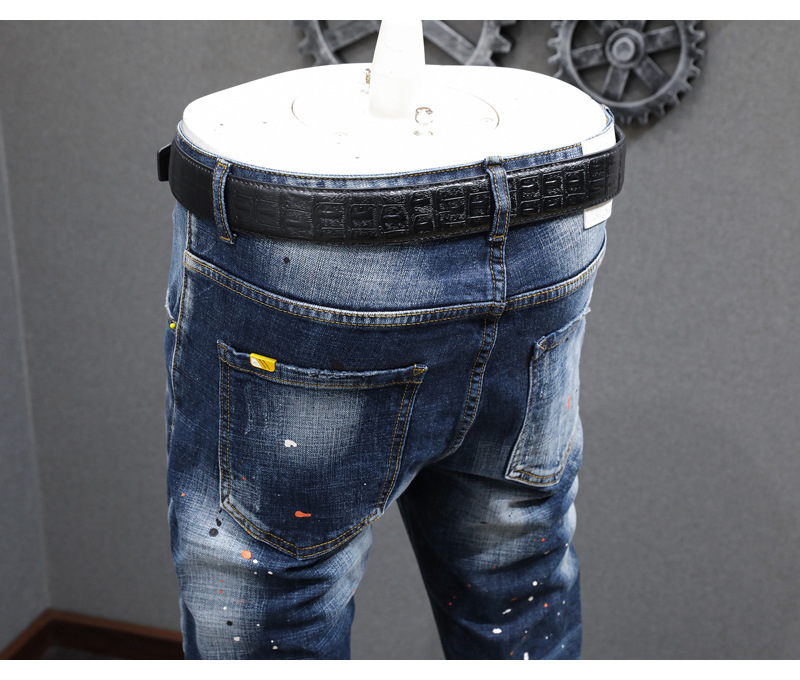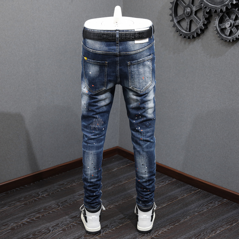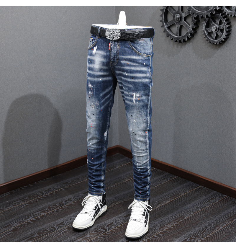 时尚街潮男士牛仔裤复古蓝水洗油漆喷墨绣花微弹修身小脚裤男潮裤