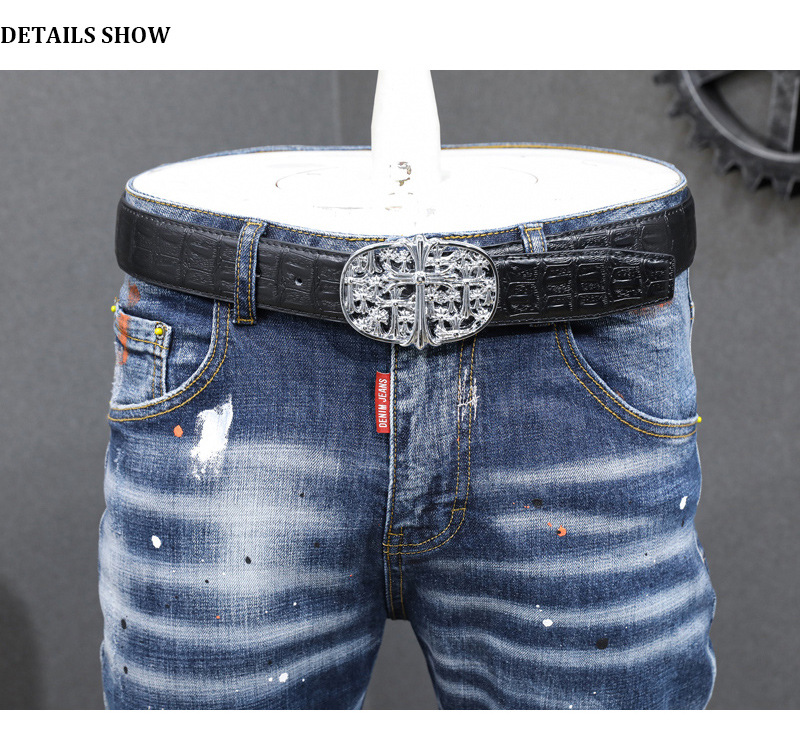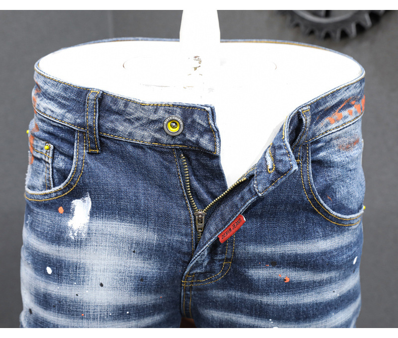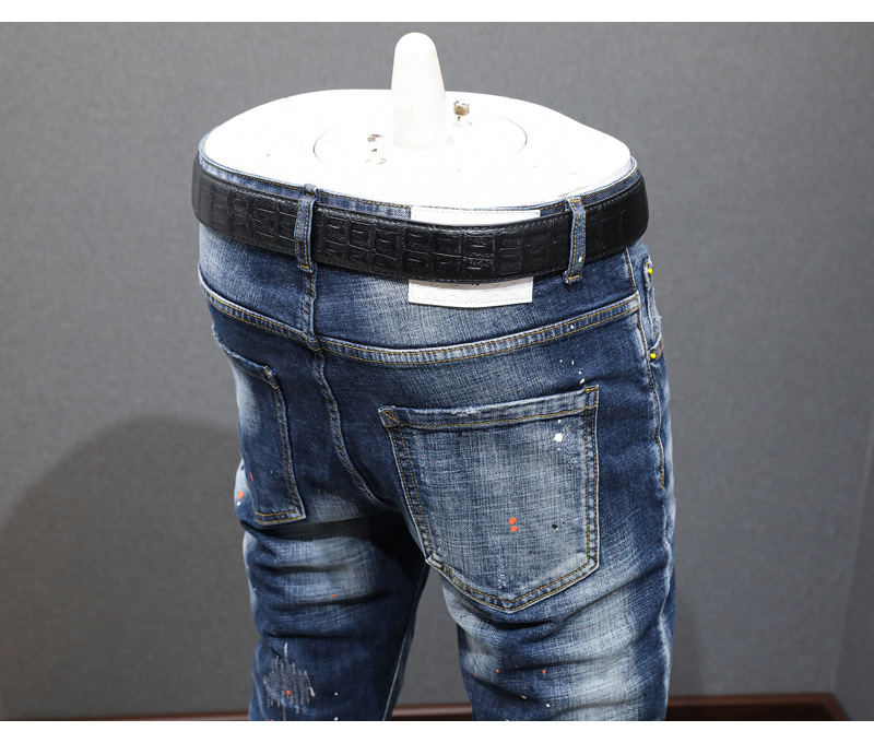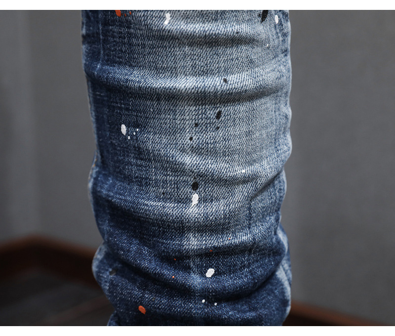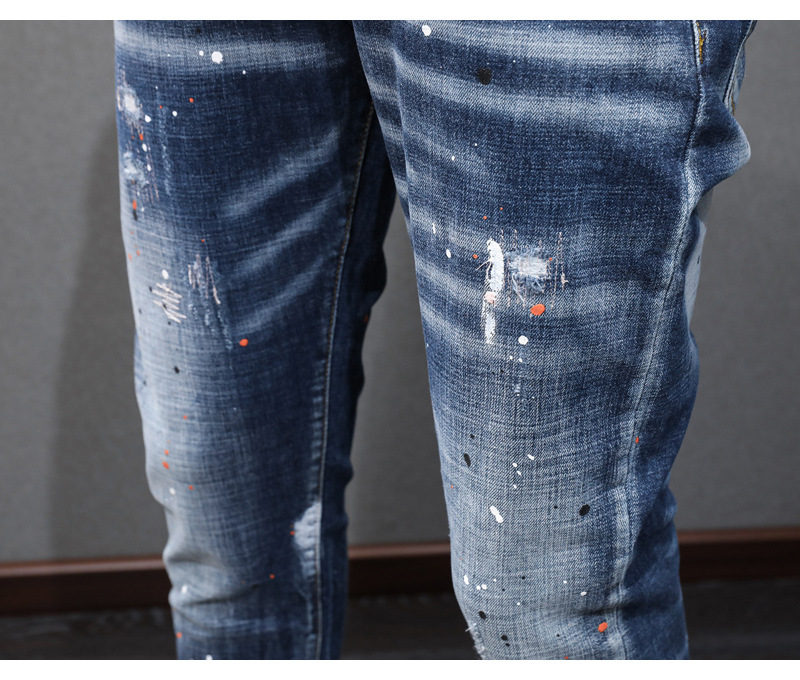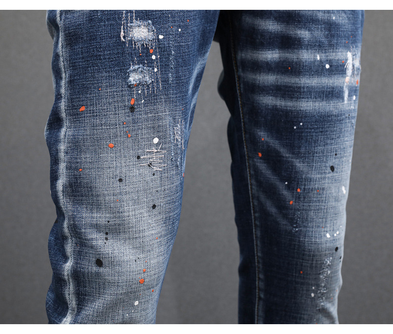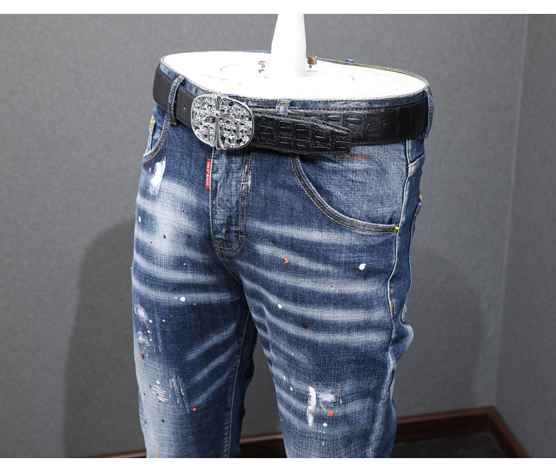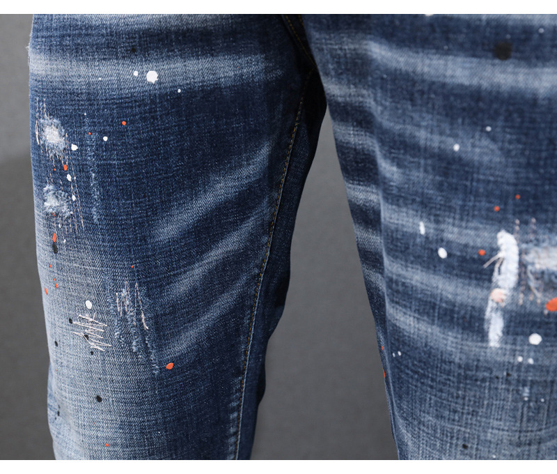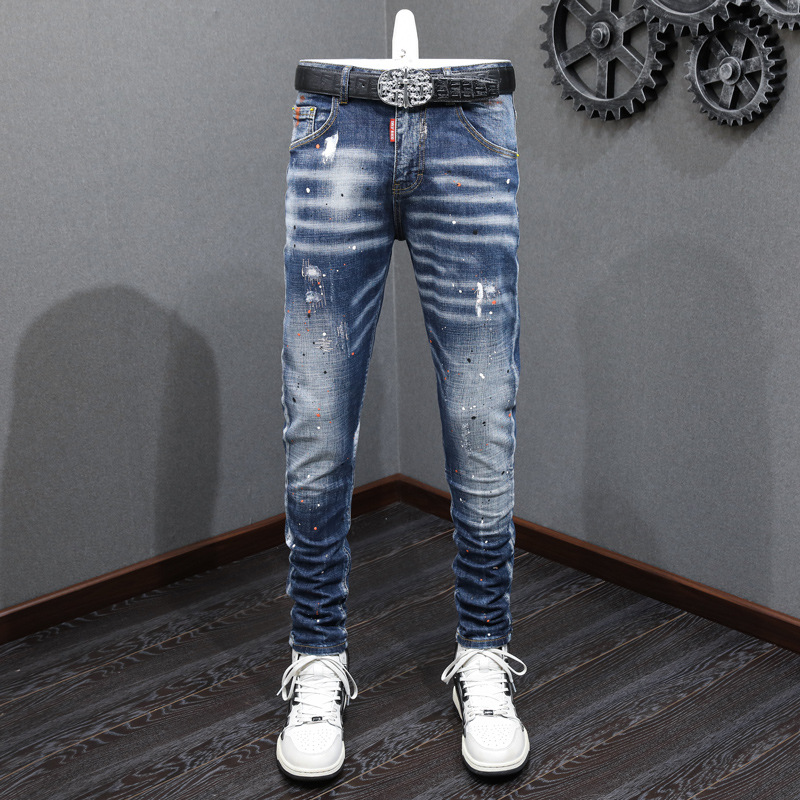 时尚街潮男士牛仔裤复古蓝水洗油漆喷墨绣花微弹修身小脚裤男潮裤