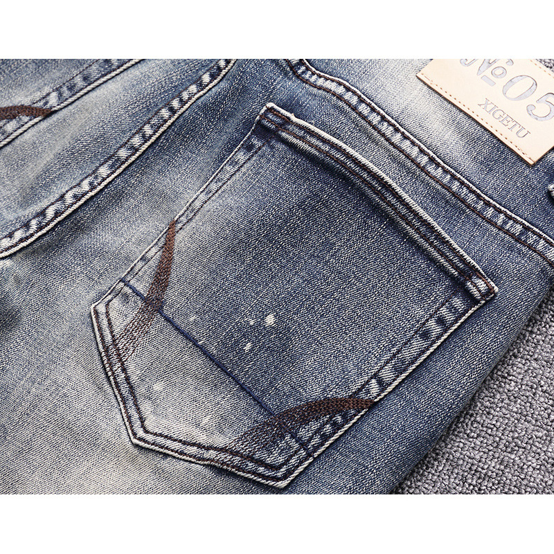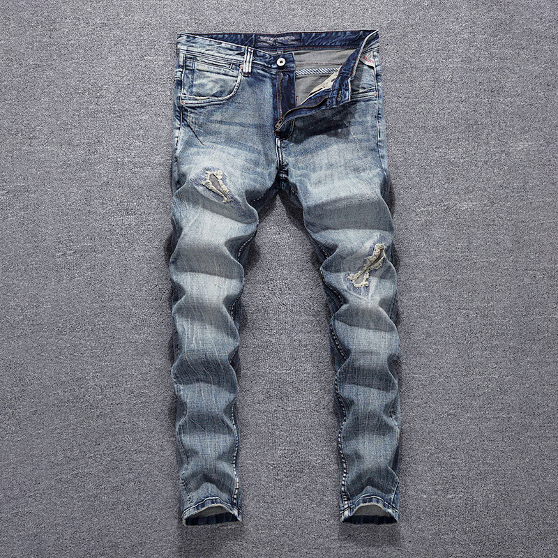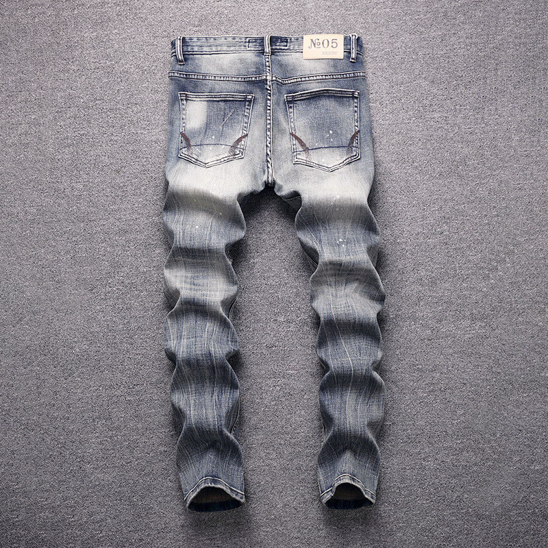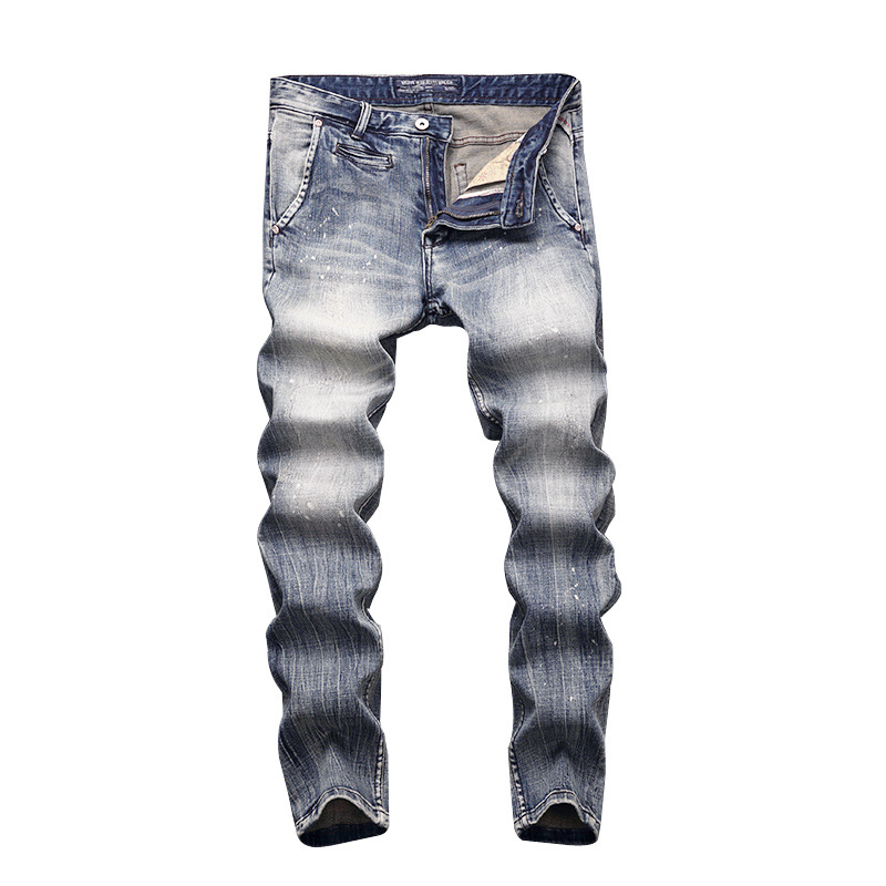 意大利时尚复古男士牛仔裤做旧蓝灰水洗小脚直筒微弹修身牛仔裤男