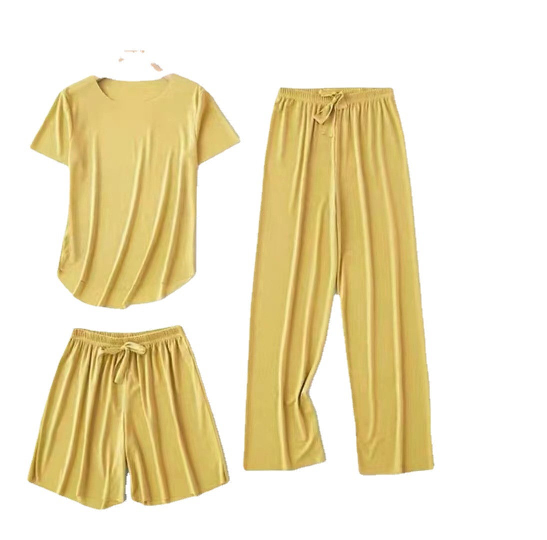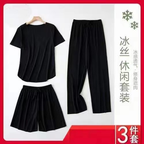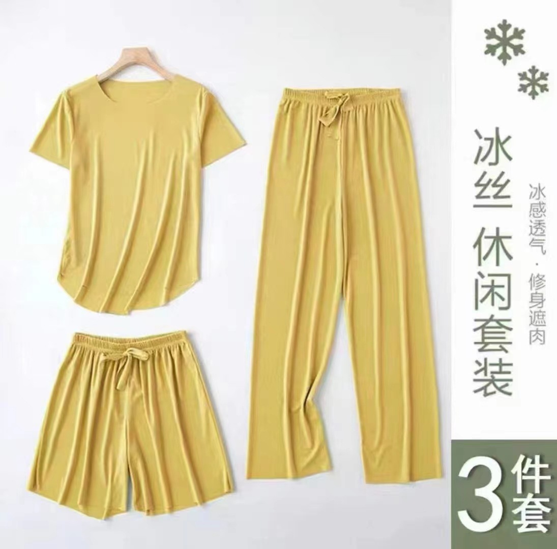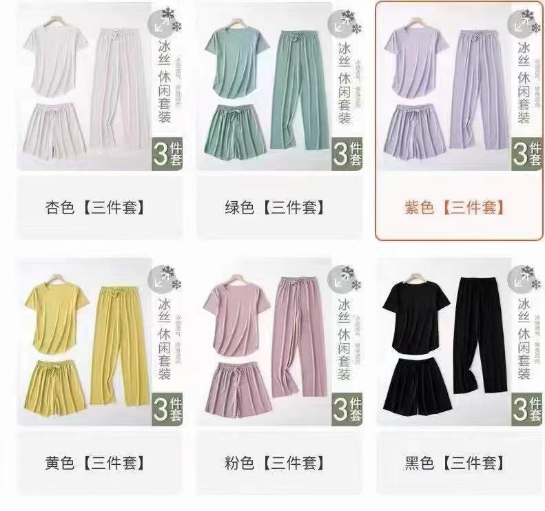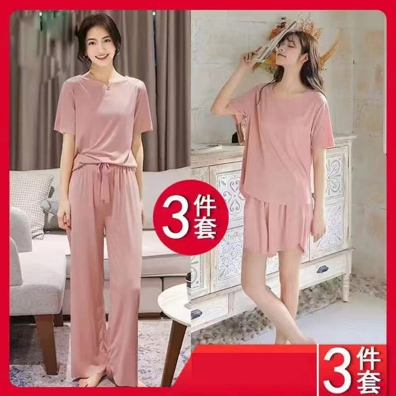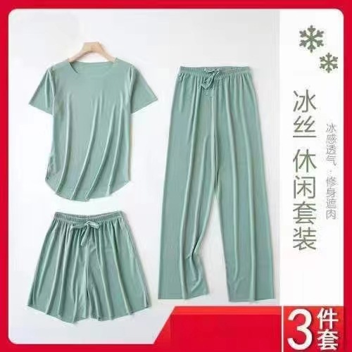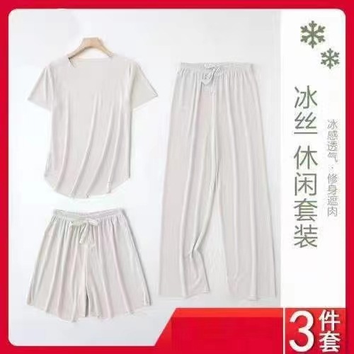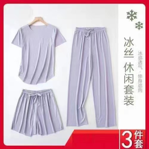 冰爽皇后睡衣三件套女厂家春夏新款宽松套装女休闲冰丝短袖家居服