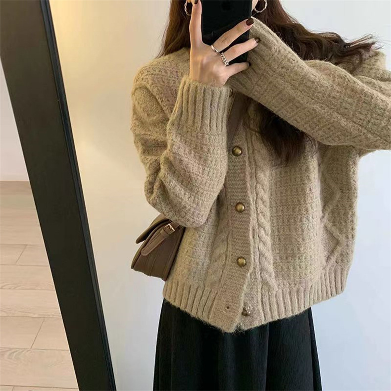 慵懒风复古毛衣外套女开衫秋冬新款叠穿氛围感圆领麻花针织衫上衣