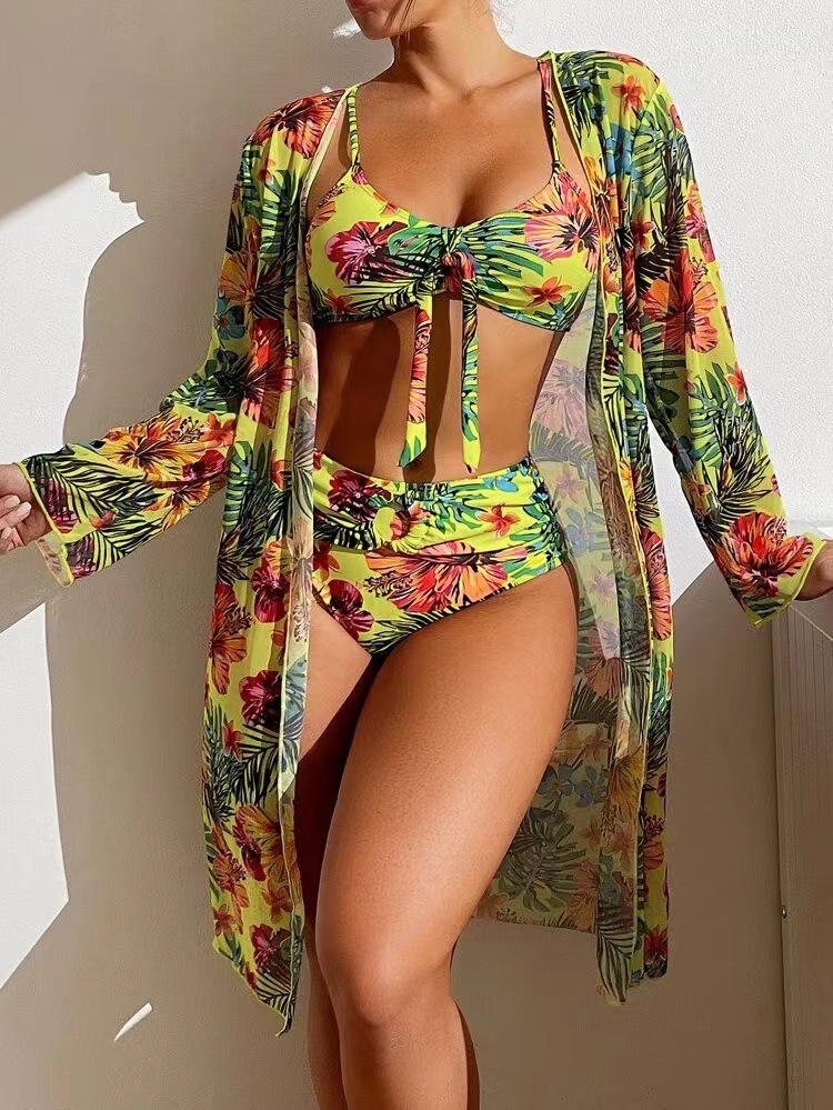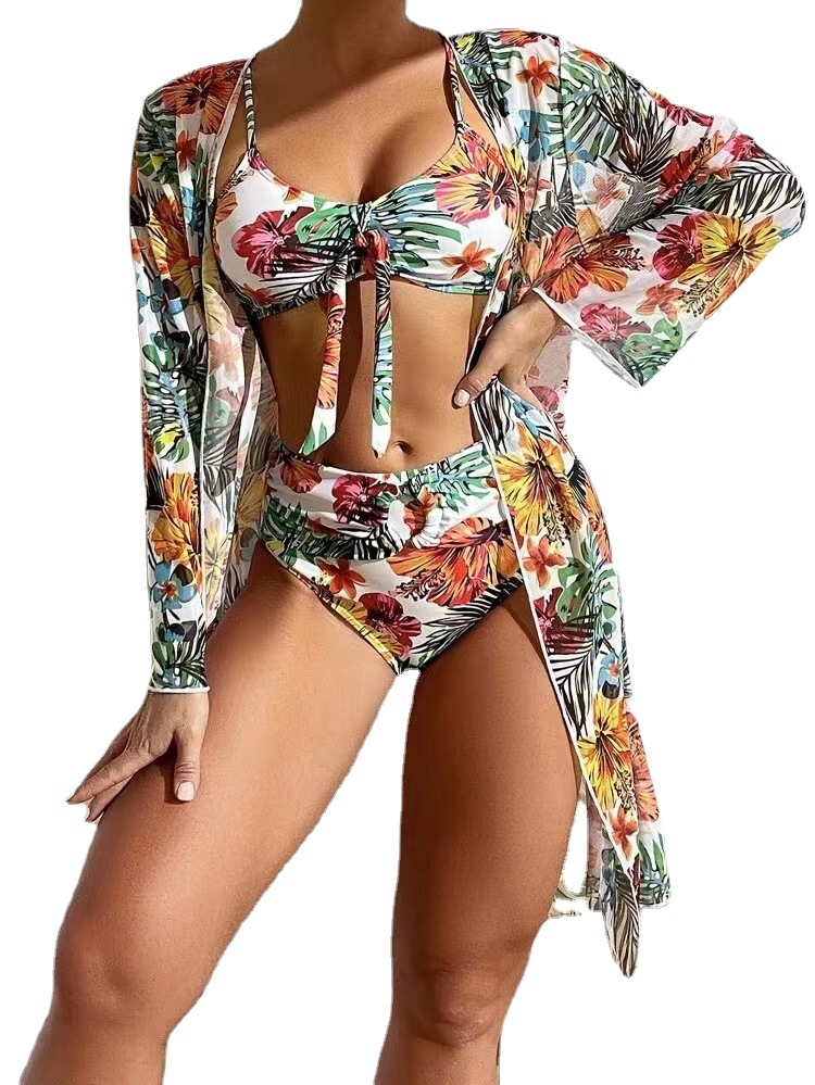 2023新款跨境欧美性感网纱比基尼三件套亚马逊聚拢分体印花泳衣女