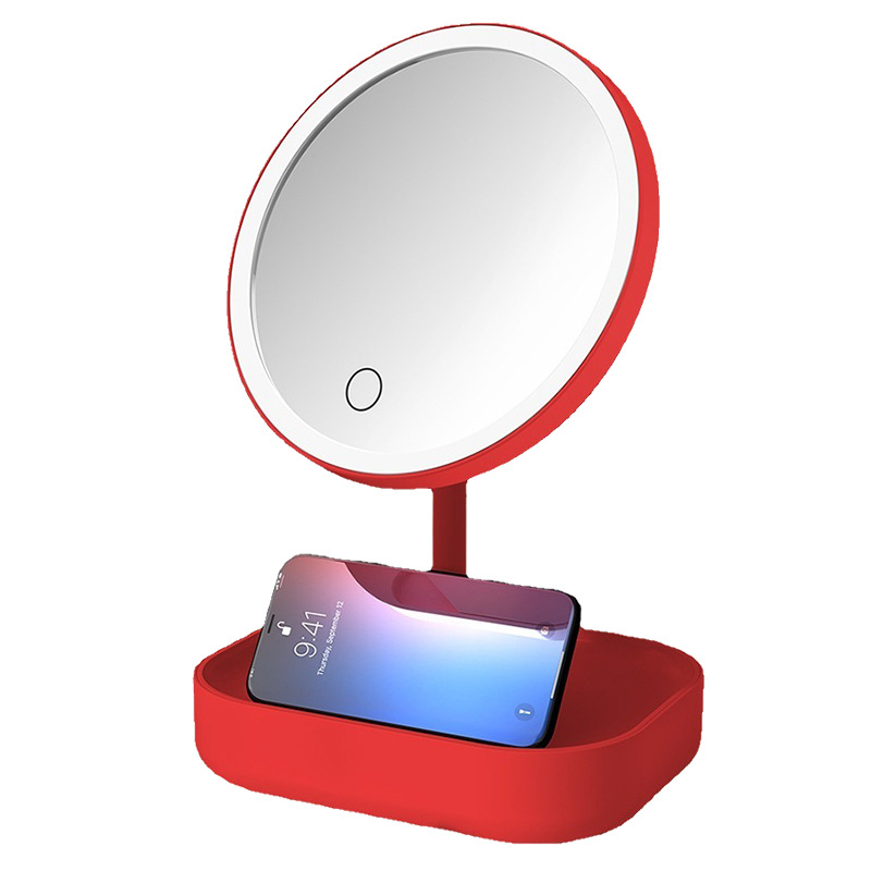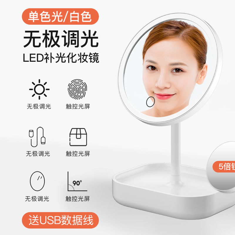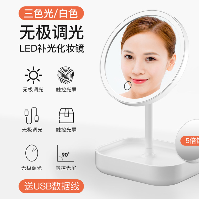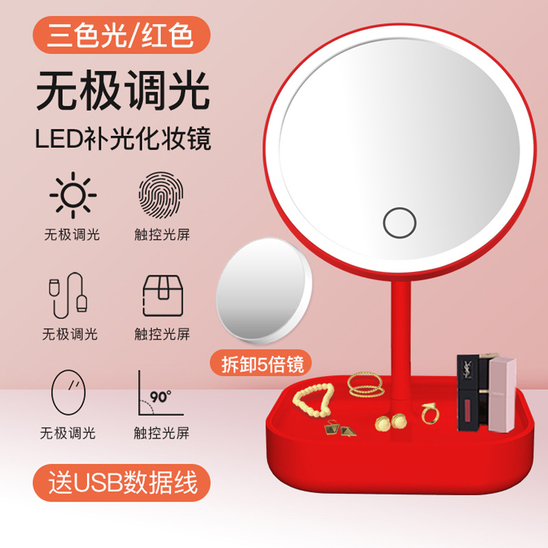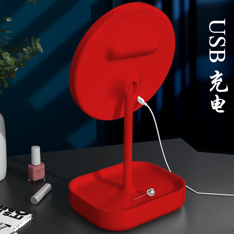 网红折叠镜女生带灯美颜补光充电镜子台式带收纳盒喜镜LED化妆镜
