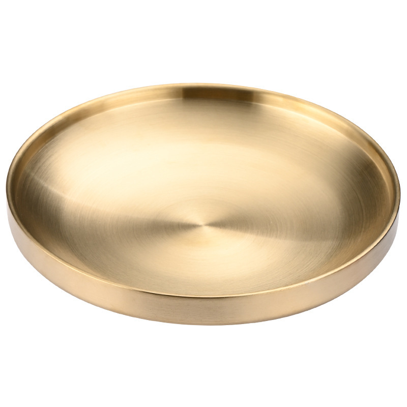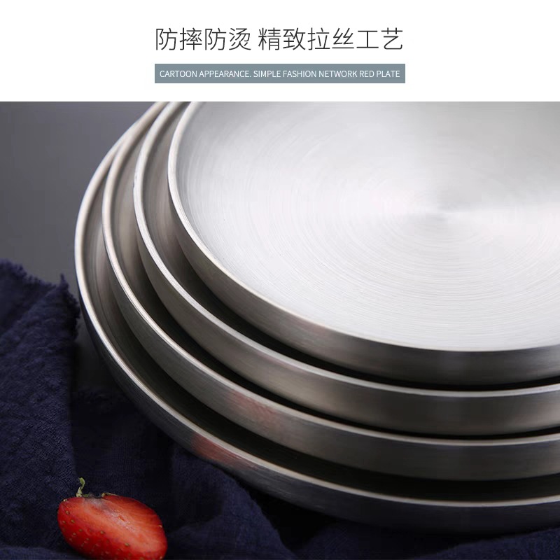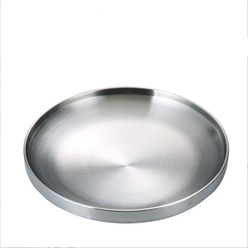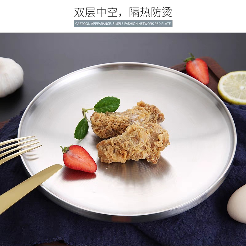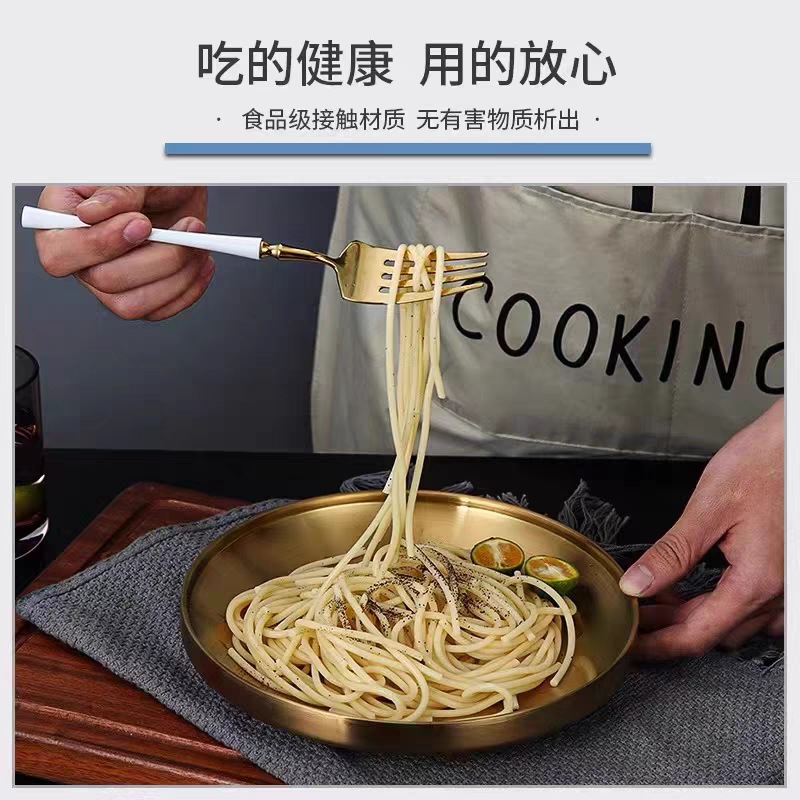 304不锈钢圆盘 双层防烫菜盘金色餐盘水果盘平盘子韩式烤肉盘餐具
