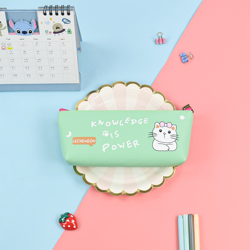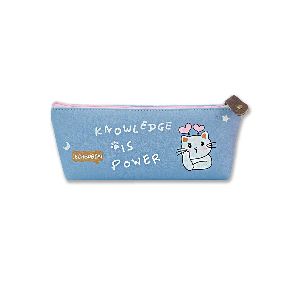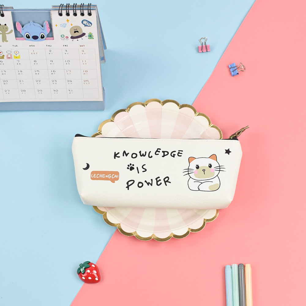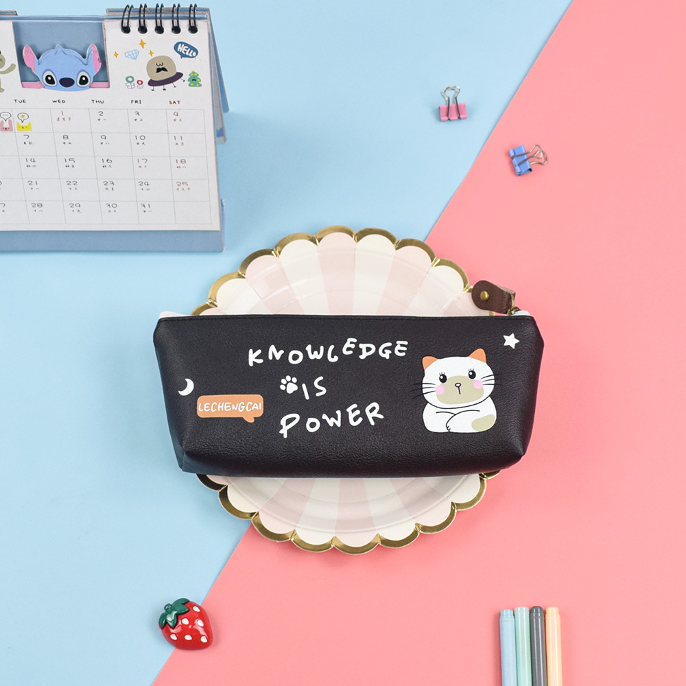 韩版简约卡通猫咪 pu笔袋大容量小学生文具防水三角铅笔袋批发