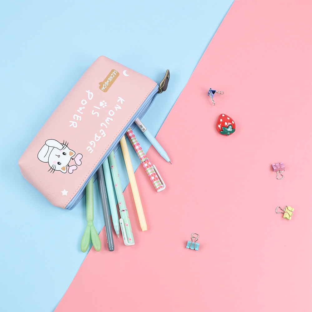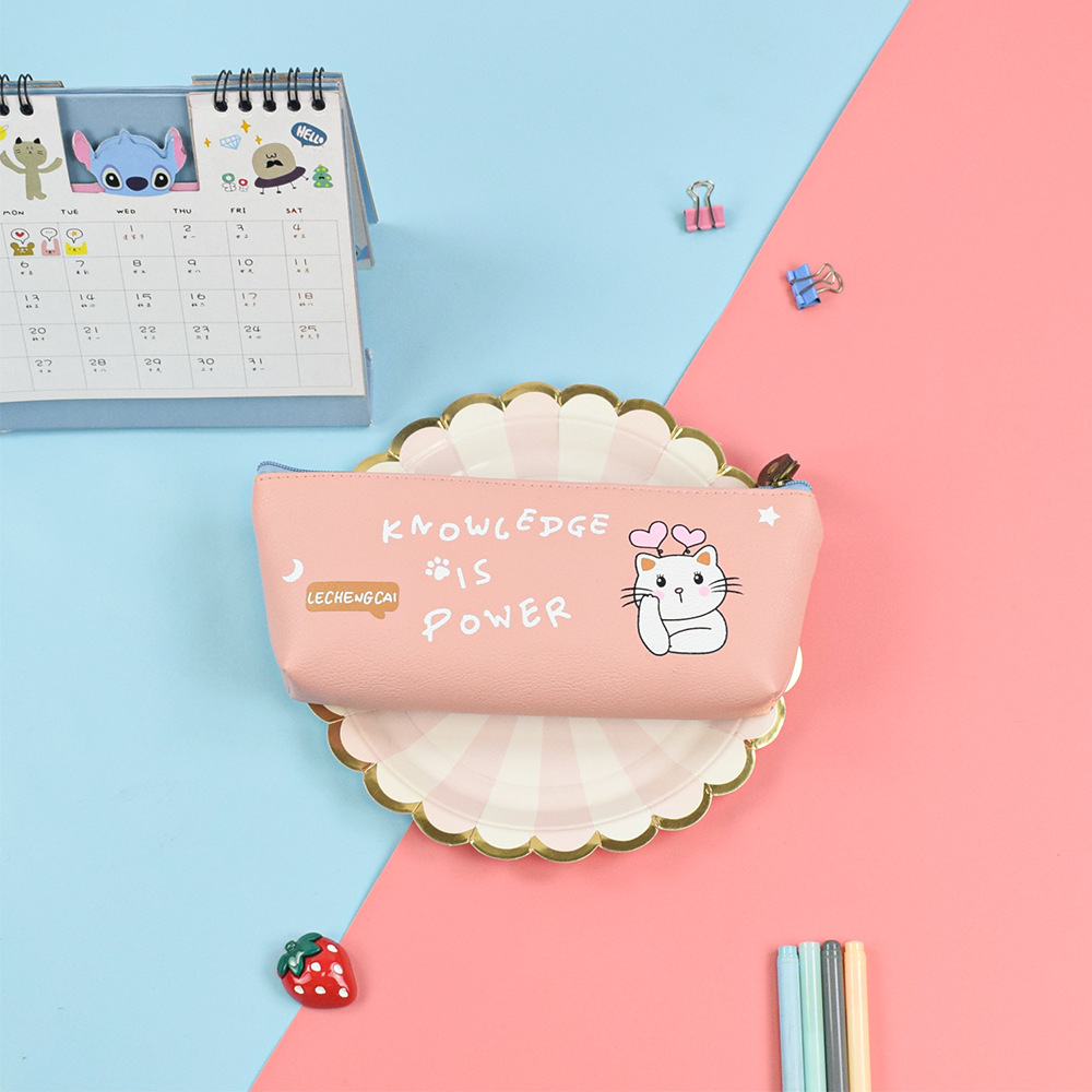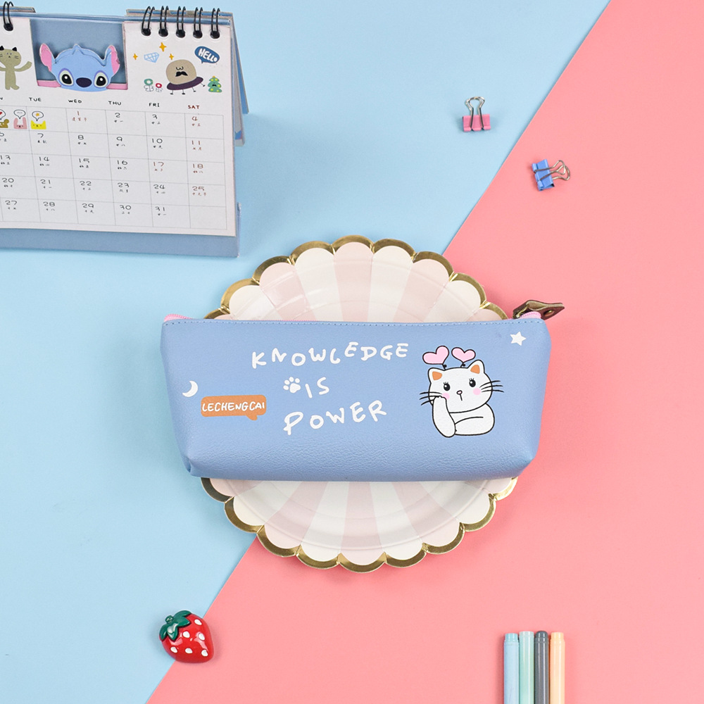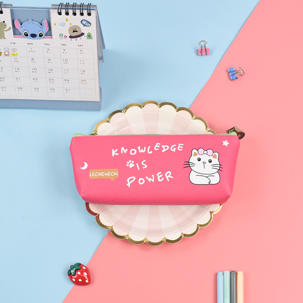 韩版简约卡通猫咪 pu笔袋大容量小学生文具防水三角铅笔袋批发