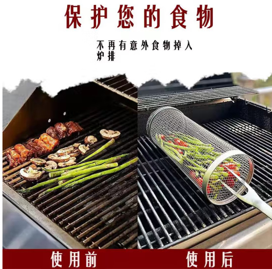 烧烤笼不锈钢便携式烧烤炉304户外烧烤网圆形烟熏bbq烧烤架滚筒