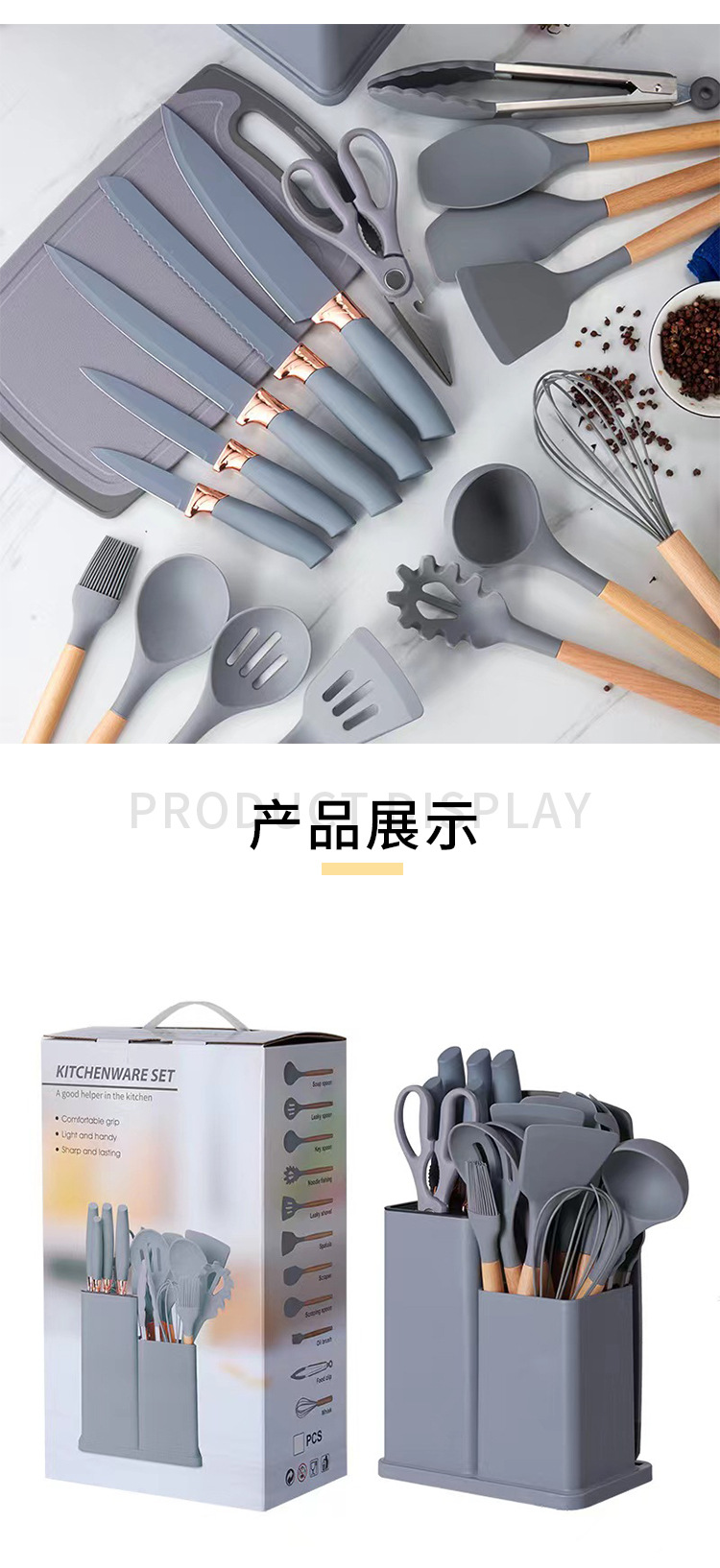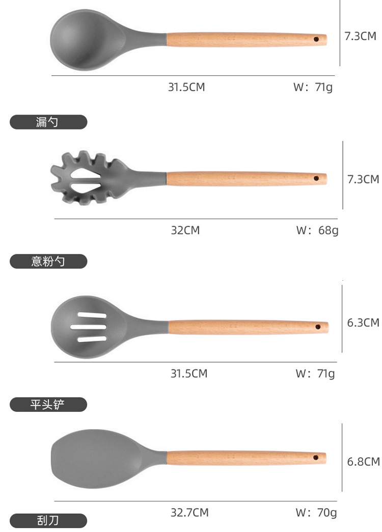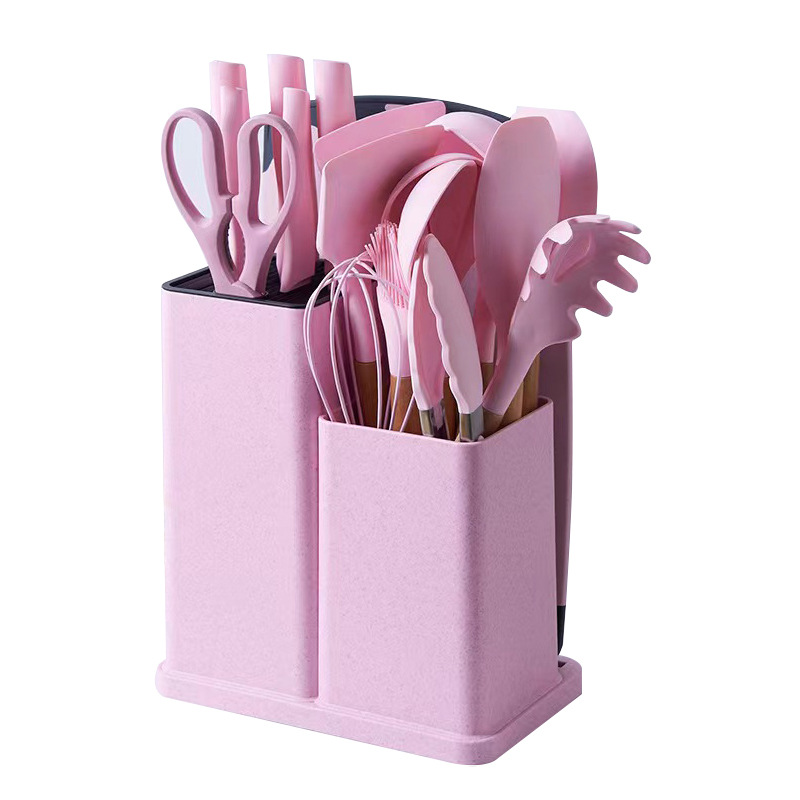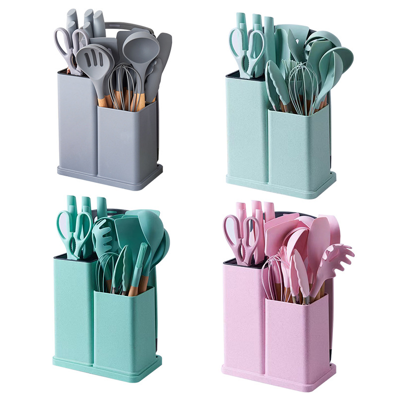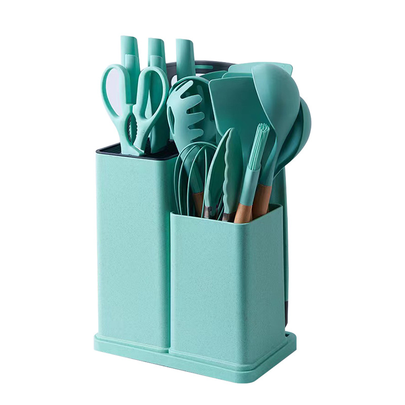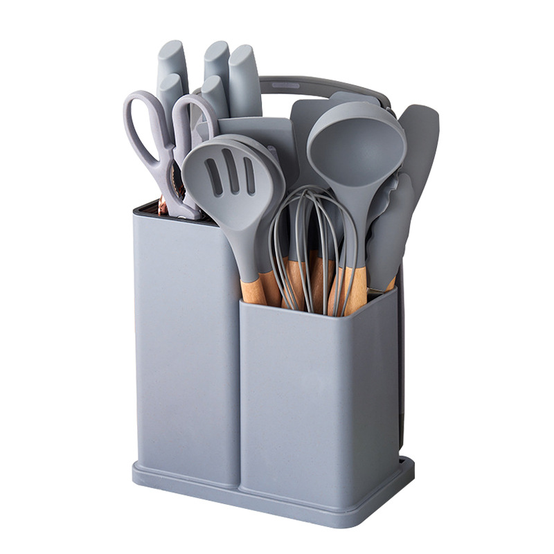 厂家现货厨具批发彩盒刀剪砧板锅铲勺子19件套木柄硅胶厨具套装