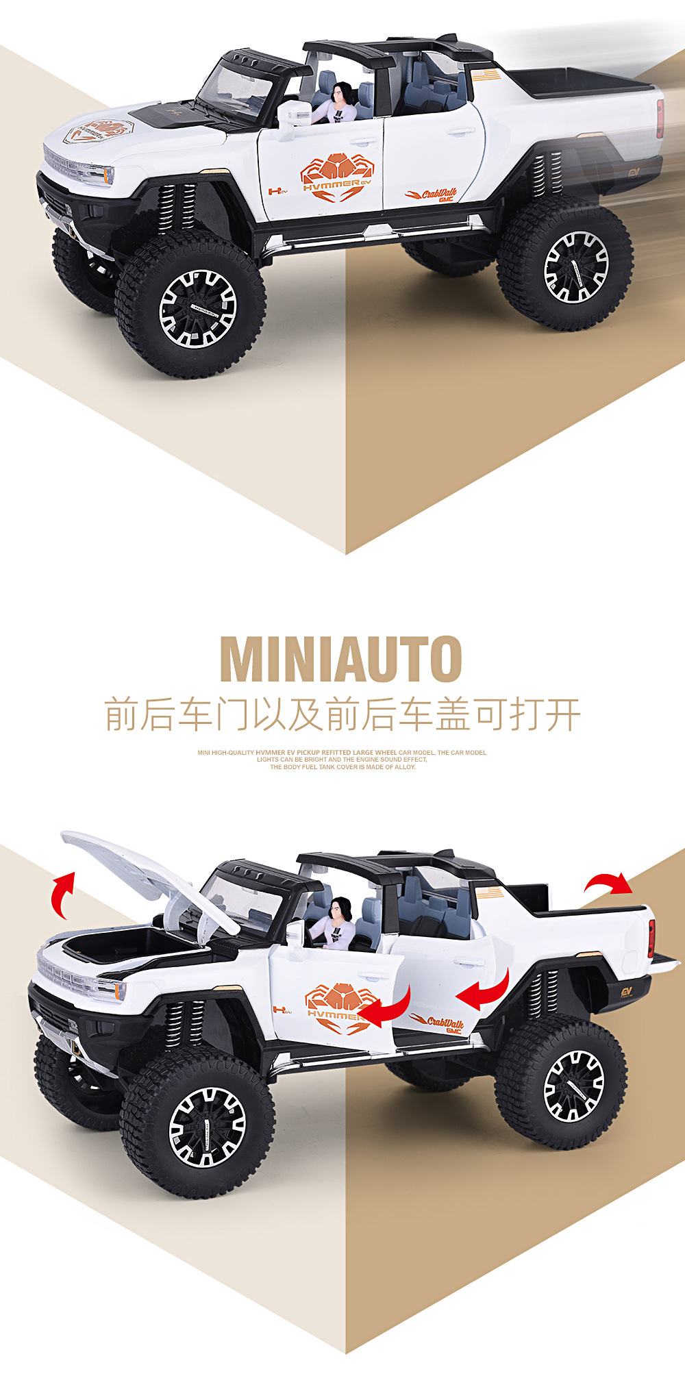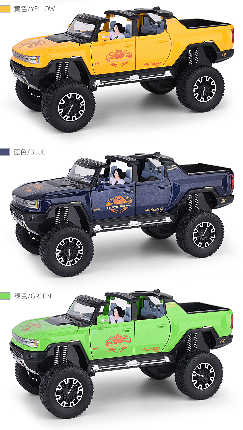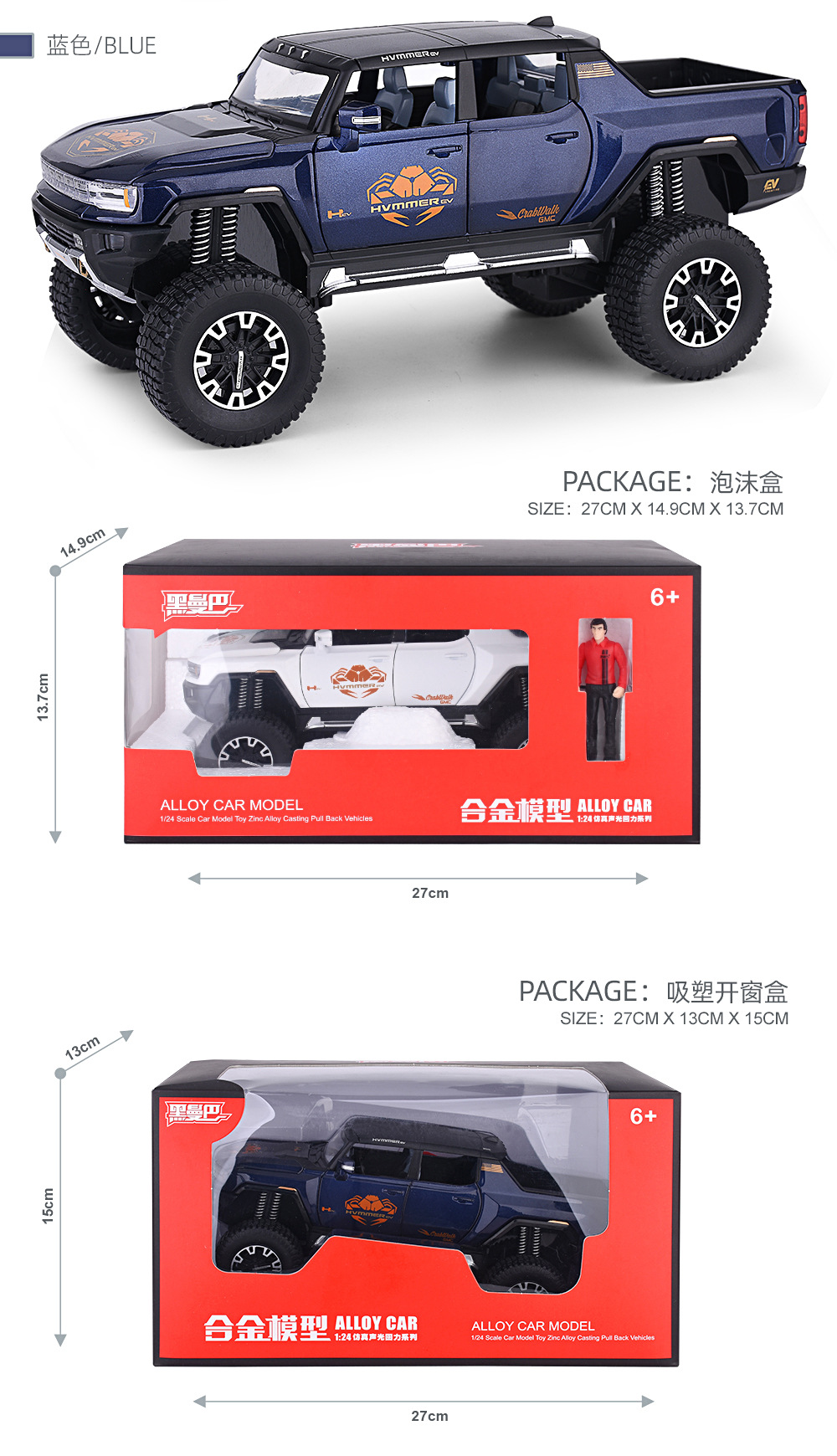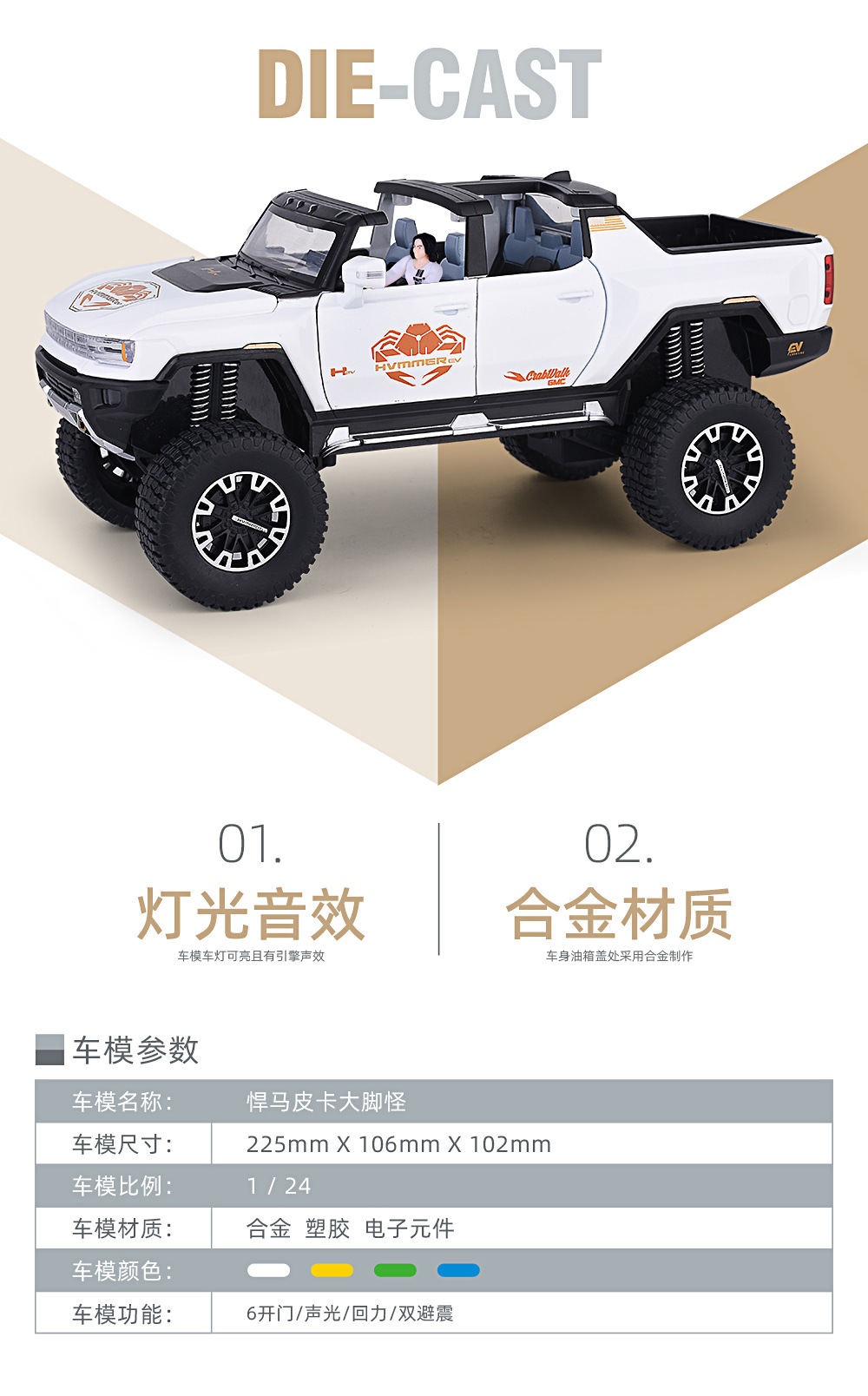 1:24大轮悍马SUV越野车密蓬或敞篷回力声光模型合金玩具仿真车模