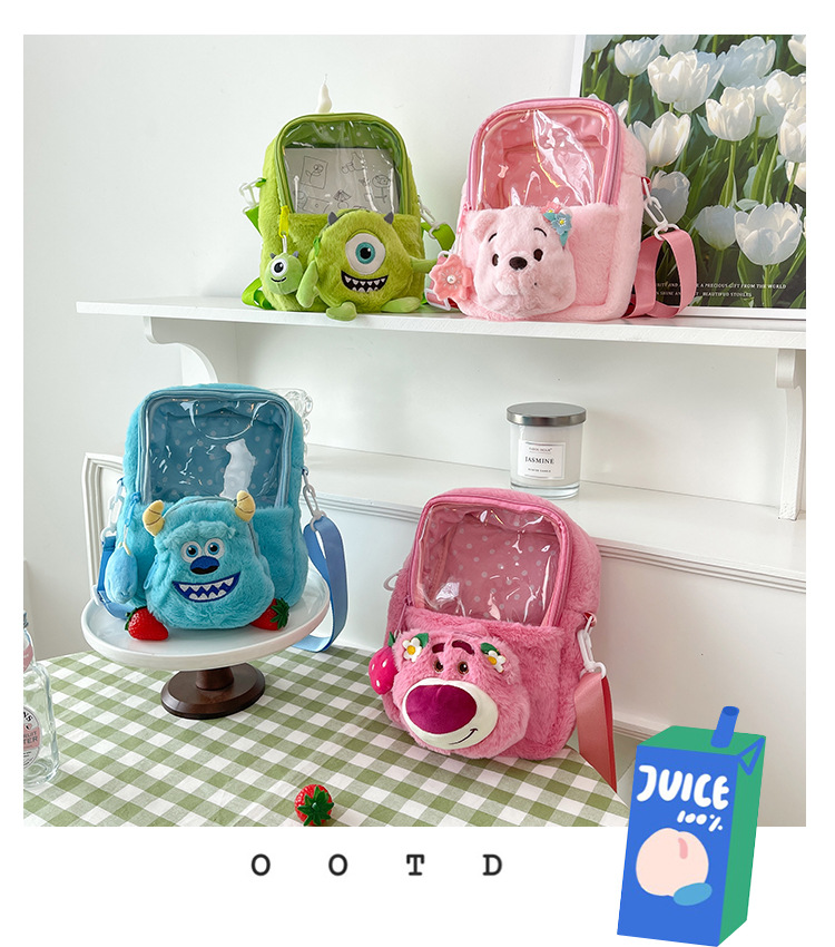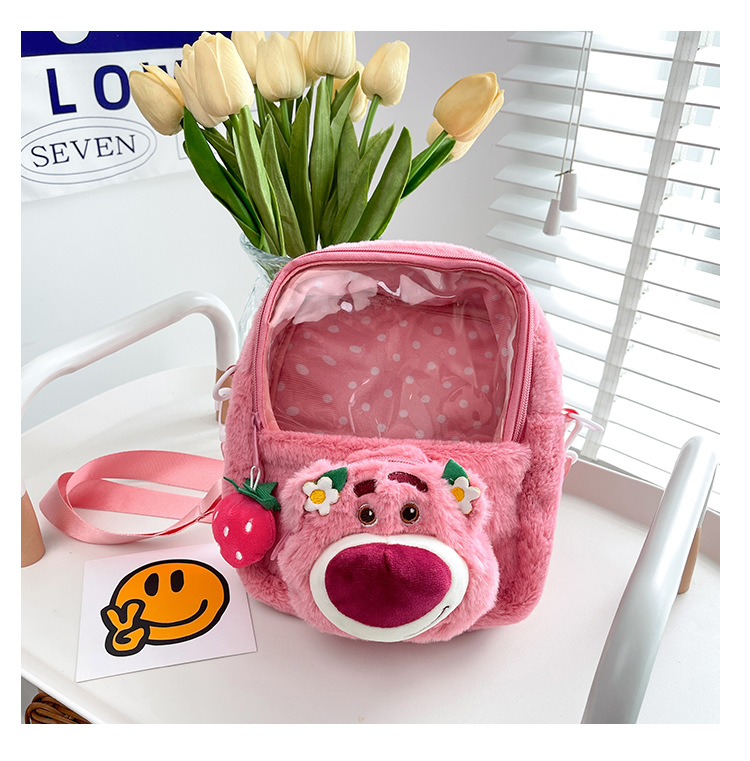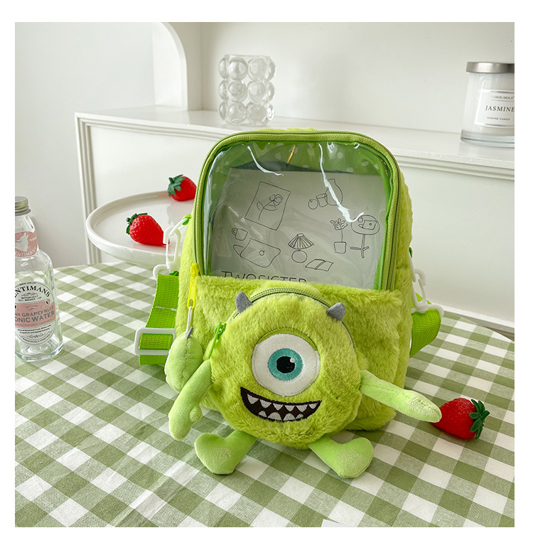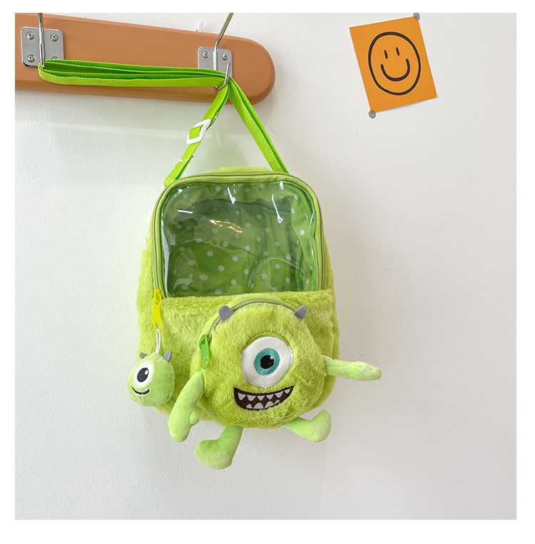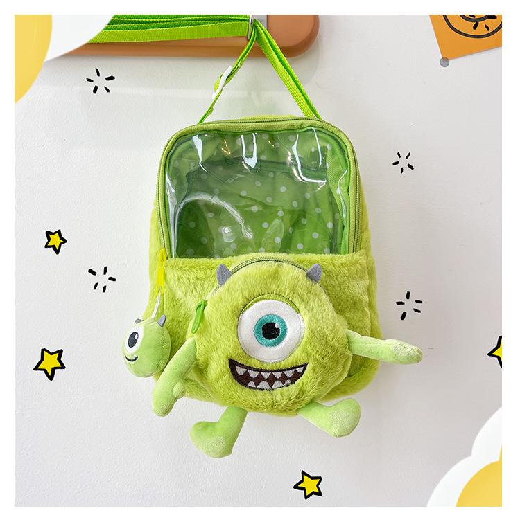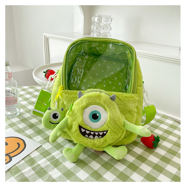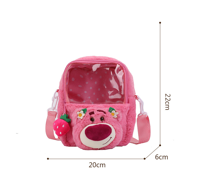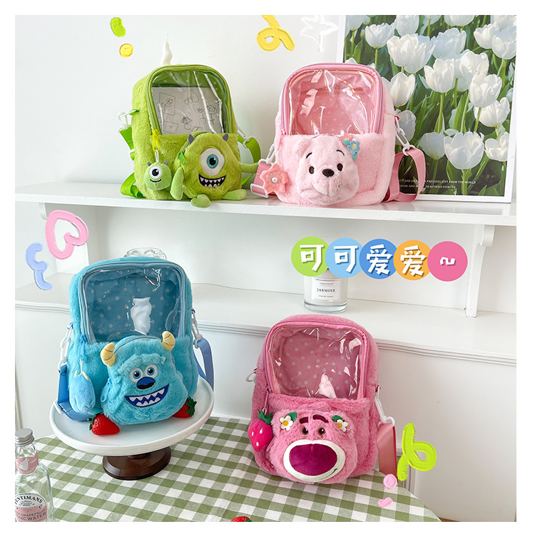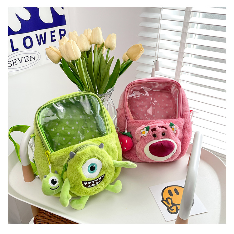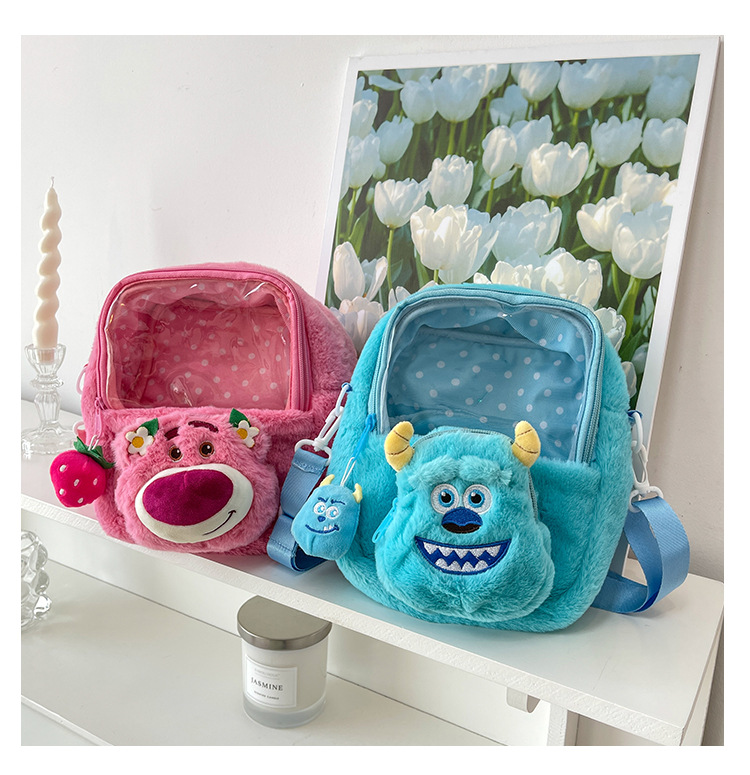 外贸草莓熊毛绒玩具批发卡通可爱透明斜挎包大眼怪苏利文晒娃痛包