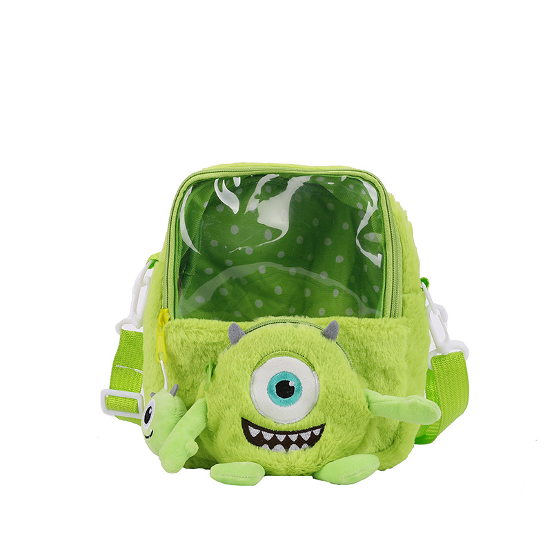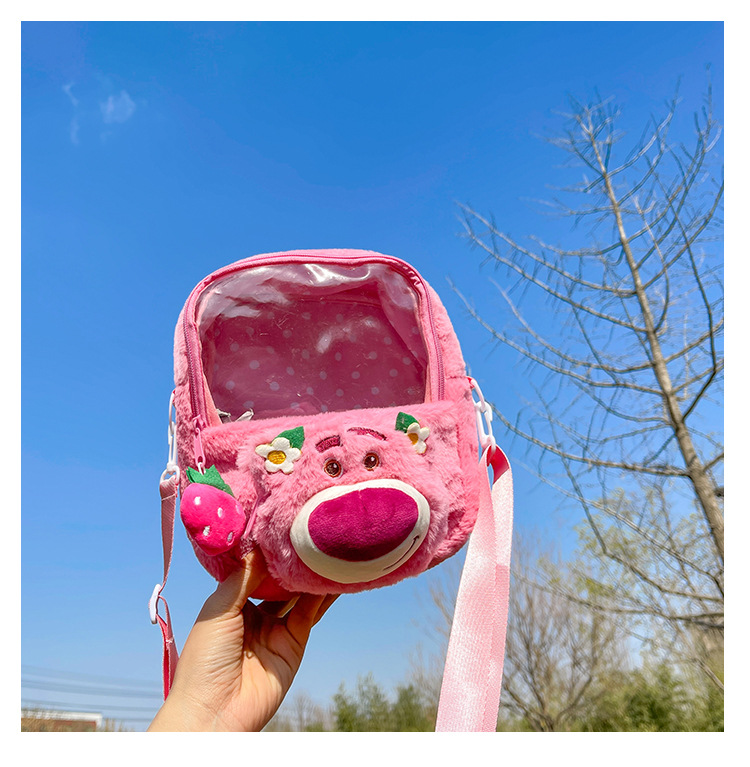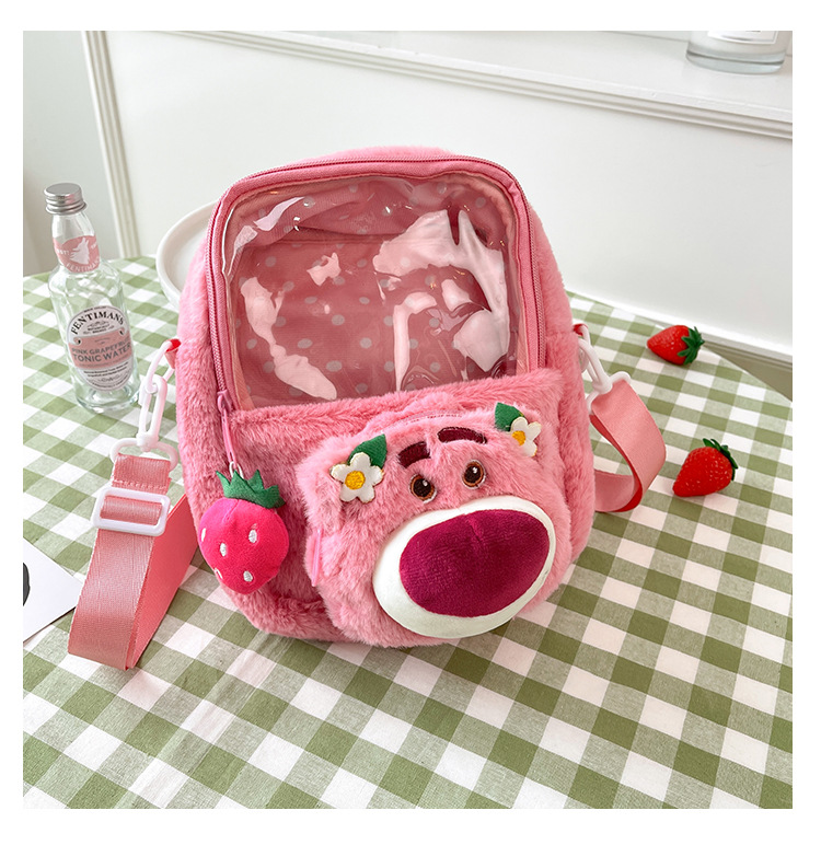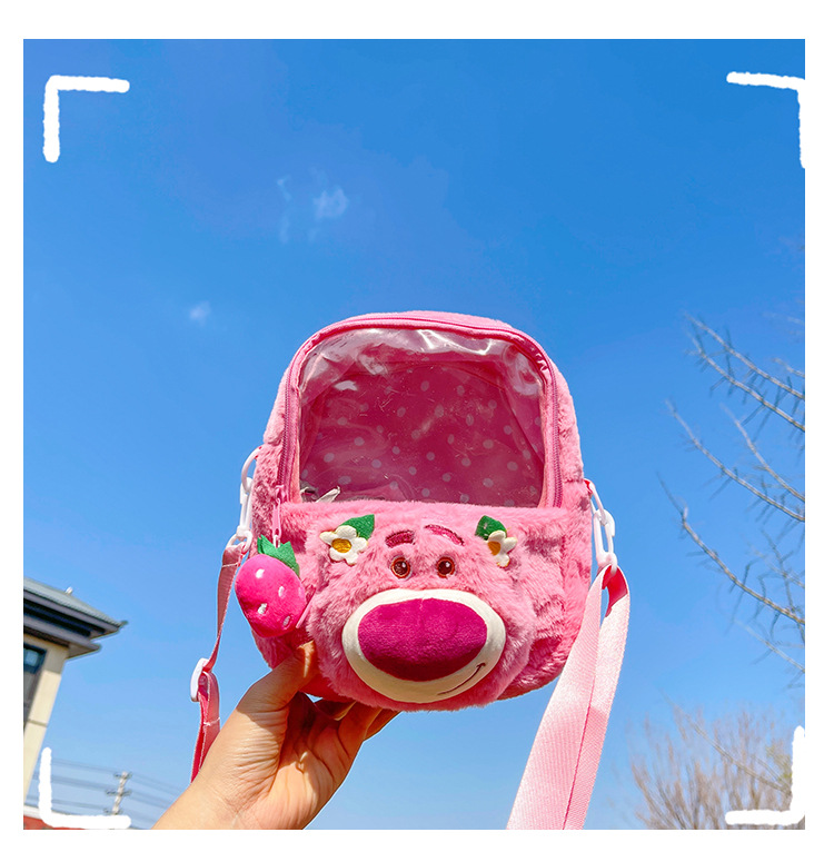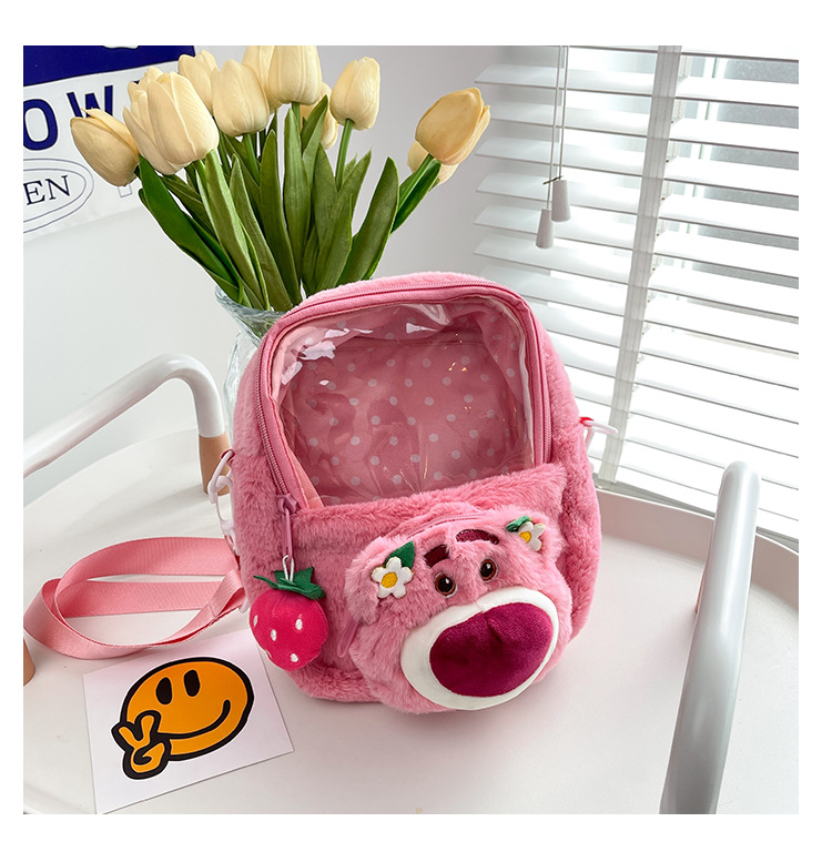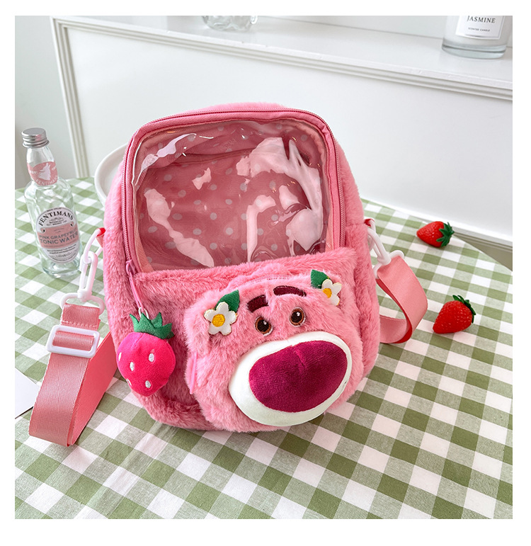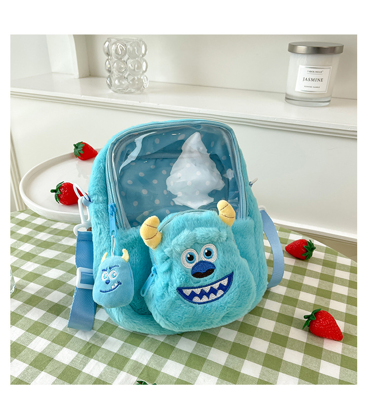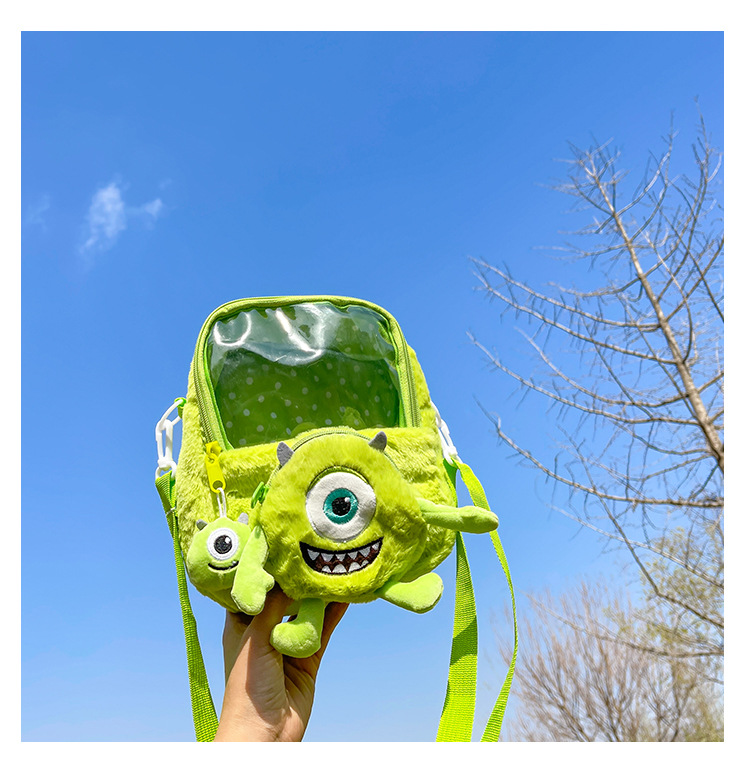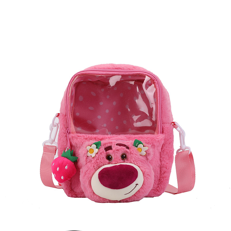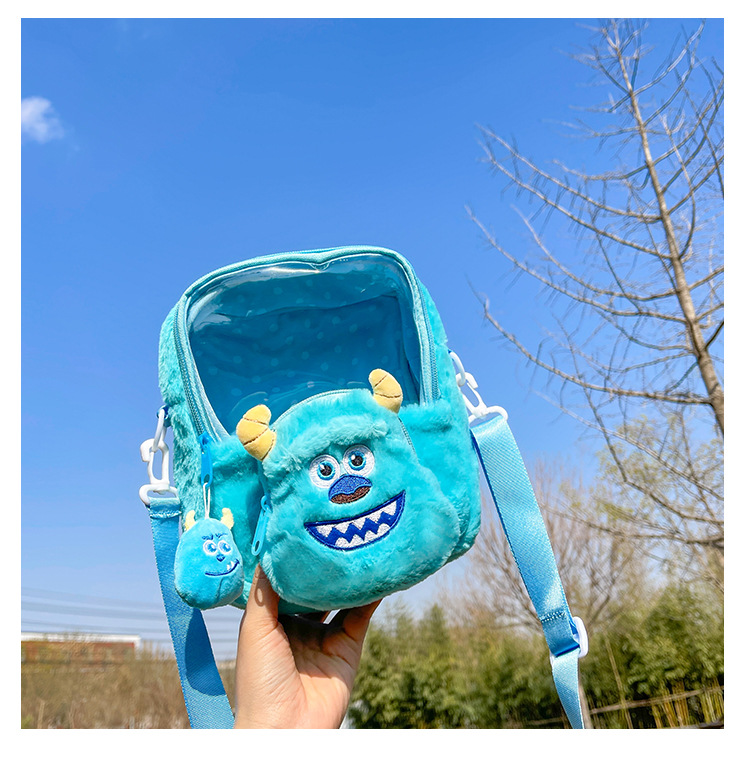 外贸草莓熊毛绒玩具批发卡通可爱透明斜挎包大眼怪苏利文晒娃痛包