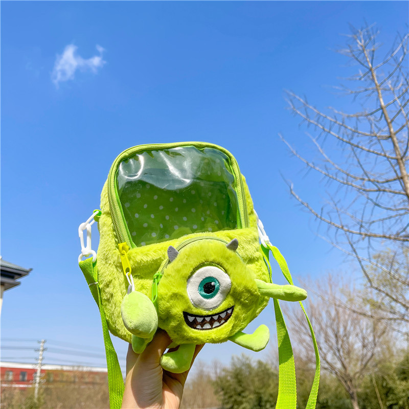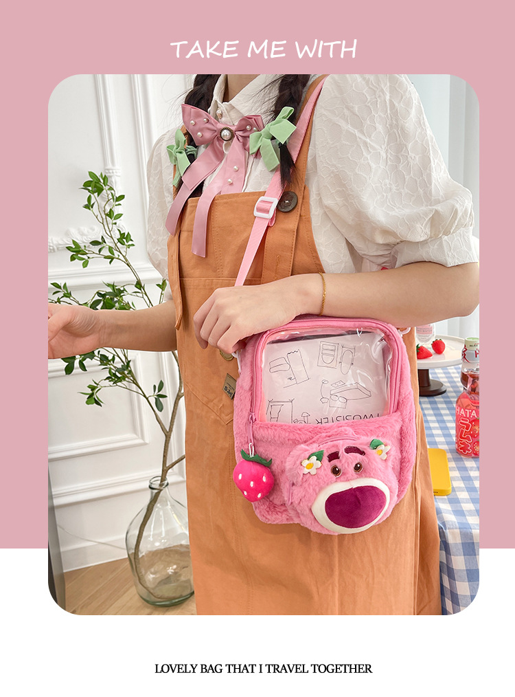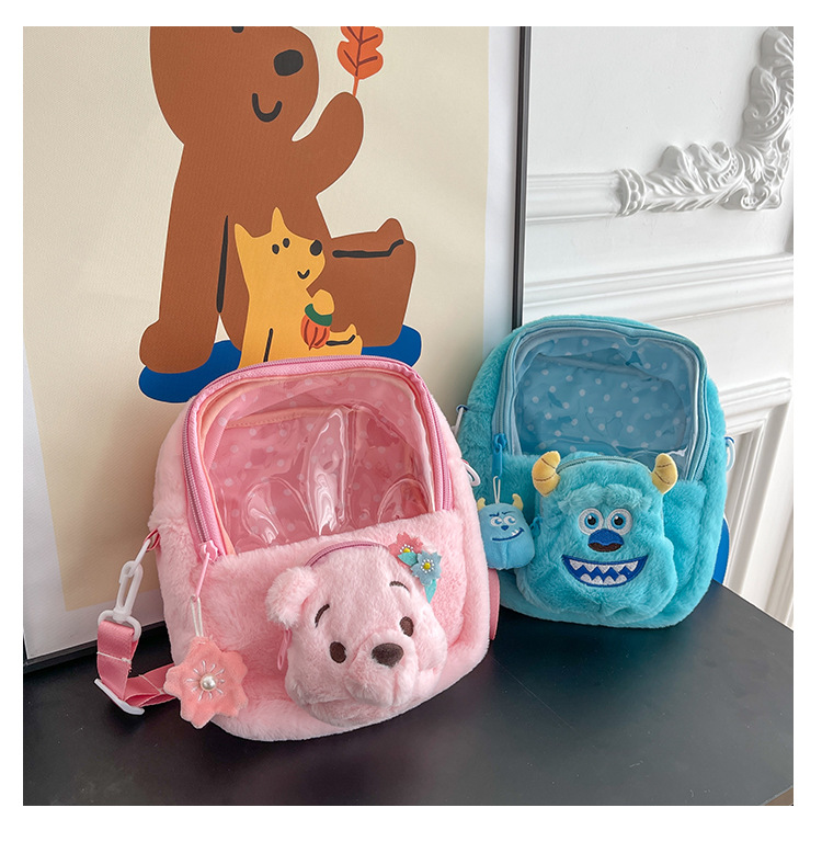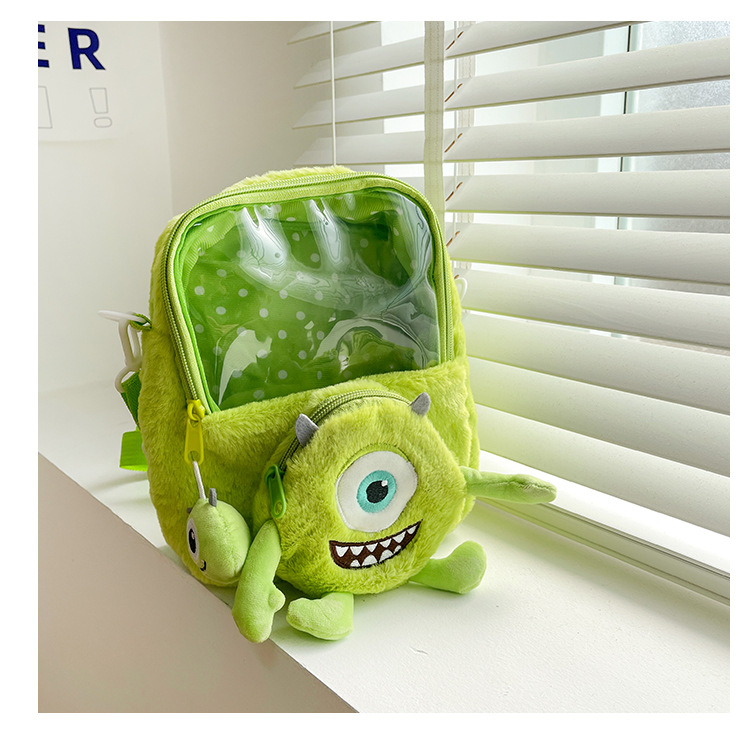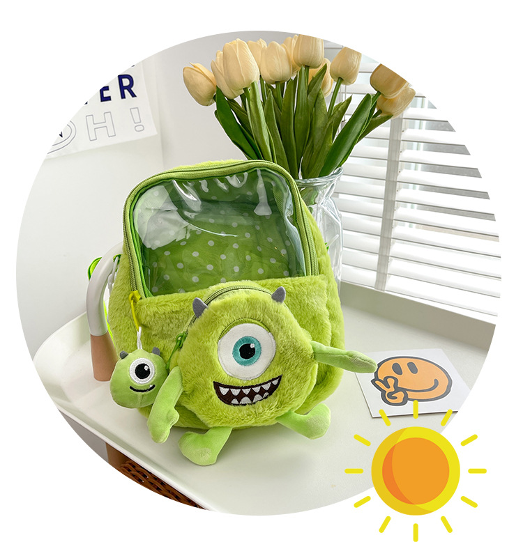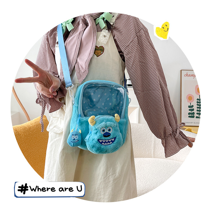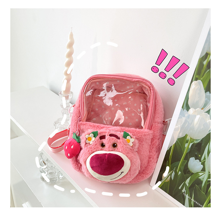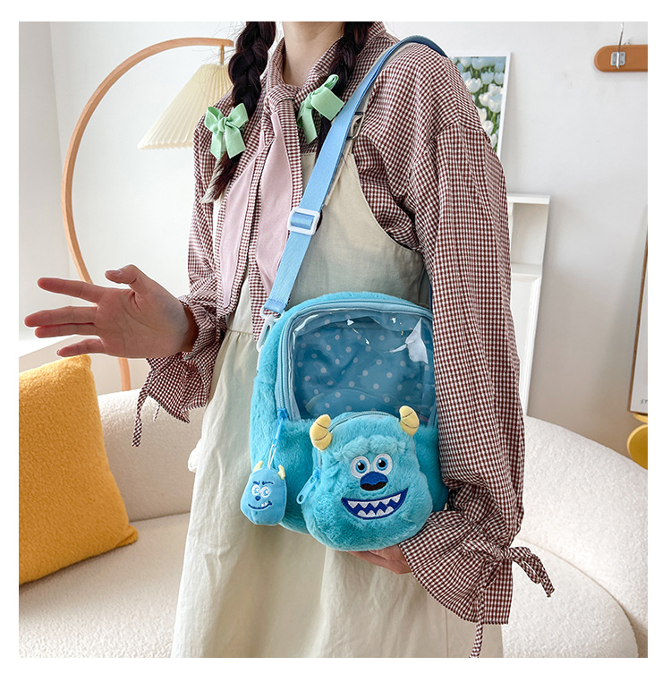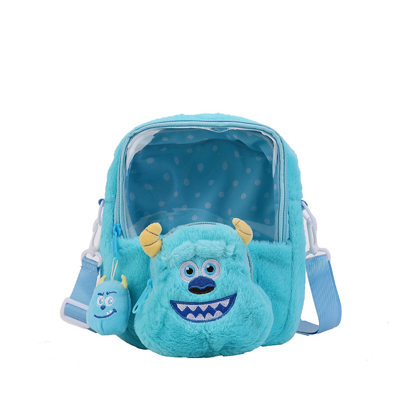 外贸草莓熊毛绒玩具批发卡通可爱透明斜挎包大眼怪苏利文晒娃痛包