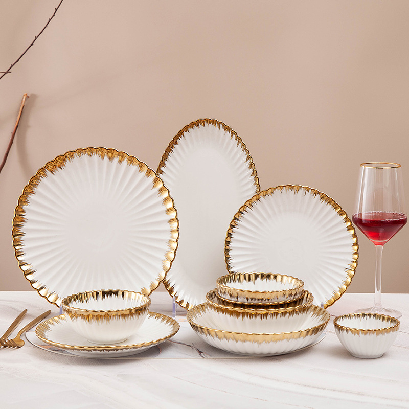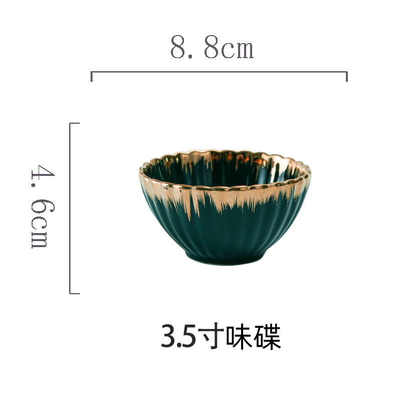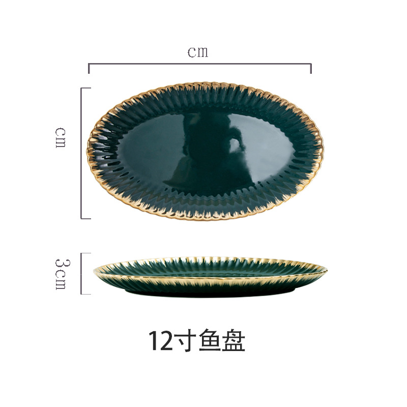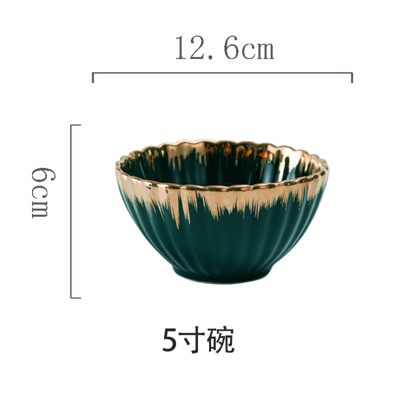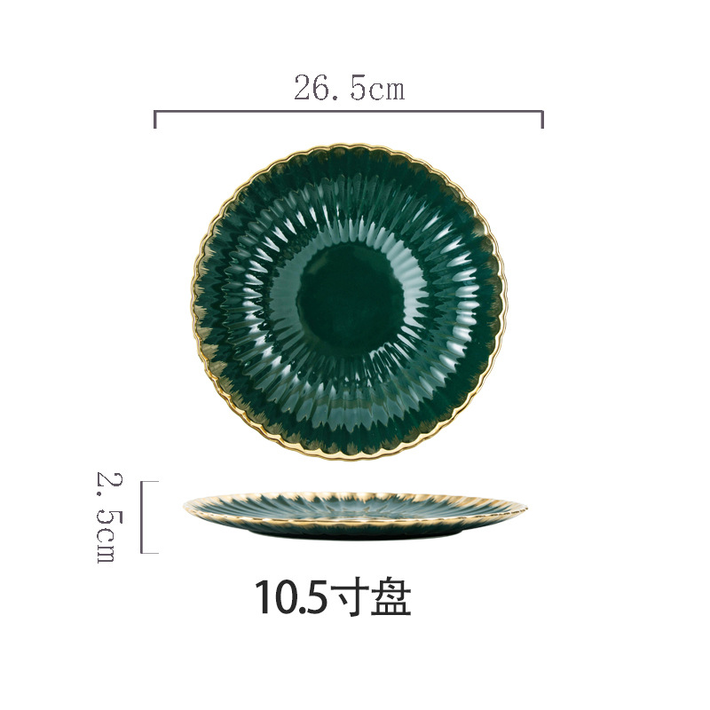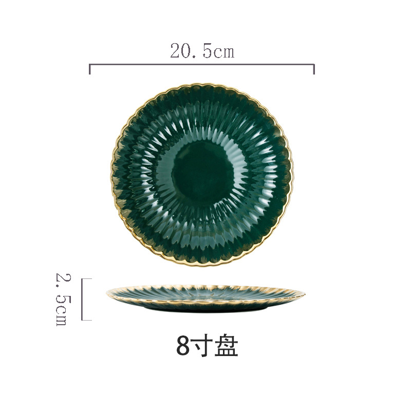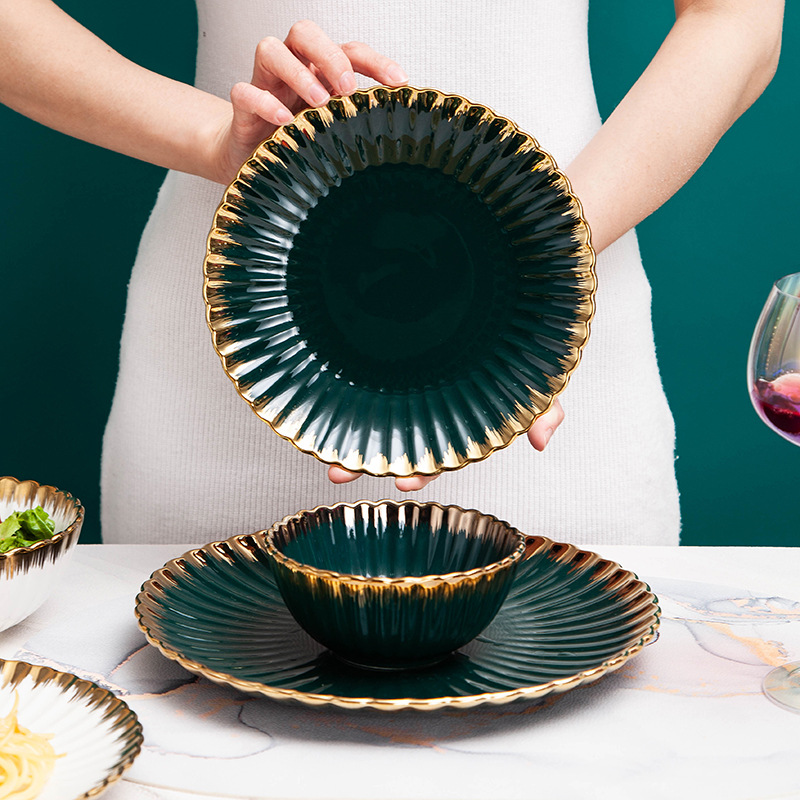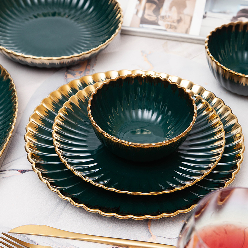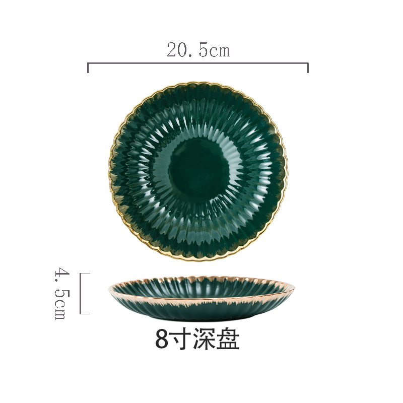 餐具北欧花边菊花陶瓷餐具墨绿色描金边组合餐具餐盘碗盘汤饭碗